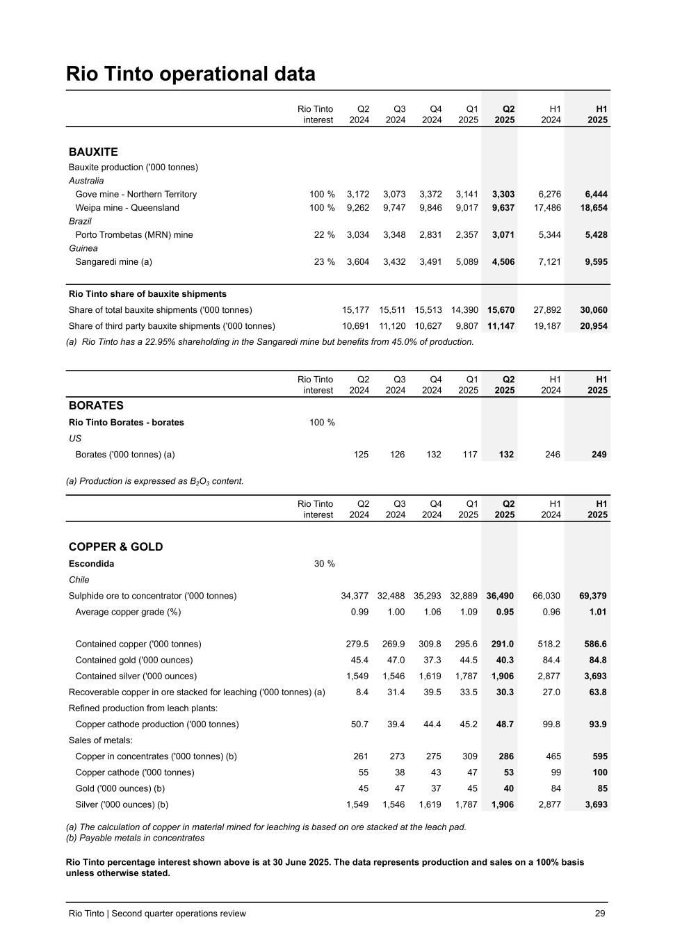 Rio Tinto operational data Rio Tinto interest Q2 2024 Q3 2024 Q4 2024 Q1 2025 Q2 2025 H1 2024 H1 2025 BAUXITE Bauxite production ('000 tonnes) Australia Gove mine - Northern Territory 100 % 3,172 3,073 3,372 3,141 3,303 6,276 6,444 Weipa mine - Queensland 100 % 9,262 9,747 9,846 9,017 9,637 17,486 18,654 Brazil Porto Trombetas (MRN) mine 22 % 3,034 3,348 2,831 2,357 3,071 5,344 5,428 Guinea Sangaredi mine (a) 23 % 3,604 3,432 3,491 5,089 4,506 7,121 9,595 Rio Tinto share of bauxite shipments Share of total bauxite shipments ('000 tonnes) 15,177 15,511 15,513 14,390 15,670 27,892 30,060 Share of third party bauxite shipments ('000 tonnes) 10,691 11,120 10,627 9,807 11,147 19,187 20,954 (a) Rio Tinto has a 22.95% shareholding in the Sangaredi mine but benefits from 45.0% of production. Rio Tinto interest Q2 2024 Q3 2024 Q4 2024 Q1 2025 Q2 2025 H1 2024 H1 2025 BORATES Rio Tinto Borates - borates 100 % US Borates ('000 tonnes) (a) 125 126 132 117 132 246 249 (a) Production is expressed as B2O3 content. Rio Tinto interest Q2 2024 Q3 2024 Q4 2024 Q1 2025 Q2 2025 H1 2024 H1 2025 COPPER & GOLD Escondida 30 % Chile Sulphide ore to concentrator ('000 tonnes) 34,377 32,488 35,293 32,889 36,490 66,030 69,379 Average copper grade (%) 0.99 1.00 1.06 1.09 0.95 0.96 1.01 Contained copper ('000 tonnes) 279.5 269.9 309.8 295.6 291.0 518.2 586.6 Contained gold ('000 ounces) 45.4 47.0 37.3 44.5 40.3 84.4 84.8 Contained silver ('000 ounces) 1,549 1,546 1,619 1,787 1,906 2,877 3,693 Recoverable copper in ore stacked for leaching ('000 tonnes) (a) 8.4 31.4 39.5 33.5 30.3 27.0 63.8 Refined production from leach plants: Copper cathode production ('000 tonnes) 50.7 39.4 44.4 45.2 48.7 99.8 93.9 Sales of metals: Copper in concentrates ('000 tonnes) (b) 261 273 275 309 286 465 595 Copper cathode ('000 tonnes) 55 38 43 47 53 99 100 Gold ('000 ounces) (b) 45 47 37 45 40 84 85 Silver ('000 ounces) (b) 1,549 1,546 1,619 1,787 1,906 2,877 3,693 (a) The calculation of copper in material mined for leaching is based on ore stacked at the leach pad. (b) Payable metals in concentrates Rio Tinto percentage interest shown above is at 30 June 2025. The data represents production and sales on a 100% basis unless otherwise stated. Rio Tinto | Second quarter operations review 29