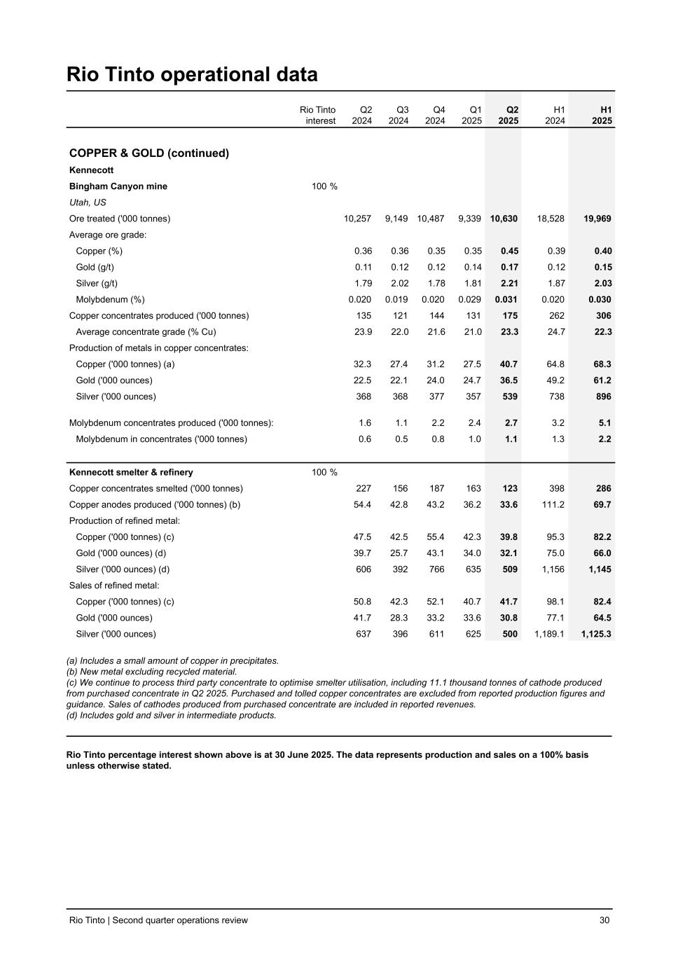 Rio Tinto operational data Rio Tinto interest Q2 2024 Q3 2024 Q4 2024 Q1 2025 Q2 2025 H1 2024 H1 2025 COPPER & GOLD (continued) Kennecott Bingham Canyon mine 100 % Utah, US Ore treated ('000 tonnes) 10,257 9,149 10,487 9,339 10,630 18,528 19,969 Average ore grade: Copper (%) 0.36 0.36 0.35 0.35 0.45 0.39 0.40 Gold (g/t) 0.11 0.12 0.12 0.14 0.17 0.12 0.15 Silver (g/t) 1.79 2.02 1.78 1.81 2.21 1.87 2.03 Molybdenum (%) 0.020 0.019 0.020 0.029 0.031 0.020 0.030 Copper concentrates produced ('000 tonnes) 135 121 144 131 175 262 306 Average concentrate grade (% Cu) 23.9 22.0 21.6 21.0 23.3 24.7 22.3 Production of metals in copper concentrates: Copper ('000 tonnes) (a) 32.3 27.4 31.2 27.5 40.7 64.8 68.3 Gold ('000 ounces) 22.5 22.1 24.0 24.7 36.5 49.2 61.2 Silver ('000 ounces) 368 368 377 357 539 738 896 Molybdenum concentrates produced ('000 tonnes): 1.6 1.1 2.2 2.4 2.7 3.2 5.1 Molybdenum in concentrates ('000 tonnes) 0.6 0.5 0.8 1.0 1.1 1.3 2.2 Kennecott smelter & refinery 100 % Copper concentrates smelted ('000 tonnes) 227 156 187 163 123 398 286 Copper anodes produced ('000 tonnes) (b) 54.4 42.8 43.2 36.2 33.6 111.2 69.7 Production of refined metal: Copper ('000 tonnes) (c) 47.5 42.5 55.4 42.3 39.8 95.3 82.2 Gold ('000 ounces) (d) 39.7 25.7 43.1 34.0 32.1 75.0 66.0 Silver ('000 ounces) (d) 606 392 766 635 509 1,156 1,145 Sales of refined metal: Copper ('000 tonnes) (c) 50.8 42.3 52.1 40.7 41.7 98.1 82.4 Gold ('000 ounces) 41.7 28.3 33.2 33.6 30.8 77.1 64.5 Silver ('000 ounces) 637 396 611 625 500 1,189.1 1,125.3 (a) Includes a small amount of copper in precipitates. (b) New metal excluding recycled material. (c) We continue to process third party concentrate to optimise smelter utilisation, including 11.1 thousand tonnes of cathode produced from purchased concentrate in Q2 2025. Purchased and tolled copper concentrates are excluded from reported production figures and guidance. Sales of cathodes produced from purchased concentrate are included in reported revenues. (d) Includes gold and silver in intermediate products. Rio Tinto percentage interest shown above is at 30 June 2025. The data represents production and sales on a 100% basis unless otherwise stated. Rio Tinto | Second quarter operations review 30
