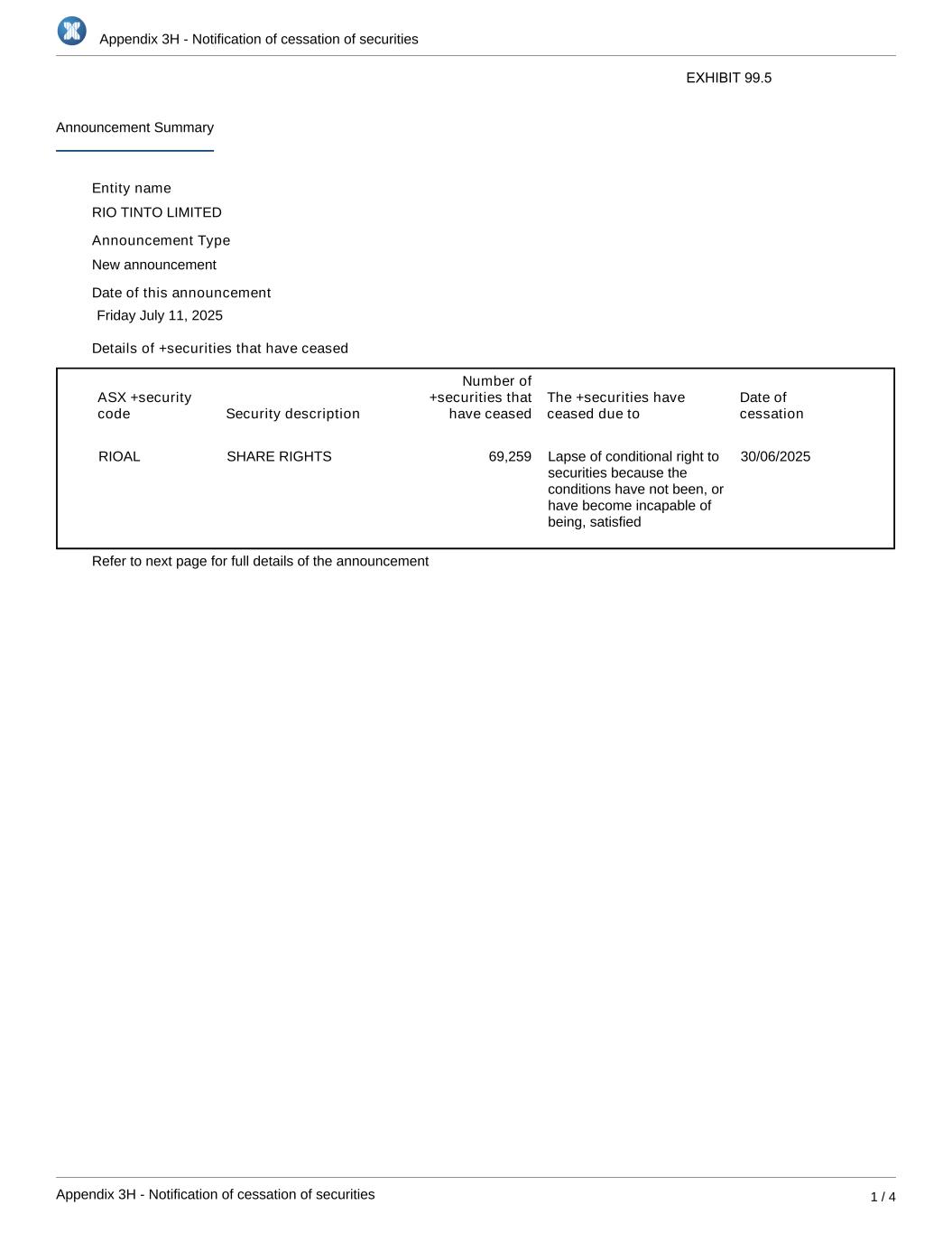 Appendix 3H - Notification of cessation of securities Appendix 3H - Notification of cessation of securities 1 / 4 Announcement Summary Entity name RIO TINTO LIMITED Announcement Type New announcement Date of this announcement Friday July 11, 2025 Details of +securities that have ceased ASX +security code Security description Number of +securities that have ceased The +securities have ceased due to Date of cessation RIOAL SHARE RIGHTS 69,259 Lapse of conditional right to securities because the conditions have not been, or have become incapable of being, satisfied 30/06/2025 Refer to next page for full details of the announcement EXHIBIT 99.5