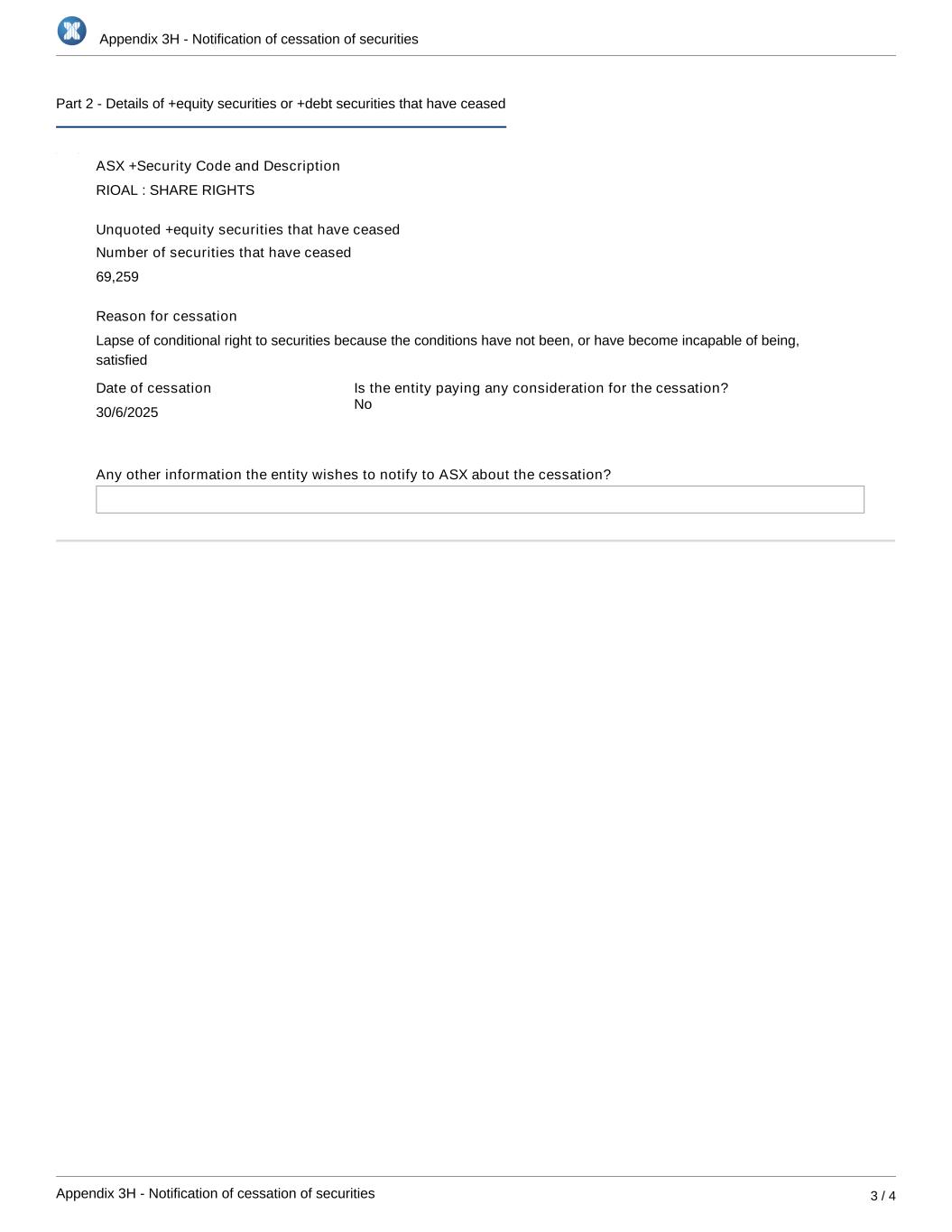 Appendix 3H - Notification of cessation of securities Appendix 3H - Notification of cessation of securities 3 / 4 Part 2 - Details of +equity securities or +debt securities that have ceased ASX +Security Code and Description RIOAL : SHARE RIGHTS Unquoted +equity securities that have ceased Number of securities that have ceased 69,259 Reason for cessation Lapse of conditional right to securities because the conditions have not been, or have become incapable of being, satisfied Date of cessation 30/6/2025 Is the entity paying any consideration for the cessation? Any other information the entity wishes to notify to ASX about the cessation? No