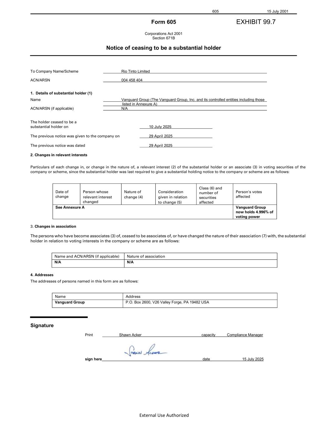 External Use Authorized 605 15 July 2001 Form 605 Corporations Act 2001 Section 671B Notice of ceasing to be a substantial holder To Company Name/Scheme Rio Tinto Limited ACN/ARSN 004 458 404 1. Details of substantial holder (1) Name Vanguard Group (The Vanguard Group, Inc. and its controlled entities including those listed in Annexure A) ACN/ARSN (if applicable) N/A The holder ceased to be a substantial holder on 10 July 2025 The previous notice was given to the company on 29 April 2025 The previous notice was dated 29 April 2025 2. Changes in relevant interests Particulars of each change in, or change in the nature of, a relevant interest (2) of the substantial holder or an associate (3) in voting securities of the company or scheme, since the substantial holder was last required to give a substantial holding notice to the company or scheme are as follows: Date of change Person whose relevant interest changed Nature of change (4) Consideration given in relation to change (5) Class (6) and number of securities affected Person's votes affected See Annexure A Vanguard Group now holds 4.996% of voting power 3. Changes in association The persons who have become associates (3) of, ceased to be associates of, or have changed the nature of their association (7) with, the substantial holder in relation to voting interests in the company or scheme are as follows: Name and ACN/ARSN (if applicable) Nature of association N/A N/A 4. Addresses The addresses of persons named in this form are as follows: Name Address Vanguard Group P.O. Box 2600, V26 Valley Forge, PA 19482 USA Signature Print ________Shawn Acker capacity Compliance Manager sign here date 15 July 2025 EXHIBIT 99.7