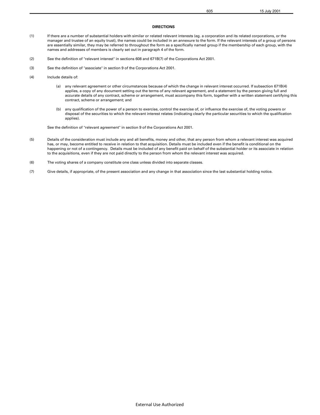 External Use Authorized 605 15 July 2001 DIRECTIONS (1) If there are a number of substantial holders with similar or related relevant interests (eg. a corporation and its related corporations, or the manager and trustee of an equity trust), the names could be included in an annexure to the form. If the relevant interests of a group of persons are essentially similar, they may be referred to throughout the form as a specifically named group if the membership of each group, with the names and addresses of members is clearly set out in paragraph 4 of the form. (2) See the definition of "relevant interest" in sections 608 and 671B(7) of the Corporations Act 2001. (3) See the definition of "associate" in section 9 of the Corporations Act 2001. (4) Include details of: (a) any relevant agreement or other circumstances because of which the change in relevant interest occurred. If subsection 671B(4) applies, a copy of any document setting out the terms of any relevant agreement, and a statement by the person giving full and accurate details of any contract, scheme or arrangement, must accompany this form, together with a written statement certifying this contract, scheme or arrangement; and (b) any qualification of the power of a person to exercise, control the exercise of, or influence the exercise of, the voting powers or disposal of the securities to which the relevant interest relates (indicating clearly the particular securities to which the qualification applies). See the definition of "relevant agreement" in section 9 of the Corporations Act 2001. (5) Details of the consideration must include any and all benefits, money and other, that any person from whom a relevant interest was acquired has, or may, become entitled to receive in relation to that acquisition. Details must be included even if the benefit is conditional on the happening or not of a contingency. Details must be included of any benefit paid on behalf of the substantial holder or its associate in relation to the acquisitions, even if they are not paid directly to the person from whom the relevant interest was acquired. (6) The voting shares of a company constitute one class unless divided into separate classes. (7) Give details, if appropriate, of the present association and any change in that association since the last substantial holding notice.