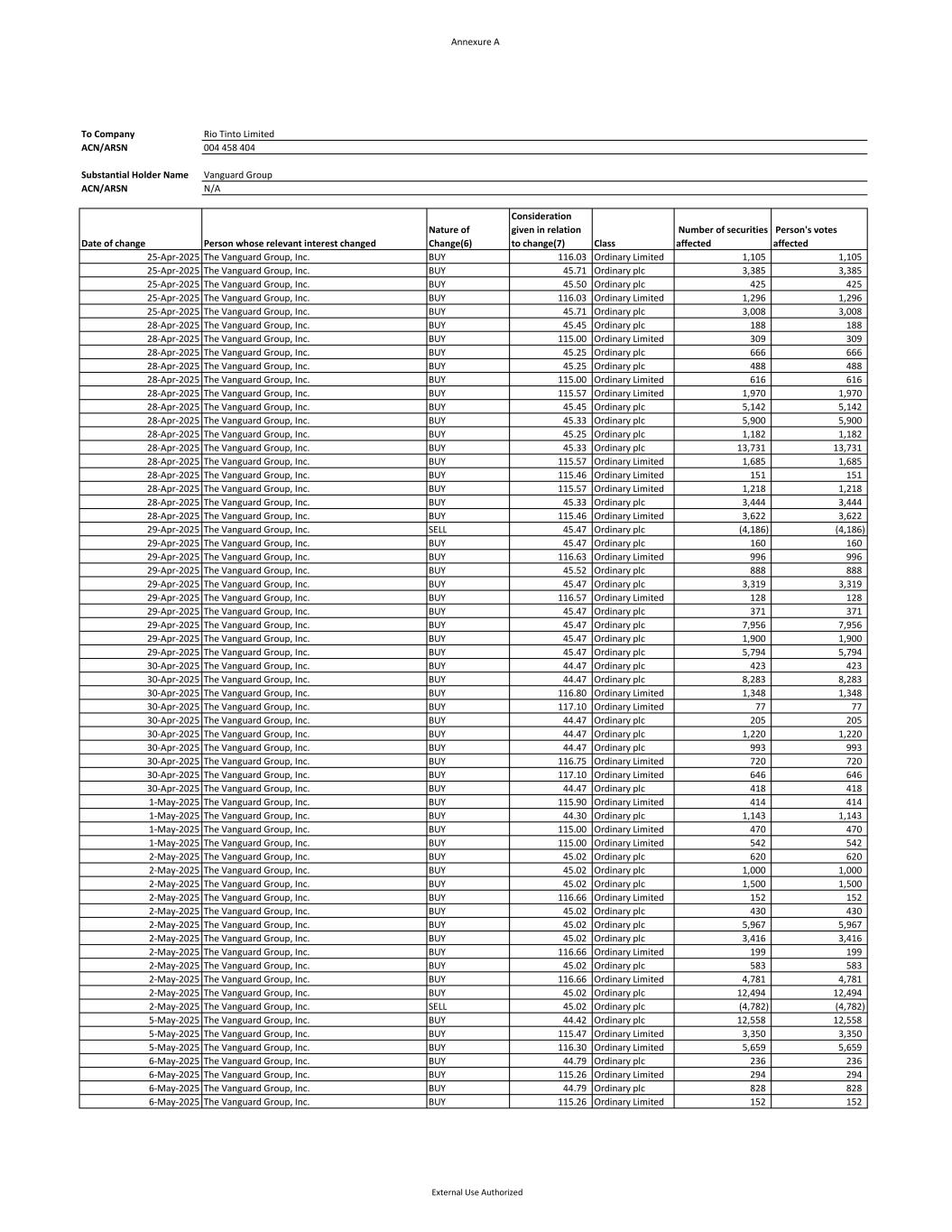Annexure A To Company Rio Tinto Limited ACN/ARSN 004 458 404 Substantial Holder Name Vanguard Group ACN/ARSN N/A Date of change Person whose relevant interest changed Nature of Change(6) Consideration given in relation to change(7) Class Number of securities affected Person's votes affected 25-Apr-2025 The Vanguard Group, Inc. BUY 116.03 Ordinary Limited 1,105 1,105 25-Apr-2025 The Vanguard Group, Inc. BUY 45.71 Ordinary plc 3,385 3,385 25-Apr-2025 The Vanguard Group, Inc. BUY 45.50 Ordinary plc 425 425 25-Apr-2025 The Vanguard Group, Inc. BUY 116.03 Ordinary Limited 1,296 1,296 25-Apr-2025 The Vanguard Group, Inc. BUY 45.71 Ordinary plc 3,008 3,008 28-Apr-2025 The Vanguard Group, Inc. BUY 45.45 Ordinary plc 188 188 28-Apr-2025 The Vanguard Group, Inc. BUY 115.00 Ordinary Limited 309 309 28-Apr-2025 The Vanguard Group, Inc. BUY 45.25 Ordinary plc 666 666 28-Apr-2025 The Vanguard Group, Inc. BUY 45.25 Ordinary plc 488 488 28-Apr-2025 The Vanguard Group, Inc. BUY 115.00 Ordinary Limited 616 616 28-Apr-2025 The Vanguard Group, Inc. BUY 115.57 Ordinary Limited 1,970 1,970 28-Apr-2025 The Vanguard Group, Inc. BUY 45.45 Ordinary plc 5,142 5,142 28-Apr-2025 The Vanguard Group, Inc. BUY 45.33 Ordinary plc 5,900 5,900 28-Apr-2025 The Vanguard Group, Inc. BUY 45.25 Ordinary plc 1,182 1,182 28-Apr-2025 The Vanguard Group, Inc. BUY 45.33 Ordinary plc 13,731 13,731 28-Apr-2025 The Vanguard Group, Inc. BUY 115.57 Ordinary Limited 1,685 1,685 28-Apr-2025 The Vanguard Group, Inc. BUY 115.46 Ordinary Limited 151 151 28-Apr-2025 The Vanguard Group, Inc. BUY 115.57 Ordinary Limited 1,218 1,218 28-Apr-2025 The Vanguard Group, Inc. BUY 45.33 Ordinary plc 3,444 3,444 28-Apr-2025 The Vanguard Group, Inc. BUY 115.46 Ordinary Limited 3,622 3,622 29-Apr-2025 The Vanguard Group, Inc. SELL 45.47 Ordinary plc (4,186) (4,186) 29-Apr-2025 The Vanguard Group, Inc. BUY 45.47 Ordinary plc 160 160 29-Apr-2025 The Vanguard Group, Inc. BUY 116.63 Ordinary Limited 996 996 29-Apr-2025 The Vanguard Group, Inc. BUY 45.52 Ordinary plc 888 888 29-Apr-2025 The Vanguard Group, Inc. BUY 45.47 Ordinary plc 3,319 3,319 29-Apr-2025 The Vanguard Group, Inc. BUY 116.57 Ordinary Limited 128 128 29-Apr-2025 The Vanguard Group, Inc. BUY 45.47 Ordinary plc 371 371 29-Apr-2025 The Vanguard Group, Inc. BUY 45.47 Ordinary plc 7,956 7,956 29-Apr-2025 The Vanguard Group, Inc. BUY 45.47 Ordinary plc 1,900 1,900 29-Apr-2025 The Vanguard Group, Inc. BUY 45.47 Ordinary plc 5,794 5,794 30-Apr-2025 The Vanguard Group, Inc. BUY 44.47 Ordinary plc 423 423 30-Apr-2025 The Vanguard Group, Inc. BUY 44.47 Ordinary plc 8,283 8,283 30-Apr-2025 The Vanguard Group, Inc. BUY 116.80 Ordinary Limited 1,348 1,348 30-Apr-2025 The Vanguard Group, Inc. BUY 117.10 Ordinary Limited 77 77 30-Apr-2025 The Vanguard Group, Inc. BUY 44.47 Ordinary plc 205 205 30-Apr-2025 The Vanguard Group, Inc. BUY 44.47 Ordinary plc 1,220 1,220 30-Apr-2025 The Vanguard Group, Inc. BUY 44.47 Ordinary plc 993 993 30-Apr-2025 The Vanguard Group, Inc. BUY 116.75 Ordinary Limited 720 720 30-Apr-2025 The Vanguard Group, Inc. BUY 117.10 Ordinary Limited 646 646 30-Apr-2025 The Vanguard Group, Inc. BUY 44.47 Ordinary plc 418 418 1-May-2025 The Vanguard Group, Inc. BUY 115.90 Ordinary Limited 414 414 1-May-2025 The Vanguard Group, Inc. BUY 44.30 Ordinary plc 1,143 1,143 1-May-2025 The Vanguard Group, Inc. BUY 115.00 Ordinary Limited 470 470 1-May-2025 The Vanguard Group, Inc. BUY 115.00 Ordinary Limited 542 542 2-May-2025 The Vanguard Group, Inc. BUY 45.02 Ordinary plc 620 620 2-May-2025 The Vanguard Group, Inc. BUY 45.02 Ordinary plc 1,000 1,000 2-May-2025 The Vanguard Group, Inc. BUY 45.02 Ordinary plc 1,500 1,500 2-May-2025 The Vanguard Group, Inc. BUY 116.66 Ordinary Limited 152 152 2-May-2025 The Vanguard Group, Inc. BUY 45.02 Ordinary plc 430 430 2-May-2025 The Vanguard Group, Inc. BUY 45.02 Ordinary plc 5,967 5,967 2-May-2025 The Vanguard Group, Inc. BUY 45.02 Ordinary plc 3,416 3,416 2-May-2025 The Vanguard Group, Inc. BUY 116.66 Ordinary Limited 199 199 2-May-2025 The Vanguard Group, Inc. BUY 45.02 Ordinary plc 583 583 2-May-2025 The Vanguard Group, Inc. BUY 116.66 Ordinary Limited 4,781 4,781 2-May-2025 The Vanguard Group, Inc. BUY 45.02 Ordinary plc 12,494 12,494 2-May-2025 The Vanguard Group, Inc. SELL 45.02 Ordinary plc (4,782) (4,782) 5-May-2025 The Vanguard Group, Inc. BUY 44.42 Ordinary plc 12,558 12,558 5-May-2025 The Vanguard Group, Inc. BUY 115.47 Ordinary Limited 3,350 3,350 5-May-2025 The Vanguard Group, Inc. BUY 116.30 Ordinary Limited 5,659 5,659 6-May-2025 The Vanguard Group, Inc. BUY 44.79 Ordinary plc 236 236 6-May-2025 The Vanguard Group, Inc. BUY 115.26 Ordinary Limited 294 294 6-May-2025 The Vanguard Group, Inc. BUY 44.79 Ordinary plc 828 828 6-May-2025 The Vanguard Group, Inc. BUY 115.26 Ordinary Limited 152 152 # External Use Authorized