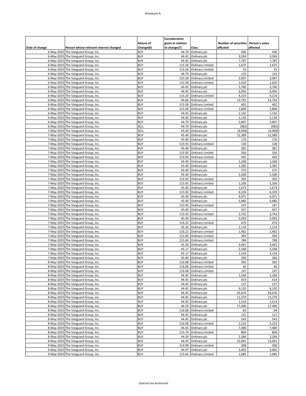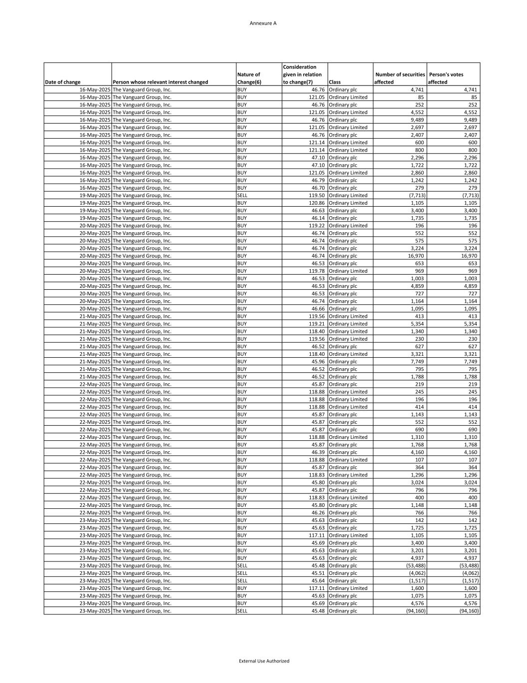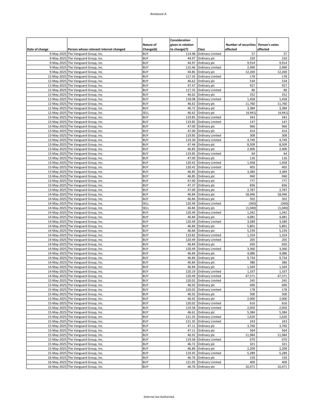 Annexure A Date of change Person whose relevant interest changed Nature of Change(6) Consideration given in relation to change(7) Class Number of securities affected Person's votes affected 16-May-2025 The Vanguard Group, Inc. BUY 46.76 Ordinary plc 4,741 4,741 16-May-2025 The Vanguard Group, Inc. BUY 121.05 Ordinary Limited 85 85 16-May-2025 The Vanguard Group, Inc. BUY 46.76 Ordinary plc 252 252 16-May-2025 The Vanguard Group, Inc. BUY 121.05 Ordinary Limited 4,552 4,552 16-May-2025 The Vanguard Group, Inc. BUY 46.76 Ordinary plc 9,489 9,489 16-May-2025 The Vanguard Group, Inc. BUY 121.05 Ordinary Limited 2,697 2,697 16-May-2025 The Vanguard Group, Inc. BUY 46.76 Ordinary plc 2,407 2,407 16-May-2025 The Vanguard Group, Inc. BUY 121.14 Ordinary Limited 600 600 16-May-2025 The Vanguard Group, Inc. BUY 121.14 Ordinary Limited 800 800 16-May-2025 The Vanguard Group, Inc. BUY 47.10 Ordinary plc 2,296 2,296 16-May-2025 The Vanguard Group, Inc. BUY 47.10 Ordinary plc 1,722 1,722 16-May-2025 The Vanguard Group, Inc. BUY 121.05 Ordinary Limited 2,860 2,860 16-May-2025 The Vanguard Group, Inc. BUY 46.79 Ordinary plc 1,242 1,242 16-May-2025 The Vanguard Group, Inc. BUY 46.70 Ordinary plc 279 279 19-May-2025 The Vanguard Group, Inc. SELL 119.50 Ordinary Limited (7,713) (7,713) 19-May-2025 The Vanguard Group, Inc. BUY 120.86 Ordinary Limited 1,105 1,105 19-May-2025 The Vanguard Group, Inc. BUY 46.63 Ordinary plc 3,400 3,400 19-May-2025 The Vanguard Group, Inc. BUY 46.14 Ordinary plc 1,735 1,735 20-May-2025 The Vanguard Group, Inc. BUY 119.22 Ordinary Limited 196 196 20-May-2025 The Vanguard Group, Inc. BUY 46.74 Ordinary plc 552 552 20-May-2025 The Vanguard Group, Inc. BUY 46.74 Ordinary plc 575 575 20-May-2025 The Vanguard Group, Inc. BUY 46.74 Ordinary plc 3,224 3,224 20-May-2025 The Vanguard Group, Inc. BUY 46.74 Ordinary plc 16,970 16,970 20-May-2025 The Vanguard Group, Inc. BUY 46.53 Ordinary plc 653 653 20-May-2025 The Vanguard Group, Inc. BUY 119.78 Ordinary Limited 969 969 20-May-2025 The Vanguard Group, Inc. BUY 46.53 Ordinary plc 1,003 1,003 20-May-2025 The Vanguard Group, Inc. BUY 46.53 Ordinary plc 4,859 4,859 20-May-2025 The Vanguard Group, Inc. BUY 46.53 Ordinary plc 727 727 20-May-2025 The Vanguard Group, Inc. BUY 46.74 Ordinary plc 1,164 1,164 20-May-2025 The Vanguard Group, Inc. BUY 46.66 Ordinary plc 1,095 1,095 21-May-2025 The Vanguard Group, Inc. BUY 119.56 Ordinary Limited 413 413 21-May-2025 The Vanguard Group, Inc. BUY 119.21 Ordinary Limited 5,354 5,354 21-May-2025 The Vanguard Group, Inc. BUY 118.40 Ordinary Limited 1,340 1,340 21-May-2025 The Vanguard Group, Inc. BUY 119.56 Ordinary Limited 230 230 21-May-2025 The Vanguard Group, Inc. BUY 46.52 Ordinary plc 627 627 21-May-2025 The Vanguard Group, Inc. BUY 118.40 Ordinary Limited 3,321 3,321 21-May-2025 The Vanguard Group, Inc. BUY 45.96 Ordinary plc 7,749 7,749 21-May-2025 The Vanguard Group, Inc. BUY 46.52 Ordinary plc 795 795 21-May-2025 The Vanguard Group, Inc. BUY 46.52 Ordinary plc 1,788 1,788 22-May-2025 The Vanguard Group, Inc. BUY 45.87 Ordinary plc 219 219 22-May-2025 The Vanguard Group, Inc. BUY 118.88 Ordinary Limited 245 245 22-May-2025 The Vanguard Group, Inc. BUY 118.88 Ordinary Limited 196 196 22-May-2025 The Vanguard Group, Inc. BUY 118.88 Ordinary Limited 414 414 22-May-2025 The Vanguard Group, Inc. BUY 45.87 Ordinary plc 1,143 1,143 22-May-2025 The Vanguard Group, Inc. BUY 45.87 Ordinary plc 552 552 22-May-2025 The Vanguard Group, Inc. BUY 45.87 Ordinary plc 690 690 22-May-2025 The Vanguard Group, Inc. BUY 118.88 Ordinary Limited 1,310 1,310 22-May-2025 The Vanguard Group, Inc. BUY 45.87 Ordinary plc 1,768 1,768 22-May-2025 The Vanguard Group, Inc. BUY 46.39 Ordinary plc 4,160 4,160 22-May-2025 The Vanguard Group, Inc. BUY 118.88 Ordinary Limited 107 107 22-May-2025 The Vanguard Group, Inc. BUY 45.87 Ordinary plc 364 364 22-May-2025 The Vanguard Group, Inc. BUY 118.83 Ordinary Limited 1,296 1,296 22-May-2025 The Vanguard Group, Inc. BUY 45.80 Ordinary plc 3,024 3,024 22-May-2025 The Vanguard Group, Inc. BUY 45.87 Ordinary plc 796 796 22-May-2025 The Vanguard Group, Inc. BUY 118.83 Ordinary Limited 400 400 22-May-2025 The Vanguard Group, Inc. BUY 45.80 Ordinary plc 1,148 1,148 22-May-2025 The Vanguard Group, Inc. BUY 46.26 Ordinary plc 766 766 23-May-2025 The Vanguard Group, Inc. BUY 45.63 Ordinary plc 142 142 23-May-2025 The Vanguard Group, Inc. BUY 45.63 Ordinary plc 1,725 1,725 23-May-2025 The Vanguard Group, Inc. BUY 117.11 Ordinary Limited 1,105 1,105 23-May-2025 The Vanguard Group, Inc. BUY 45.69 Ordinary plc 3,400 3,400 23-May-2025 The Vanguard Group, Inc. BUY 45.63 Ordinary plc 3,201 3,201 23-May-2025 The Vanguard Group, Inc. BUY 45.63 Ordinary plc 4,937 4,937 23-May-2025 The Vanguard Group, Inc. SELL 45.48 Ordinary plc (53,488) (53,488) 23-May-2025 The Vanguard Group, Inc. SELL 45.51 Ordinary plc (4,062) (4,062) 23-May-2025 The Vanguard Group, Inc. SELL 45.64 Ordinary plc (1,517) (1,517) 23-May-2025 The Vanguard Group, Inc. BUY 117.11 Ordinary Limited 1,600 1,600 23-May-2025 The Vanguard Group, Inc. BUY 45.63 Ordinary plc 1,075 1,075 23-May-2025 The Vanguard Group, Inc. BUY 45.69 Ordinary plc 4,576 4,576 23-May-2025 The Vanguard Group, Inc. SELL 45.48 Ordinary plc (94,160) (94,160) # External Use Authorized