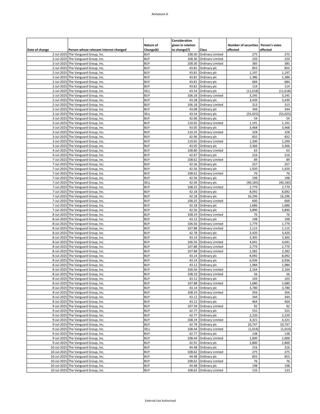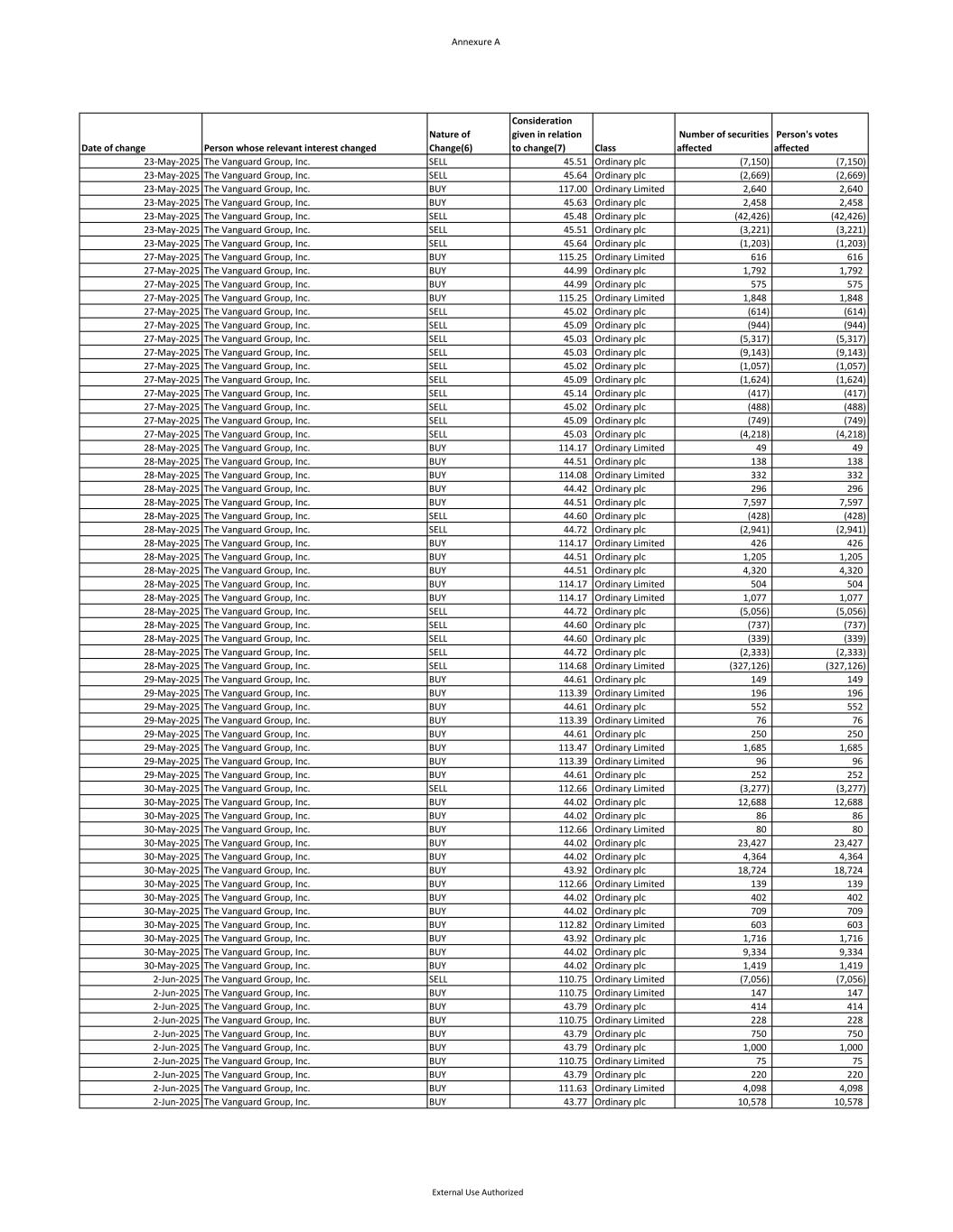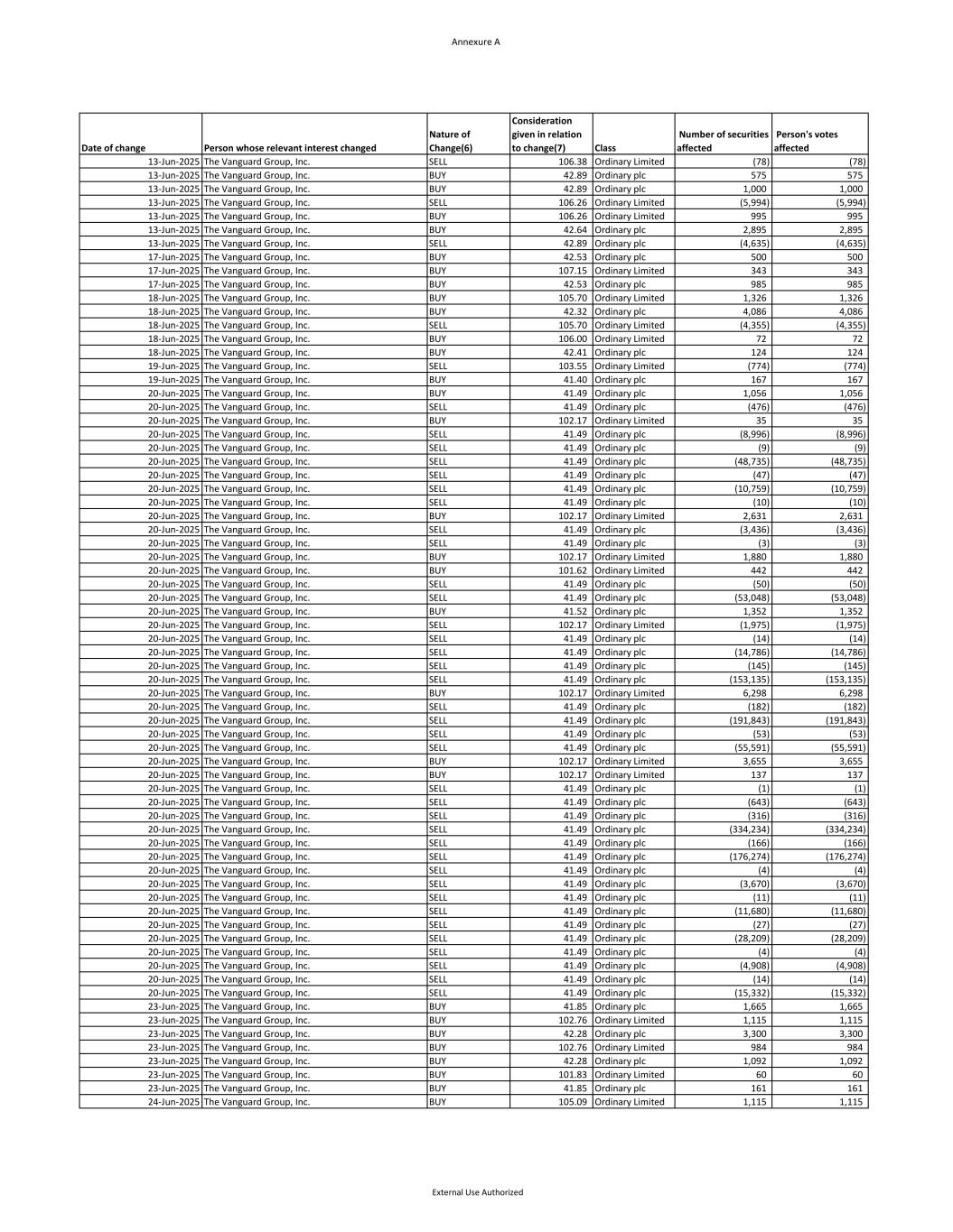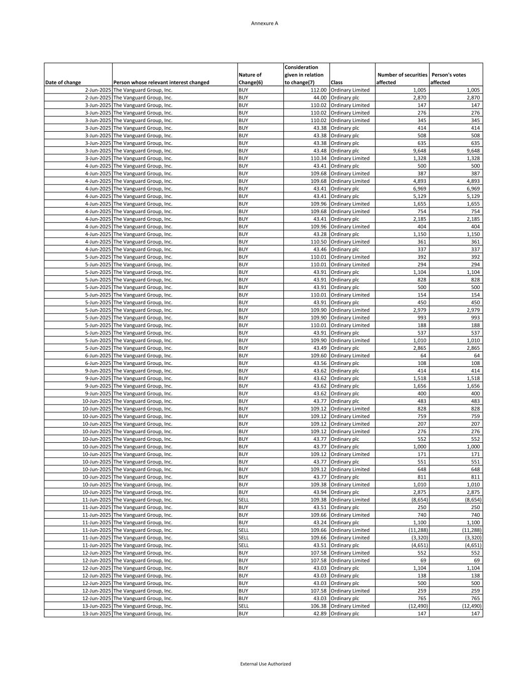 Annexure A Date of change Person whose relevant interest changed Nature of Change(6) Consideration given in relation to change(7) Class Number of securities affected Person's votes affected 23-May-2025 The Vanguard Group, Inc. SELL 45.51 Ordinary plc (7,150) (7,150) 23-May-2025 The Vanguard Group, Inc. SELL 45.64 Ordinary plc (2,669) (2,669) 23-May-2025 The Vanguard Group, Inc. BUY 117.00 Ordinary Limited 2,640 2,640 23-May-2025 The Vanguard Group, Inc. BUY 45.63 Ordinary plc 2,458 2,458 23-May-2025 The Vanguard Group, Inc. SELL 45.48 Ordinary plc (42,426) (42,426) 23-May-2025 The Vanguard Group, Inc. SELL 45.51 Ordinary plc (3,221) (3,221) 23-May-2025 The Vanguard Group, Inc. SELL 45.64 Ordinary plc (1,203) (1,203) 27-May-2025 The Vanguard Group, Inc. BUY 115.25 Ordinary Limited 616 616 27-May-2025 The Vanguard Group, Inc. BUY 44.99 Ordinary plc 1,792 1,792 27-May-2025 The Vanguard Group, Inc. BUY 44.99 Ordinary plc 575 575 27-May-2025 The Vanguard Group, Inc. BUY 115.25 Ordinary Limited 1,848 1,848 27-May-2025 The Vanguard Group, Inc. SELL 45.02 Ordinary plc (614) (614) 27-May-2025 The Vanguard Group, Inc. SELL 45.09 Ordinary plc (944) (944) 27-May-2025 The Vanguard Group, Inc. SELL 45.03 Ordinary plc (5,317) (5,317) 27-May-2025 The Vanguard Group, Inc. SELL 45.03 Ordinary plc (9,143) (9,143) 27-May-2025 The Vanguard Group, Inc. SELL 45.02 Ordinary plc (1,057) (1,057) 27-May-2025 The Vanguard Group, Inc. SELL 45.09 Ordinary plc (1,624) (1,624) 27-May-2025 The Vanguard Group, Inc. SELL 45.14 Ordinary plc (417) (417) 27-May-2025 The Vanguard Group, Inc. SELL 45.02 Ordinary plc (488) (488) 27-May-2025 The Vanguard Group, Inc. SELL 45.09 Ordinary plc (749) (749) 27-May-2025 The Vanguard Group, Inc. SELL 45.03 Ordinary plc (4,218) (4,218) 28-May-2025 The Vanguard Group, Inc. BUY 114.17 Ordinary Limited 49 49 28-May-2025 The Vanguard Group, Inc. BUY 44.51 Ordinary plc 138 138 28-May-2025 The Vanguard Group, Inc. BUY 114.08 Ordinary Limited 332 332 28-May-2025 The Vanguard Group, Inc. BUY 44.42 Ordinary plc 296 296 28-May-2025 The Vanguard Group, Inc. BUY 44.51 Ordinary plc 7,597 7,597 28-May-2025 The Vanguard Group, Inc. SELL 44.60 Ordinary plc (428) (428) 28-May-2025 The Vanguard Group, Inc. SELL 44.72 Ordinary plc (2,941) (2,941) 28-May-2025 The Vanguard Group, Inc. BUY 114.17 Ordinary Limited 426 426 28-May-2025 The Vanguard Group, Inc. BUY 44.51 Ordinary plc 1,205 1,205 28-May-2025 The Vanguard Group, Inc. BUY 44.51 Ordinary plc 4,320 4,320 28-May-2025 The Vanguard Group, Inc. BUY 114.17 Ordinary Limited 504 504 28-May-2025 The Vanguard Group, Inc. BUY 114.17 Ordinary Limited 1,077 1,077 28-May-2025 The Vanguard Group, Inc. SELL 44.72 Ordinary plc (5,056) (5,056) 28-May-2025 The Vanguard Group, Inc. SELL 44.60 Ordinary plc (737) (737) 28-May-2025 The Vanguard Group, Inc. SELL 44.60 Ordinary plc (339) (339) 28-May-2025 The Vanguard Group, Inc. SELL 44.72 Ordinary plc (2,333) (2,333) 28-May-2025 The Vanguard Group, Inc. SELL 114.68 Ordinary Limited (327,126) (327,126) 29-May-2025 The Vanguard Group, Inc. BUY 44.61 Ordinary plc 149 149 29-May-2025 The Vanguard Group, Inc. BUY 113.39 Ordinary Limited 196 196 29-May-2025 The Vanguard Group, Inc. BUY 44.61 Ordinary plc 552 552 29-May-2025 The Vanguard Group, Inc. BUY 113.39 Ordinary Limited 76 76 29-May-2025 The Vanguard Group, Inc. BUY 44.61 Ordinary plc 250 250 29-May-2025 The Vanguard Group, Inc. BUY 113.47 Ordinary Limited 1,685 1,685 29-May-2025 The Vanguard Group, Inc. BUY 113.39 Ordinary Limited 96 96 29-May-2025 The Vanguard Group, Inc. BUY 44.61 Ordinary plc 252 252 30-May-2025 The Vanguard Group, Inc. SELL 112.66 Ordinary Limited (3,277) (3,277) 30-May-2025 The Vanguard Group, Inc. BUY 44.02 Ordinary plc 12,688 12,688 30-May-2025 The Vanguard Group, Inc. BUY 44.02 Ordinary plc 86 86 30-May-2025 The Vanguard Group, Inc. BUY 112.66 Ordinary Limited 80 80 30-May-2025 The Vanguard Group, Inc. BUY 44.02 Ordinary plc 23,427 23,427 30-May-2025 The Vanguard Group, Inc. BUY 44.02 Ordinary plc 4,364 4,364 30-May-2025 The Vanguard Group, Inc. BUY 43.92 Ordinary plc 18,724 18,724 30-May-2025 The Vanguard Group, Inc. BUY 112.66 Ordinary Limited 139 139 30-May-2025 The Vanguard Group, Inc. BUY 44.02 Ordinary plc 402 402 30-May-2025 The Vanguard Group, Inc. BUY 44.02 Ordinary plc 709 709 30-May-2025 The Vanguard Group, Inc. BUY 112.82 Ordinary Limited 603 603 30-May-2025 The Vanguard Group, Inc. BUY 43.92 Ordinary plc 1,716 1,716 30-May-2025 The Vanguard Group, Inc. BUY 44.02 Ordinary plc 9,334 9,334 30-May-2025 The Vanguard Group, Inc. BUY 44.02 Ordinary plc 1,419 1,419 2-Jun-2025 The Vanguard Group, Inc. SELL 110.75 Ordinary Limited (7,056) (7,056) 2-Jun-2025 The Vanguard Group, Inc. BUY 110.75 Ordinary Limited 147 147 2-Jun-2025 The Vanguard Group, Inc. BUY 43.79 Ordinary plc 414 414 2-Jun-2025 The Vanguard Group, Inc. BUY 110.75 Ordinary Limited 228 228 2-Jun-2025 The Vanguard Group, Inc. BUY 43.79 Ordinary plc 750 750 2-Jun-2025 The Vanguard Group, Inc. BUY 43.79 Ordinary plc 1,000 1,000 2-Jun-2025 The Vanguard Group, Inc. BUY 110.75 Ordinary Limited 75 75 2-Jun-2025 The Vanguard Group, Inc. BUY 43.79 Ordinary plc 220 220 2-Jun-2025 The Vanguard Group, Inc. BUY 111.63 Ordinary Limited 4,098 4,098 2-Jun-2025 The Vanguard Group, Inc. BUY 43.77 Ordinary plc 10,578 10,578 # External Use Authorized