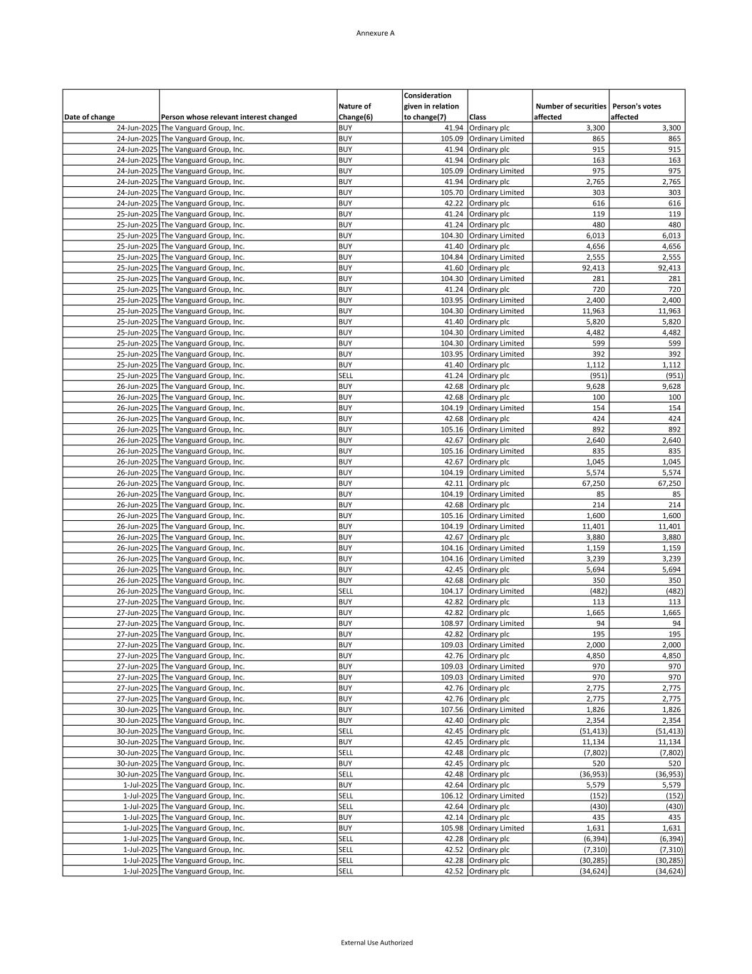 Annexure A Date of change Person whose relevant interest changed Nature of Change(6) Consideration given in relation to change(7) Class Number of securities affected Person's votes affected 24-Jun-2025 The Vanguard Group, Inc. BUY 41.94 Ordinary plc 3,300 3,300 24-Jun-2025 The Vanguard Group, Inc. BUY 105.09 Ordinary Limited 865 865 24-Jun-2025 The Vanguard Group, Inc. BUY 41.94 Ordinary plc 915 915 24-Jun-2025 The Vanguard Group, Inc. BUY 41.94 Ordinary plc 163 163 24-Jun-2025 The Vanguard Group, Inc. BUY 105.09 Ordinary Limited 975 975 24-Jun-2025 The Vanguard Group, Inc. BUY 41.94 Ordinary plc 2,765 2,765 24-Jun-2025 The Vanguard Group, Inc. BUY 105.70 Ordinary Limited 303 303 24-Jun-2025 The Vanguard Group, Inc. BUY 42.22 Ordinary plc 616 616 25-Jun-2025 The Vanguard Group, Inc. BUY 41.24 Ordinary plc 119 119 25-Jun-2025 The Vanguard Group, Inc. BUY 41.24 Ordinary plc 480 480 25-Jun-2025 The Vanguard Group, Inc. BUY 104.30 Ordinary Limited 6,013 6,013 25-Jun-2025 The Vanguard Group, Inc. BUY 41.40 Ordinary plc 4,656 4,656 25-Jun-2025 The Vanguard Group, Inc. BUY 104.84 Ordinary Limited 2,555 2,555 25-Jun-2025 The Vanguard Group, Inc. BUY 41.60 Ordinary plc 92,413 92,413 25-Jun-2025 The Vanguard Group, Inc. BUY 104.30 Ordinary Limited 281 281 25-Jun-2025 The Vanguard Group, Inc. BUY 41.24 Ordinary plc 720 720 25-Jun-2025 The Vanguard Group, Inc. BUY 103.95 Ordinary Limited 2,400 2,400 25-Jun-2025 The Vanguard Group, Inc. BUY 104.30 Ordinary Limited 11,963 11,963 25-Jun-2025 The Vanguard Group, Inc. BUY 41.40 Ordinary plc 5,820 5,820 25-Jun-2025 The Vanguard Group, Inc. BUY 104.30 Ordinary Limited 4,482 4,482 25-Jun-2025 The Vanguard Group, Inc. BUY 104.30 Ordinary Limited 599 599 25-Jun-2025 The Vanguard Group, Inc. BUY 103.95 Ordinary Limited 392 392 25-Jun-2025 The Vanguard Group, Inc. BUY 41.40 Ordinary plc 1,112 1,112 25-Jun-2025 The Vanguard Group, Inc. SELL 41.24 Ordinary plc (951) (951) 26-Jun-2025 The Vanguard Group, Inc. BUY 42.68 Ordinary plc 9,628 9,628 26-Jun-2025 The Vanguard Group, Inc. BUY 42.68 Ordinary plc 100 100 26-Jun-2025 The Vanguard Group, Inc. BUY 104.19 Ordinary Limited 154 154 26-Jun-2025 The Vanguard Group, Inc. BUY 42.68 Ordinary plc 424 424 26-Jun-2025 The Vanguard Group, Inc. BUY 105.16 Ordinary Limited 892 892 26-Jun-2025 The Vanguard Group, Inc. BUY 42.67 Ordinary plc 2,640 2,640 26-Jun-2025 The Vanguard Group, Inc. BUY 105.16 Ordinary Limited 835 835 26-Jun-2025 The Vanguard Group, Inc. BUY 42.67 Ordinary plc 1,045 1,045 26-Jun-2025 The Vanguard Group, Inc. BUY 104.19 Ordinary Limited 5,574 5,574 26-Jun-2025 The Vanguard Group, Inc. BUY 42.11 Ordinary plc 67,250 67,250 26-Jun-2025 The Vanguard Group, Inc. BUY 104.19 Ordinary Limited 85 85 26-Jun-2025 The Vanguard Group, Inc. BUY 42.68 Ordinary plc 214 214 26-Jun-2025 The Vanguard Group, Inc. BUY 105.16 Ordinary Limited 1,600 1,600 26-Jun-2025 The Vanguard Group, Inc. BUY 104.19 Ordinary Limited 11,401 11,401 26-Jun-2025 The Vanguard Group, Inc. BUY 42.67 Ordinary plc 3,880 3,880 26-Jun-2025 The Vanguard Group, Inc. BUY 104.16 Ordinary Limited 1,159 1,159 26-Jun-2025 The Vanguard Group, Inc. BUY 104.16 Ordinary Limited 3,239 3,239 26-Jun-2025 The Vanguard Group, Inc. BUY 42.45 Ordinary plc 5,694 5,694 26-Jun-2025 The Vanguard Group, Inc. BUY 42.68 Ordinary plc 350 350 26-Jun-2025 The Vanguard Group, Inc. SELL 104.17 Ordinary Limited (482) (482) 27-Jun-2025 The Vanguard Group, Inc. BUY 42.82 Ordinary plc 113 113 27-Jun-2025 The Vanguard Group, Inc. BUY 42.82 Ordinary plc 1,665 1,665 27-Jun-2025 The Vanguard Group, Inc. BUY 108.97 Ordinary Limited 94 94 27-Jun-2025 The Vanguard Group, Inc. BUY 42.82 Ordinary plc 195 195 27-Jun-2025 The Vanguard Group, Inc. BUY 109.03 Ordinary Limited 2,000 2,000 27-Jun-2025 The Vanguard Group, Inc. BUY 42.76 Ordinary plc 4,850 4,850 27-Jun-2025 The Vanguard Group, Inc. BUY 109.03 Ordinary Limited 970 970 27-Jun-2025 The Vanguard Group, Inc. BUY 109.03 Ordinary Limited 970 970 27-Jun-2025 The Vanguard Group, Inc. BUY 42.76 Ordinary plc 2,775 2,775 27-Jun-2025 The Vanguard Group, Inc. BUY 42.76 Ordinary plc 2,775 2,775 30-Jun-2025 The Vanguard Group, Inc. BUY 107.56 Ordinary Limited 1,826 1,826 30-Jun-2025 The Vanguard Group, Inc. BUY 42.40 Ordinary plc 2,354 2,354 30-Jun-2025 The Vanguard Group, Inc. SELL 42.45 Ordinary plc (51,413) (51,413) 30-Jun-2025 The Vanguard Group, Inc. BUY 42.45 Ordinary plc 11,134 11,134 30-Jun-2025 The Vanguard Group, Inc. SELL 42.48 Ordinary plc (7,802) (7,802) 30-Jun-2025 The Vanguard Group, Inc. BUY 42.45 Ordinary plc 520 520 30-Jun-2025 The Vanguard Group, Inc. SELL 42.48 Ordinary plc (36,953) (36,953) 1-Jul-2025 The Vanguard Group, Inc. BUY 42.64 Ordinary plc 5,579 5,579 1-Jul-2025 The Vanguard Group, Inc. SELL 106.12 Ordinary Limited (152) (152) 1-Jul-2025 The Vanguard Group, Inc. SELL 42.64 Ordinary plc (430) (430) 1-Jul-2025 The Vanguard Group, Inc. BUY 42.14 Ordinary plc 435 435 1-Jul-2025 The Vanguard Group, Inc. BUY 105.98 Ordinary Limited 1,631 1,631 1-Jul-2025 The Vanguard Group, Inc. SELL 42.28 Ordinary plc (6,394) (6,394) 1-Jul-2025 The Vanguard Group, Inc. SELL 42.52 Ordinary plc (7,310) (7,310) 1-Jul-2025 The Vanguard Group, Inc. SELL 42.28 Ordinary plc (30,285) (30,285) 1-Jul-2025 The Vanguard Group, Inc. SELL 42.52 Ordinary plc (34,624) (34,624) # External Use Authorized