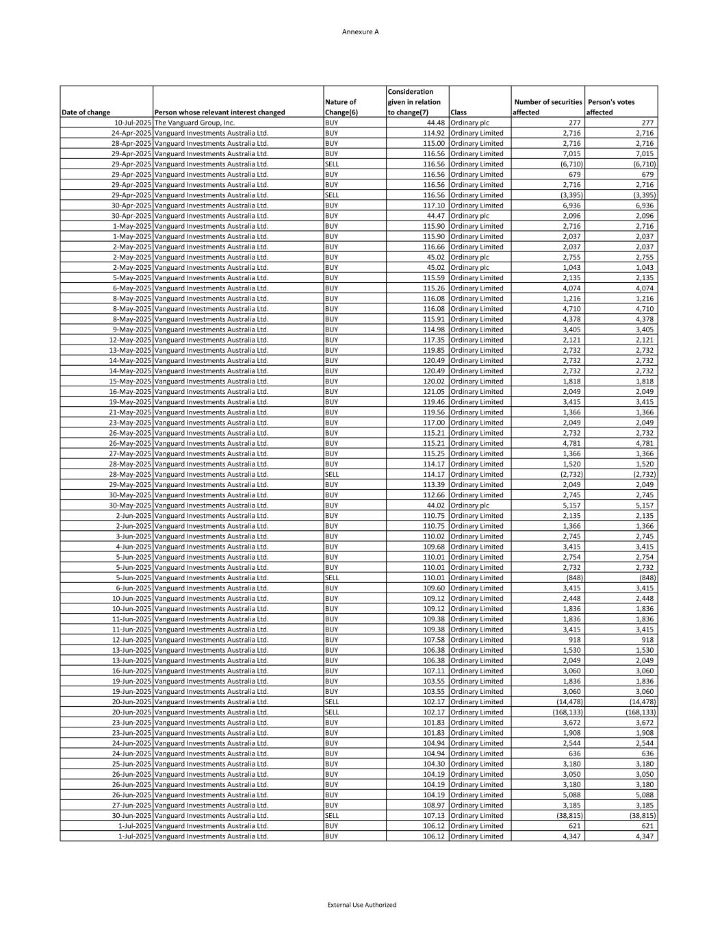 Annexure A Date of change Person whose relevant interest changed Nature of Change(6) Consideration given in relation to change(7) Class Number of securities affected Person's votes affected 13-Jun-2025 The Vanguard Group, Inc. SELL 106.38 Ordinary Limited (78) (78) 13-Jun-2025 The Vanguard Group, Inc. BUY 42.89 Ordinary plc 575 575 13-Jun-2025 The Vanguard Group, Inc. BUY 42.89 Ordinary plc 1,000 1,000 13-Jun-2025 The Vanguard Group, Inc. SELL 106.26 Ordinary Limited (5,994) (5,994) 13-Jun-2025 The Vanguard Group, Inc. BUY 106.26 Ordinary Limited 995 995 13-Jun-2025 The Vanguard Group, Inc. BUY 42.64 Ordinary plc 2,895 2,895 13-Jun-2025 The Vanguard Group, Inc. SELL 42.89 Ordinary plc (4,635) (4,635) 17-Jun-2025 The Vanguard Group, Inc. BUY 42.53 Ordinary plc 500 500 17-Jun-2025 The Vanguard Group, Inc. BUY 107.15 Ordinary Limited 343 343 17-Jun-2025 The Vanguard Group, Inc. BUY 42.53 Ordinary plc 985 985 18-Jun-2025 The Vanguard Group, Inc. BUY 105.70 Ordinary Limited 1,326 1,326 18-Jun-2025 The Vanguard Group, Inc. BUY 42.32 Ordinary plc 4,086 4,086 18-Jun-2025 The Vanguard Group, Inc. SELL 105.70 Ordinary Limited (4,355) (4,355) 18-Jun-2025 The Vanguard Group, Inc. BUY 106.00 Ordinary Limited 72 72 18-Jun-2025 The Vanguard Group, Inc. BUY 42.41 Ordinary plc 124 124 19-Jun-2025 The Vanguard Group, Inc. SELL 103.55 Ordinary Limited (774) (774) 19-Jun-2025 The Vanguard Group, Inc. BUY 41.40 Ordinary plc 167 167 20-Jun-2025 The Vanguard Group, Inc. BUY 41.49 Ordinary plc 1,056 1,056 20-Jun-2025 The Vanguard Group, Inc. SELL 41.49 Ordinary plc (476) (476) 20-Jun-2025 The Vanguard Group, Inc. BUY 102.17 Ordinary Limited 35 35 20-Jun-2025 The Vanguard Group, Inc. SELL 41.49 Ordinary plc (8,996) (8,996) 20-Jun-2025 The Vanguard Group, Inc. SELL 41.49 Ordinary plc (9) (9) 20-Jun-2025 The Vanguard Group, Inc. SELL 41.49 Ordinary plc (48,735) (48,735) 20-Jun-2025 The Vanguard Group, Inc. SELL 41.49 Ordinary plc (47) (47) 20-Jun-2025 The Vanguard Group, Inc. SELL 41.49 Ordinary plc (10,759) (10,759) 20-Jun-2025 The Vanguard Group, Inc. SELL 41.49 Ordinary plc (10) (10) 20-Jun-2025 The Vanguard Group, Inc. BUY 102.17 Ordinary Limited 2,631 2,631 20-Jun-2025 The Vanguard Group, Inc. SELL 41.49 Ordinary plc (3,436) (3,436) 20-Jun-2025 The Vanguard Group, Inc. SELL 41.49 Ordinary plc (3) (3) 20-Jun-2025 The Vanguard Group, Inc. BUY 102.17 Ordinary Limited 1,880 1,880 20-Jun-2025 The Vanguard Group, Inc. BUY 101.62 Ordinary Limited 442 442 20-Jun-2025 The Vanguard Group, Inc. SELL 41.49 Ordinary plc (50) (50) 20-Jun-2025 The Vanguard Group, Inc. SELL 41.49 Ordinary plc (53,048) (53,048) 20-Jun-2025 The Vanguard Group, Inc. BUY 41.52 Ordinary plc 1,352 1,352 20-Jun-2025 The Vanguard Group, Inc. SELL 102.17 Ordinary Limited (1,975) (1,975) 20-Jun-2025 The Vanguard Group, Inc. SELL 41.49 Ordinary plc (14) (14) 20-Jun-2025 The Vanguard Group, Inc. SELL 41.49 Ordinary plc (14,786) (14,786) 20-Jun-2025 The Vanguard Group, Inc. SELL 41.49 Ordinary plc (145) (145) 20-Jun-2025 The Vanguard Group, Inc. SELL 41.49 Ordinary plc (153,135) (153,135) 20-Jun-2025 The Vanguard Group, Inc. BUY 102.17 Ordinary Limited 6,298 6,298 20-Jun-2025 The Vanguard Group, Inc. SELL 41.49 Ordinary plc (182) (182) 20-Jun-2025 The Vanguard Group, Inc. SELL 41.49 Ordinary plc (191,843) (191,843) 20-Jun-2025 The Vanguard Group, Inc. SELL 41.49 Ordinary plc (53) (53) 20-Jun-2025 The Vanguard Group, Inc. SELL 41.49 Ordinary plc (55,591) (55,591) 20-Jun-2025 The Vanguard Group, Inc. BUY 102.17 Ordinary Limited 3,655 3,655 20-Jun-2025 The Vanguard Group, Inc. BUY 102.17 Ordinary Limited 137 137 20-Jun-2025 The Vanguard Group, Inc. SELL 41.49 Ordinary plc (1) (1) 20-Jun-2025 The Vanguard Group, Inc. SELL 41.49 Ordinary plc (643) (643) 20-Jun-2025 The Vanguard Group, Inc. SELL 41.49 Ordinary plc (316) (316) 20-Jun-2025 The Vanguard Group, Inc. SELL 41.49 Ordinary plc (334,234) (334,234) 20-Jun-2025 The Vanguard Group, Inc. SELL 41.49 Ordinary plc (166) (166) 20-Jun-2025 The Vanguard Group, Inc. SELL 41.49 Ordinary plc (176,274) (176,274) 20-Jun-2025 The Vanguard Group, Inc. SELL 41.49 Ordinary plc (4) (4) 20-Jun-2025 The Vanguard Group, Inc. SELL 41.49 Ordinary plc (3,670) (3,670) 20-Jun-2025 The Vanguard Group, Inc. SELL 41.49 Ordinary plc (11) (11) 20-Jun-2025 The Vanguard Group, Inc. SELL 41.49 Ordinary plc (11,680) (11,680) 20-Jun-2025 The Vanguard Group, Inc. SELL 41.49 Ordinary plc (27) (27) 20-Jun-2025 The Vanguard Group, Inc. SELL 41.49 Ordinary plc (28,209) (28,209) 20-Jun-2025 The Vanguard Group, Inc. SELL 41.49 Ordinary plc (4) (4) 20-Jun-2025 The Vanguard Group, Inc. SELL 41.49 Ordinary plc (4,908) (4,908) 20-Jun-2025 The Vanguard Group, Inc. SELL 41.49 Ordinary plc (14) (14) 20-Jun-2025 The Vanguard Group, Inc. SELL 41.49 Ordinary plc (15,332) (15,332) 23-Jun-2025 The Vanguard Group, Inc. BUY 41.85 Ordinary plc 1,665 1,665 23-Jun-2025 The Vanguard Group, Inc. BUY 102.76 Ordinary Limited 1,115 1,115 23-Jun-2025 The Vanguard Group, Inc. BUY 42.28 Ordinary plc 3,300 3,300 23-Jun-2025 The Vanguard Group, Inc. BUY 102.76 Ordinary Limited 984 984 23-Jun-2025 The Vanguard Group, Inc. BUY 42.28 Ordinary plc 1,092 1,092 23-Jun-2025 The Vanguard Group, Inc. BUY 101.83 Ordinary Limited 60 60 23-Jun-2025 The Vanguard Group, Inc. BUY 41.85 Ordinary plc 161 161 24-Jun-2025 The Vanguard Group, Inc. BUY 105.09 Ordinary Limited 1,115 1,115 # External Use Authorized