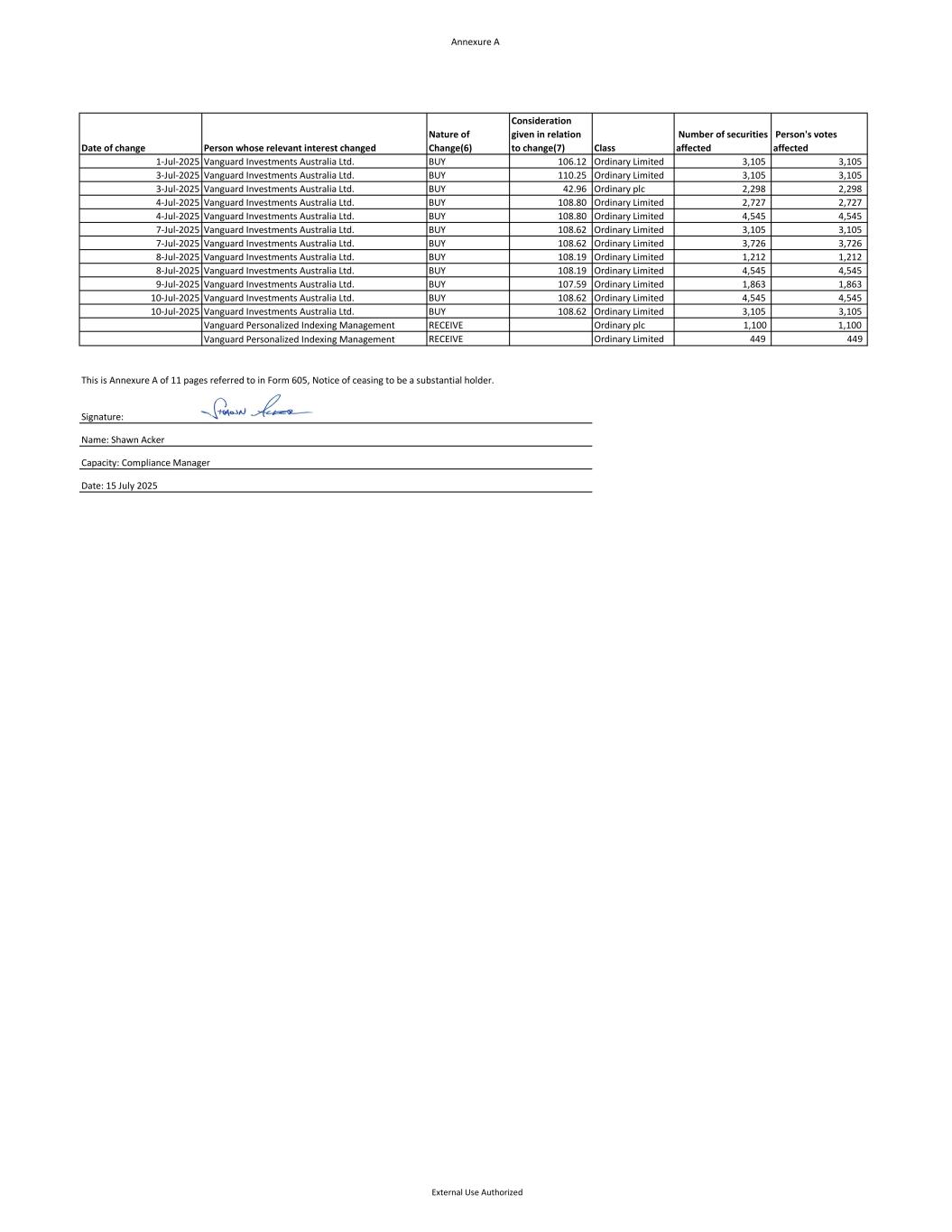 Annexure A Date of change Person whose relevant interest changed Nature of Change(6) Consideration given in relation to change(7) Class Number of securities affected Person's votes affected 2-Jul-2025 The Vanguard Group, Inc. BUY 108.30 Ordinary Limited 275 275 2-Jul-2025 The Vanguard Group, Inc. BUY 108.30 Ordinary Limited 220 220 2-Jul-2025 The Vanguard Group, Inc. BUY 108.30 Ordinary Limited 385 385 2-Jul-2025 The Vanguard Group, Inc. BUY 43.81 Ordinary plc 855 855 2-Jul-2025 The Vanguard Group, Inc. BUY 43.81 Ordinary plc 1,197 1,197 2-Jul-2025 The Vanguard Group, Inc. BUY 43.81 Ordinary plc 1,386 1,386 2-Jul-2025 The Vanguard Group, Inc. BUY 43.81 Ordinary plc 684 684 2-Jul-2025 The Vanguard Group, Inc. BUY 43.81 Ordinary plc 114 114 2-Jul-2025 The Vanguard Group, Inc. SELL 43.54 Ordinary plc (11,618) (11,618) 2-Jul-2025 The Vanguard Group, Inc. BUY 106.18 Ordinary Limited 3,245 3,245 2-Jul-2025 The Vanguard Group, Inc. BUY 43.28 Ordinary plc 3,439 3,439 2-Jul-2025 The Vanguard Group, Inc. BUY 106.18 Ordinary Limited 313 313 2-Jul-2025 The Vanguard Group, Inc. BUY 43.08 Ordinary plc 344 344 2-Jul-2025 The Vanguard Group, Inc. SELL 43.54 Ordinary plc (55,025) (55,025) 3-Jul-2025 The Vanguard Group, Inc. BUY 42.96 Ordinary plc 54 54 3-Jul-2025 The Vanguard Group, Inc. BUY 110.65 Ordinary Limited 1,191 1,191 3-Jul-2025 The Vanguard Group, Inc. BUY 43.05 Ordinary plc 3,468 3,468 3-Jul-2025 The Vanguard Group, Inc. BUY 110.25 Ordinary Limited 328 328 3-Jul-2025 The Vanguard Group, Inc. BUY 42.96 Ordinary plc 832 832 3-Jul-2025 The Vanguard Group, Inc. BUY 110.65 Ordinary Limited 1,200 1,200 3-Jul-2025 The Vanguard Group, Inc. BUY 43.05 Ordinary plc 3,366 3,366 4-Jul-2025 The Vanguard Group, Inc. BUY 108.80 Ordinary Limited 63 63 4-Jul-2025 The Vanguard Group, Inc. BUY 42.67 Ordinary plc 216 216 7-Jul-2025 The Vanguard Group, Inc. BUY 108.62 Ordinary Limited 89 89 7-Jul-2025 The Vanguard Group, Inc. BUY 42.56 Ordinary plc 257 257 7-Jul-2025 The Vanguard Group, Inc. BUY 42.56 Ordinary plc 1,920 1,920 7-Jul-2025 The Vanguard Group, Inc. BUY 108.62 Ordinary Limited 76 76 7-Jul-2025 The Vanguard Group, Inc. BUY 42.56 Ordinary plc 198 198 7-Jul-2025 The Vanguard Group, Inc. SELL 42.56 Ordinary plc (40,185) (40,185) 7-Jul-2025 The Vanguard Group, Inc. BUY 108.25 Ordinary Limited 2,779 2,779 7-Jul-2025 The Vanguard Group, Inc. BUY 42.18 Ordinary plc 8,092 8,092 7-Jul-2025 The Vanguard Group, Inc. BUY 42.18 Ordinary plc 16,296 16,296 7-Jul-2025 The Vanguard Group, Inc. BUY 108.25 Ordinary Limited 600 600 7-Jul-2025 The Vanguard Group, Inc. BUY 42.18 Ordinary plc 1,686 1,686 7-Jul-2025 The Vanguard Group, Inc. BUY 42.56 Ordinary plc 3,890 3,890 8-Jul-2025 The Vanguard Group, Inc. BUY 108.19 Ordinary Limited 76 76 8-Jul-2025 The Vanguard Group, Inc. BUY 43.12 Ordinary plc 198 198 8-Jul-2025 The Vanguard Group, Inc. BUY 106.56 Ordinary Limited 1,779 1,779 8-Jul-2025 The Vanguard Group, Inc. BUY 107.88 Ordinary Limited 1,115 1,115 8-Jul-2025 The Vanguard Group, Inc. BUY 42.78 Ordinary plc 3,420 3,420 8-Jul-2025 The Vanguard Group, Inc. BUY 43.14 Ordinary plc 3,305 3,305 8-Jul-2025 The Vanguard Group, Inc. BUY 106.56 Ordinary Limited 4,041 4,041 8-Jul-2025 The Vanguard Group, Inc. BUY 107.88 Ordinary Limited 2,779 2,779 8-Jul-2025 The Vanguard Group, Inc. BUY 107.88 Ordinary Limited 2,382 2,382 8-Jul-2025 The Vanguard Group, Inc. BUY 43.14 Ordinary plc 8,092 8,092 8-Jul-2025 The Vanguard Group, Inc. BUY 43.14 Ordinary plc 6,936 6,936 8-Jul-2025 The Vanguard Group, Inc. BUY 43.12 Ordinary plc 1,984 1,984 8-Jul-2025 The Vanguard Group, Inc. BUY 106.56 Ordinary Limited 2,164 2,164 8-Jul-2025 The Vanguard Group, Inc. BUY 108.19 Ordinary Limited 56 56 8-Jul-2025 The Vanguard Group, Inc. BUY 43.12 Ordinary plc 103 103 8-Jul-2025 The Vanguard Group, Inc. BUY 107.88 Ordinary Limited 1,680 1,680 8-Jul-2025 The Vanguard Group, Inc. BUY 43.14 Ordinary plc 3,780 3,780 8-Jul-2025 The Vanguard Group, Inc. BUY 108.19 Ordinary Limited 356 356 8-Jul-2025 The Vanguard Group, Inc. BUY 43.12 Ordinary plc 344 344 8-Jul-2025 The Vanguard Group, Inc. BUY 43.12 Ordinary plc 464 464 9-Jul-2025 The Vanguard Group, Inc. BUY 107.59 Ordinary Limited 92 92 9-Jul-2025 The Vanguard Group, Inc. BUY 42.77 Ordinary plc 555 555 9-Jul-2025 The Vanguard Group, Inc. BUY 42.77 Ordinary plc 2,220 2,220 9-Jul-2025 The Vanguard Group, Inc. BUY 108.19 Ordinary Limited 4,321 4,321 9-Jul-2025 The Vanguard Group, Inc. BUY 42.79 Ordinary plc 10,747 10,747 9-Jul-2025 The Vanguard Group, Inc. SELL 108.44 Ordinary Limited (1,014) (1,014) 9-Jul-2025 The Vanguard Group, Inc. BUY 42.77 Ordinary plc 138 138 9-Jul-2025 The Vanguard Group, Inc. BUY 108.44 Ordinary Limited 1,000 1,000 9-Jul-2025 The Vanguard Group, Inc. BUY 42.91 Ordinary plc 2,800 2,800 10-Jul-2025 The Vanguard Group, Inc. BUY 44.48 Ordinary plc 216 216 10-Jul-2025 The Vanguard Group, Inc. BUY 108.62 Ordinary Limited 275 275 10-Jul-2025 The Vanguard Group, Inc. BUY 44.48 Ordinary plc 855 855 10-Jul-2025 The Vanguard Group, Inc. BUY 108.62 Ordinary Limited 76 76 10-Jul-2025 The Vanguard Group, Inc. BUY 44.48 Ordinary plc 198 198 10-Jul-2025 The Vanguard Group, Inc. BUY 108.62 Ordinary Limited 133 133 # External Use Authorized
