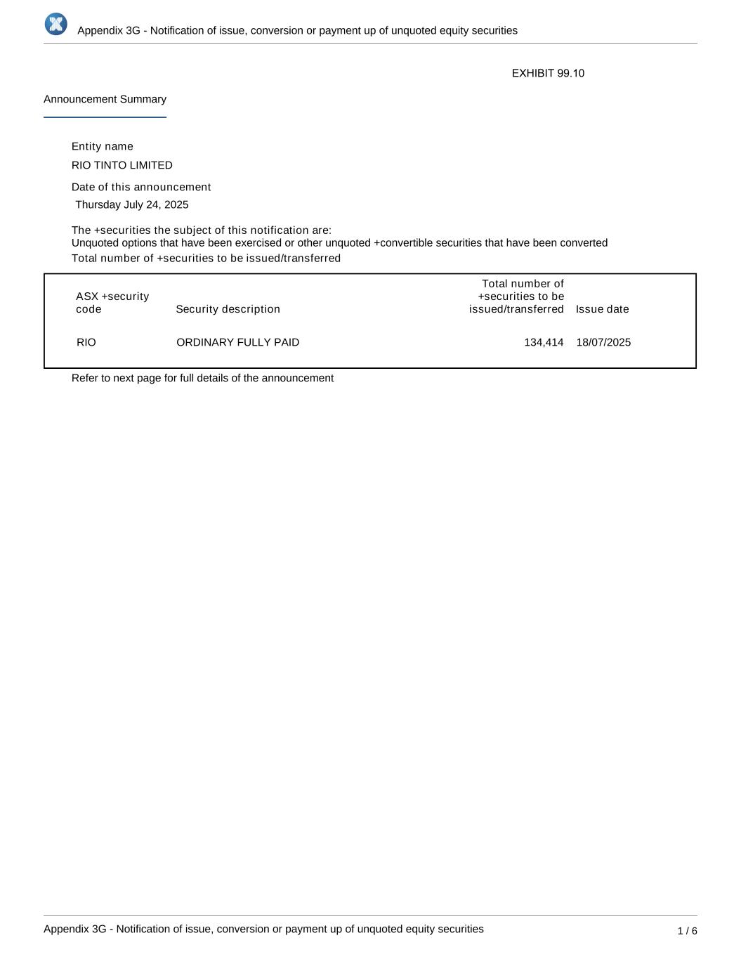 Appendix 3G - Notification of issue, conversion or payment up of unquoted equity securities Appendix 3G - Notification of issue, conversion or payment up of unquoted equity securities 1 / 6 Announcement Summary Entity name RIO TINTO LIMITED Date of this announcement Thursday July 24, 2025 The +securities the subject of this notification are: Total number of +securities to be issued/transferred ASX +security code Security description Total number of +securities to be issued/transferred Issue date RIO ORDINARY FULLY PAID 134,414 18/07/2025 Refer to next page for full details of the announcement Unquoted options that have been exercised or other unquoted +convertible securities that have been converted EXHIBIT 99.10