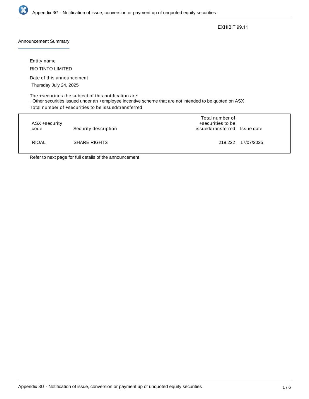 Appendix 3G - Notification of issue, conversion or payment up of unquoted equity securities Appendix 3G - Notification of issue, conversion or payment up of unquoted equity securities 1 / 6 Announcement Summary Entity name RIO TINTO LIMITED Date of this announcement Thursday July 24, 2025 The +securities the subject of this notification are: Total number of +securities to be issued/transferred ASX +security code Security description Total number of +securities to be issued/transferred Issue date RIOAL SHARE RIGHTS 219,222 17/07/2025 Refer to next page for full details of the announcement +Other securities issued under an +employee incentive scheme that are not intended to be quoted on ASX EXHIBIT 99.11