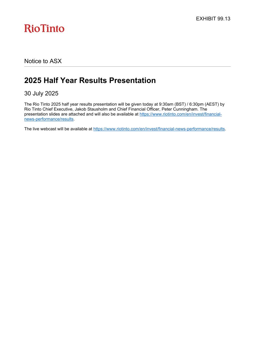 Notice to ASX 2025 Half Year Results Presentation 30 July 2025 The Rio Tinto 2025 half year results presentation will be given today at 9:30am (BST) / 6:30pm (AEST) by Rio Tinto Chief Executive, Jakob Stausholm and Chief Financial Officer, Peter Cunningham. The presentation slides are attached and will also be available at https://www.riotinto.com/en/invest/financial- news-performance/results. The live webcast will be available at https://www.riotinto.com/en/invest/financial-news-performance/results. EXHIBIT 99.13
