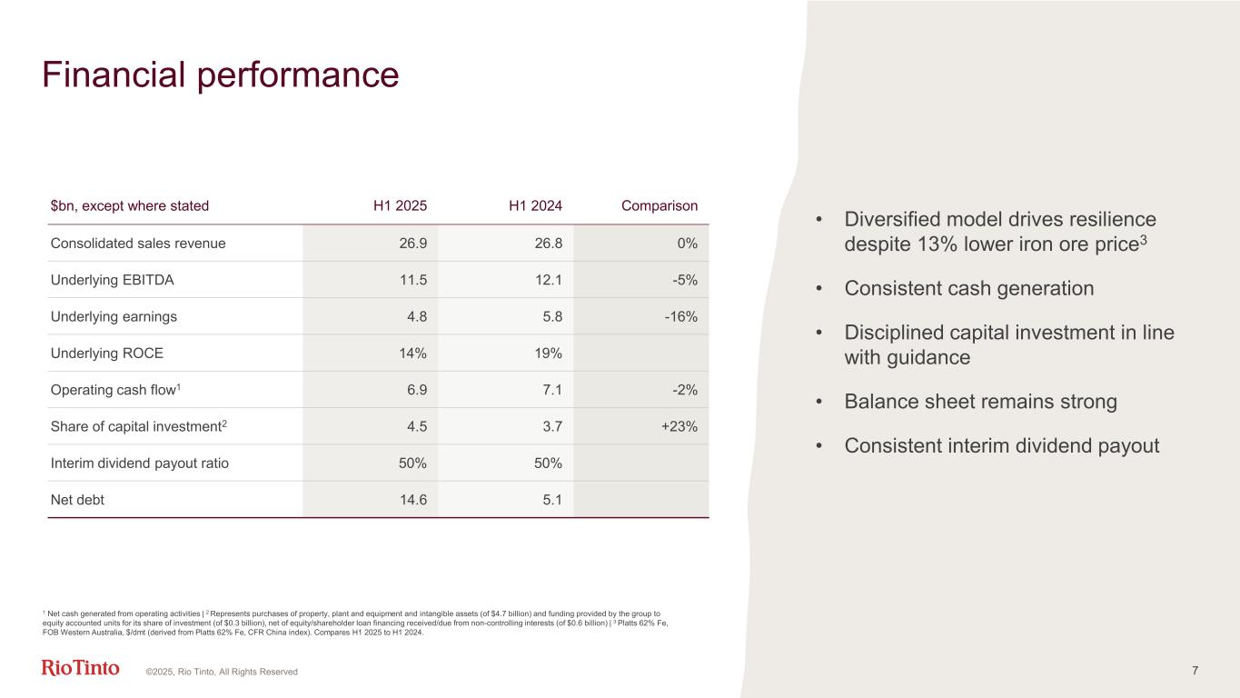 4 Strategic investment and best-in-class project execution drives our growth Bauxite • H1 production record; +9% YoY • Amrun consistently above nameplate capacity Oyu Tolgoi copper • H1 production continues to successfully ramp up; +54% YoY Pilbara iron ore • Highest Q2 production since 2018 Best Operator Aluminium • Third PPA1 signed for Boyne Oyu Tolgoi copper • Utilising first battery-swap trucks Pilbara iron ore • NeoSmelt steel decarbonisation project receives Government support Impeccable ESG H1 2025 CuEq production4 growth 6% ~4% Mid-term CuEq production4 growth on track vs H1 2024 CAGR (from 2024 -2028f) Simandou high-grade iron ore • Accelerating first shipment to ~November 2025 Oyu Tolgoi copper • On track to average ~500 ktpa of copper from 2028 – 20362 Western Range iron ore • First ore in Q1 2025, on time and budget Excel in development PKKP3 co-management agreement • Landmark agreement signed in May Co-designed Western Range mine • First co-designed Social, Cultural and Heritage Management Plan with the Yinhawangka Traditional Owners Social licence 6 1 PPA = Power Purchase Agreement | 2 See supporting references for the Oyu Tolgoi production target on slide 2 | 3 Puutu Kunti Kurrama and Pinikura | 4 Copper equivalent production (CuEq production) based on long-term consensus pricing | 5 Includes Arcadium Lithium | 6 Ambition for compound annual growth rate (CAGR) for copper equivalent production, incorporating lithium, from 2024 to 2028f ©2025, Rio Tinto, All Rights Reserved 5