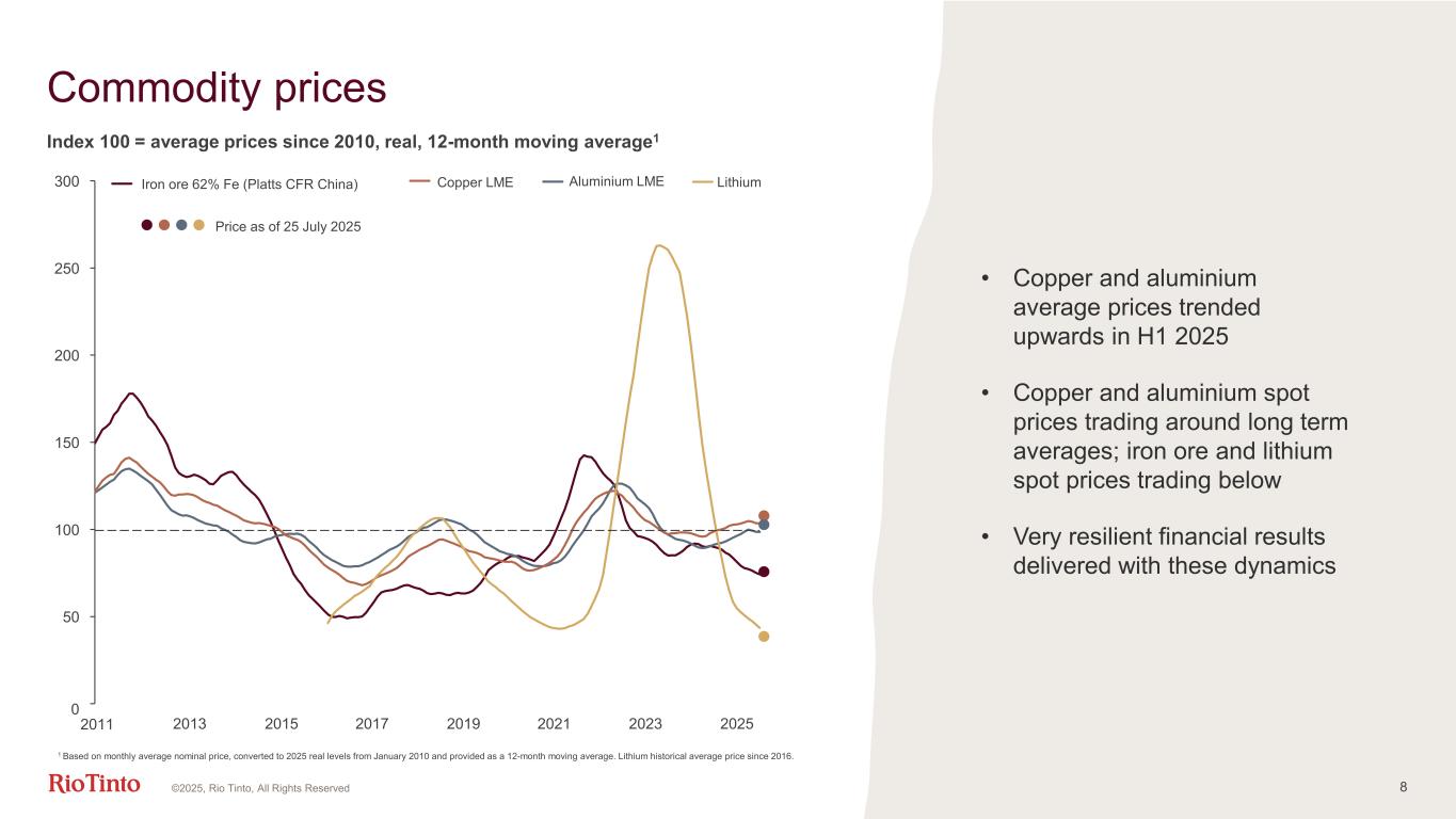 7 Financial performance 1 Net cash generated from operating activities | 2 Represents purchases of property, plant and equipment and intangible assets (of $4.7 billion) and funding provided by the group to equity accounted units for its share of investment (of $0.3 billion), net of equity/shareholder loan financing received/due from non-controlling interests (of $0.6 billion) | 3 Platts 62% Fe, FOB Western Australia, $/dmt (derived from Platts 62% Fe, CFR China index). Compares H1 2025 to H1 2024. • Diversified model drives resilience despite 13% lower iron ore price3 • Consistent cash generation • Disciplined capital investment in line with guidance • Balance sheet remains strong • Consistent interim dividend payout ©2025, Rio Tinto, All Rights Reserved $bn, except where stated H1 2025 H1 2024 Comparison Consolidated sales revenue 26.9 26.8 0% Underlying EBITDA 11.5 12.1 -5% Underlying earnings 4.8 5.8 -16% Underlying ROCE 14% 19% Operating cash flow1 6.9 7.1 -2% Share of capital investment2 4.5 3.7 +23% Interim dividend payout ratio 50% 50% Net debt 14.6 5.1