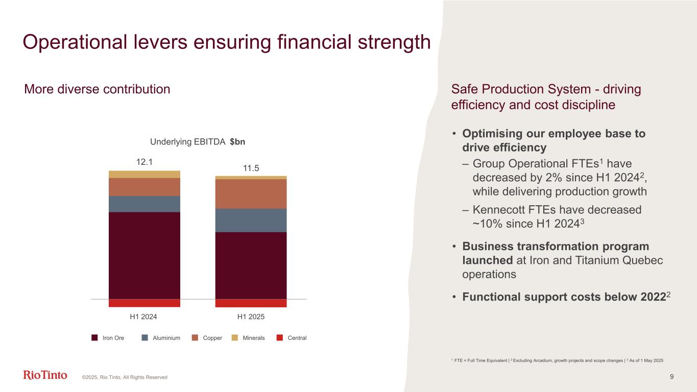50 100 150 200 250 300 8 Commodity prices Iron ore 62% Fe (Platts CFR China) Aluminium LMECopper LME Lithium Price as of 25 July 2025 1 Based on monthly average nominal price, converted to 2025 real levels from January 2010 and provided as a 12-month moving average. Lithium historical average price since 2016. Index 100 = average prices since 2010, real, 12-month moving average1 • Copper and aluminium average prices trended upwards in H1 2025 • Copper and aluminium spot prices trading around long term averages; iron ore and lithium spot prices trading below • Very resilient financial results delivered with these dynamics ©2025, Rio Tinto, All Rights Reserved 2013 2015 2017 2019 2021 2023 20252011 0