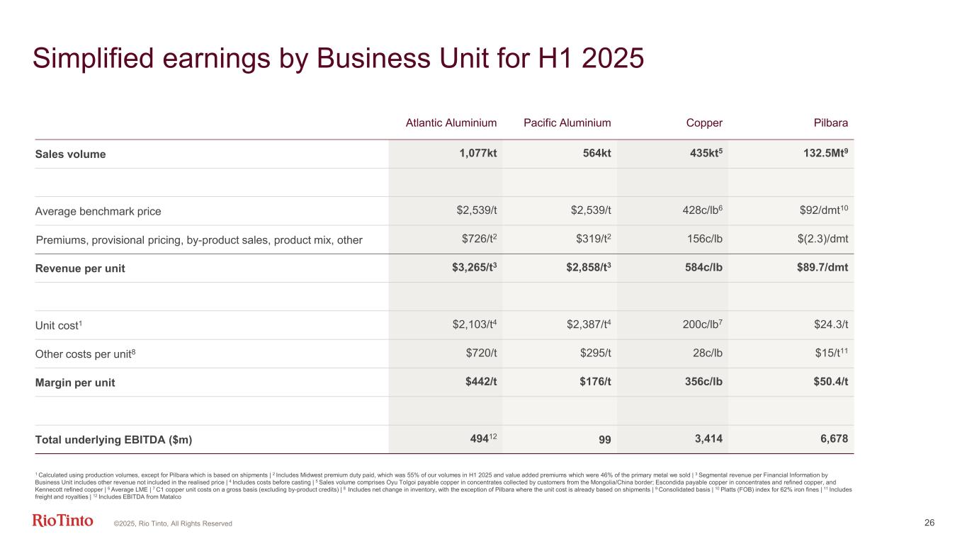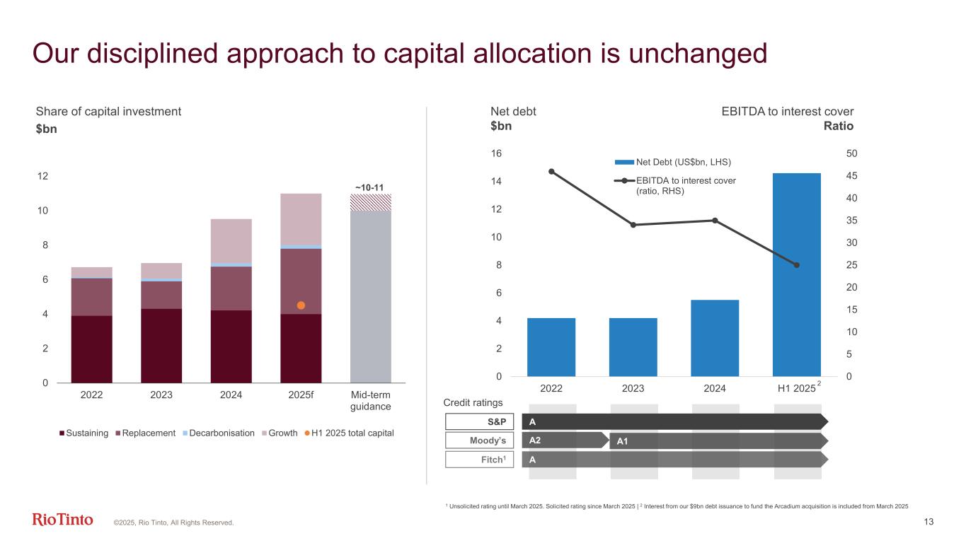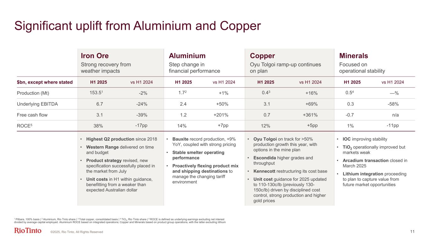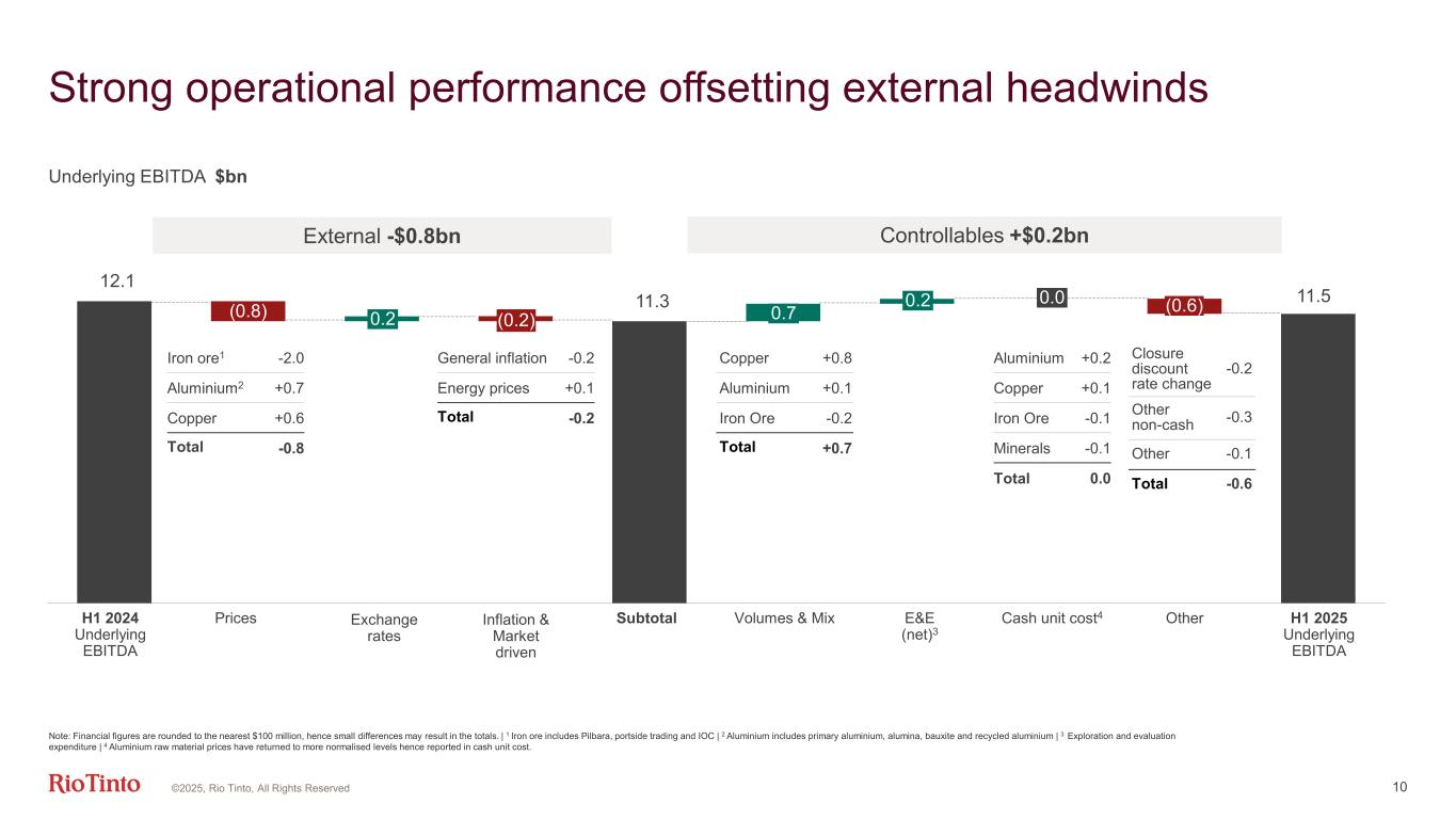 12.1 11.3 11.5 (0.8) 0.0 10 H1 2024 Underlying EBITDA Prices 0.2 Exchange rates (0.2) Inflation & Market driven Subtotal 0.7 Volumes & Mix 0.2 E&E (net)3 Cash unit cost4 (0.6) Other H1 2025 Underlying EBITDA External -$0.8bn Controllables +$0.2bn Note: Financial figures are rounded to the nearest $100 million, hence small differences may result in the totals. | 1 Iron ore includes Pilbara, portside trading and IOC | 2 Aluminium includes primary aluminium, alumina, bauxite and recycled aluminium | 3 Exploration and evaluation expenditure | 4 Aluminium raw material prices have returned to more normalised levels hence reported in cash unit cost. ©2025, Rio Tinto, All Rights Reserved Iron ore1 -2.0 Aluminium2 +0.7 Copper +0.6 Total -0.8 General inflation -0.2 Energy prices +0.1 Total -0.2 Closure discount rate change -0.2 Other non-cash -0.3 Other -0.1 Total -0.6 Copper +0.8 Aluminium +0.1 Iron Ore -0.2 Total +0.7 Aluminium +0.2 Copper +0.1 Iron Ore -0.1 Minerals -0.1 Total 0.0 Strong operational performance offsetting external headwinds Underlying EBITDA $bn