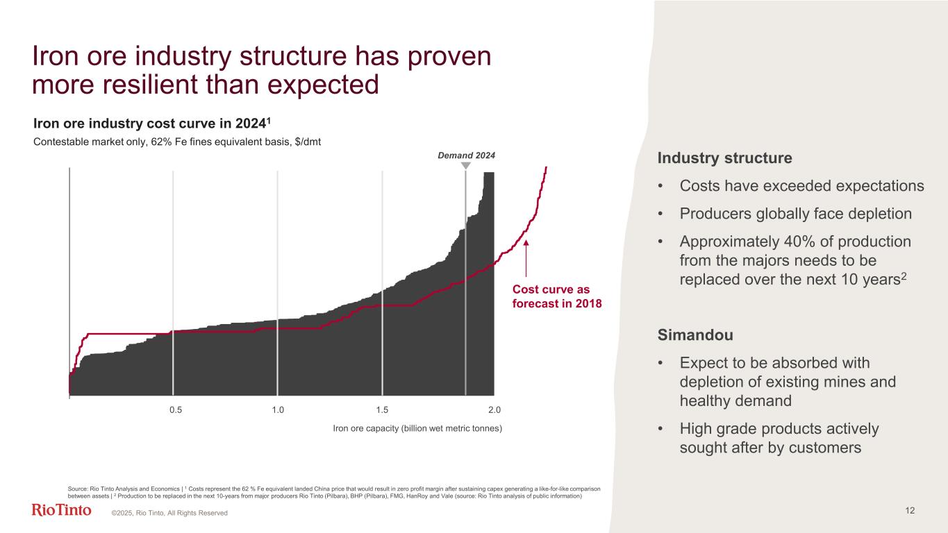 11 Significant uplift from Aluminium and Copper Iron Ore Strong recovery from weather impacts Aluminium Step change in financial performance Copper Oyu Tolgoi ramp-up continues on plan Minerals Focused on operational stability $bn, except where stated H1 2025 vs H1 2024 H1 2025 vs H1 2024 H1 2025 vs H1 2024 H1 2025 vs H1 2024 Production (Mt) 153.51 -2% 1.72 +1% 0.43 +16% 0.54 —% Underlying EBITDA 6.7 -24% 2.4 +50% 3.1 +69% 0.3 -58% Free cash flow 3.1 -39% 1.2 +201% 0.7 +361% -0.7 n/a ROCE5 38% -17pp 14% +7pp 12% +5pp 1% -11pp • Highest Q2 production since 2018 • Western Range delivered on time and budget • Product strategy revised, new specification successfully placed in the market from July • Unit costs in H1 within guidance, benefitting from a weaker than expected Australian dollar • Bauxite record production, +9% YoY, coupled with strong pricing • Stable smelter operating performance • Proactively flexing product mix and shipping destinations to manage the changing tariff environment • Oyu Tolgoi on track for >50% production growth this year, with options in the mine plan • Escondida higher grades and throughput • Kennecott restructuring its cost base • Unit cost guidance for 2025 updated to 110-130c/lb (previously 130- 150c/lb) driven by disciplined cost control, strong production and higher gold prices • IOC improving stability • TiO2 operationally improved but markets weak • Arcadium transaction closed in March 2025 • Lithium integration proceeding to plan to capture value from future market opportunities 1 Pilbara, 100% basis | 2 Aluminium, Rio Tinto share | 3 Total copper, consolidated basis | 4 TiO2, Rio Tinto share | 5 ROCE is defined as underlying earnings excluding net interest divided by average capital employed. Aluminium ROCE based on integrated operations; Copper and Minerals based on product group operations, with the latter excluding lithium ©2025, Rio Tinto, All Rights Reserved