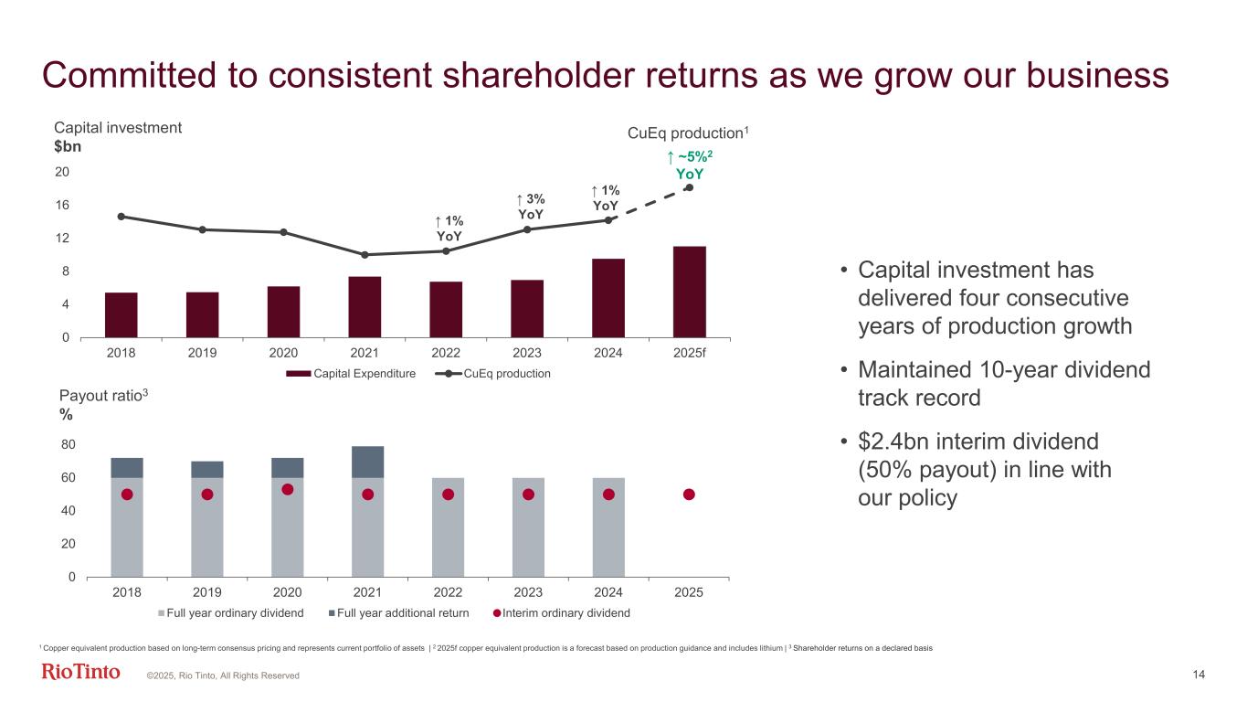13 Our disciplined approach to capital allocation is unchanged Share of capital investment $bn ©2025, Rio Tinto, All Rights Reserved. Net debt $bn 0 5 10 15 20 25 30 35 40 45 50 0 2 4 6 8 10 12 14 16 2022 2023 2024 H1 2025 Net Debt (US$bn, LHS) EBITDA to interest cover (ratio, RHS) 0 2 4 6 8 10 12 2022 2023 2024 2025f Mid-term guidance Sustaining Replacement Decarbonisation Growth H1 2025 total capital Credit ratings A A2 A1 A S&P EBITDA to interest cover Ratio 1 Unsolicited rating until March 2025. Solicited rating since March 2025 | 2 Interest from our $9bn debt issuance to fund the Arcadium acquisition is included from March 2025 2 ~10-11