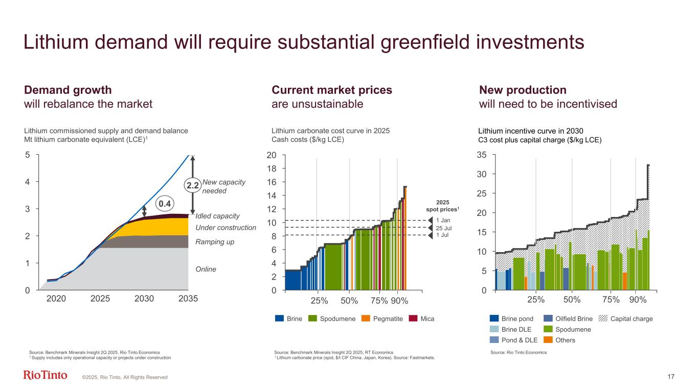 16 The energy transition continues to drive growth today H1 2025 YoY4 drive commodity demand growth… 1 Source: Oxford Economics | 2 Source: IEA, S&P global and Enerdata projections | 3 Source: IEA and Ember projections | 4 YoY compares H1 2025 to H1 2024 | 5 Total iron ore requirement, excludes changes in portside inventory | 6 BESS = Battery energy storage system Copper +3%13Mt Aluminium +3%37Mt Lithium +28%713Kt Iron ore5 0%1.2Bt YoY4 Solid underlying fundamentals… GDP1 +2.8% Energy consumption2 +2.5% Electricity demand3 +4.0% particularly for lithium H1 2024 566 784 H1 2025 +38% Other Demand Portable electronics BESS6 EVs Commercial EV 2024-25 growth 1% 29% 106% 29% GWh Global battery demand by end-useGlobal commodity demandGlobal growth ©2025, Rio Tinto, All Rights Reserved