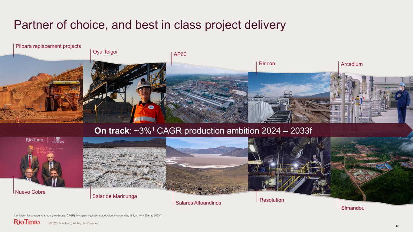 17 Lithium demand will require substantial greenfield investments ©2025, Rio Tinto, All Rights Reserved Lithium commissioned supply and demand balance Mt lithium carbonate equivalent (LCE)1 Demand growth will rebalance the market Lithium incentive curve in 2030 C3 cost plus capital charge ($/kg LCE) New production will need to be incentivised Source: 1 Lithium carbonate price (spot, $/t CIF China, Japan, Korea). Source: Fastmarkets. Benchmark Minerals Insight 2Q 2025, RT Economics Lithium carbonate cost curve in 2025 Cash costs ($/kg LCE) 50% 75%25% Current market prices are unsustainable 0 100 35 30 25 20 15 10 5 0 900800600500400300200 Brine pond Brine DLE Pond & DLE Oilfield Brine Spodumene Others Capital charge Source: Rio Tinto EconomicsSource: Benchmark Minerals Insight 2Q 2025, Rio Tinto Economics 1 Supply includes only operational capacity or projects under construction 25% 50% 75% 20 18 14 6 4 10 2 16 0 8 12 Brine Spodumene Pegmatite Mica 0 1 2 3 4 5 2020 2025 2030 2035 Idled capacity Under construction Ramping up Online 2.2 New capacity needed 2025 spot prices1 90% 90% 0.4 1 Jan 25 Jul 1 Jul