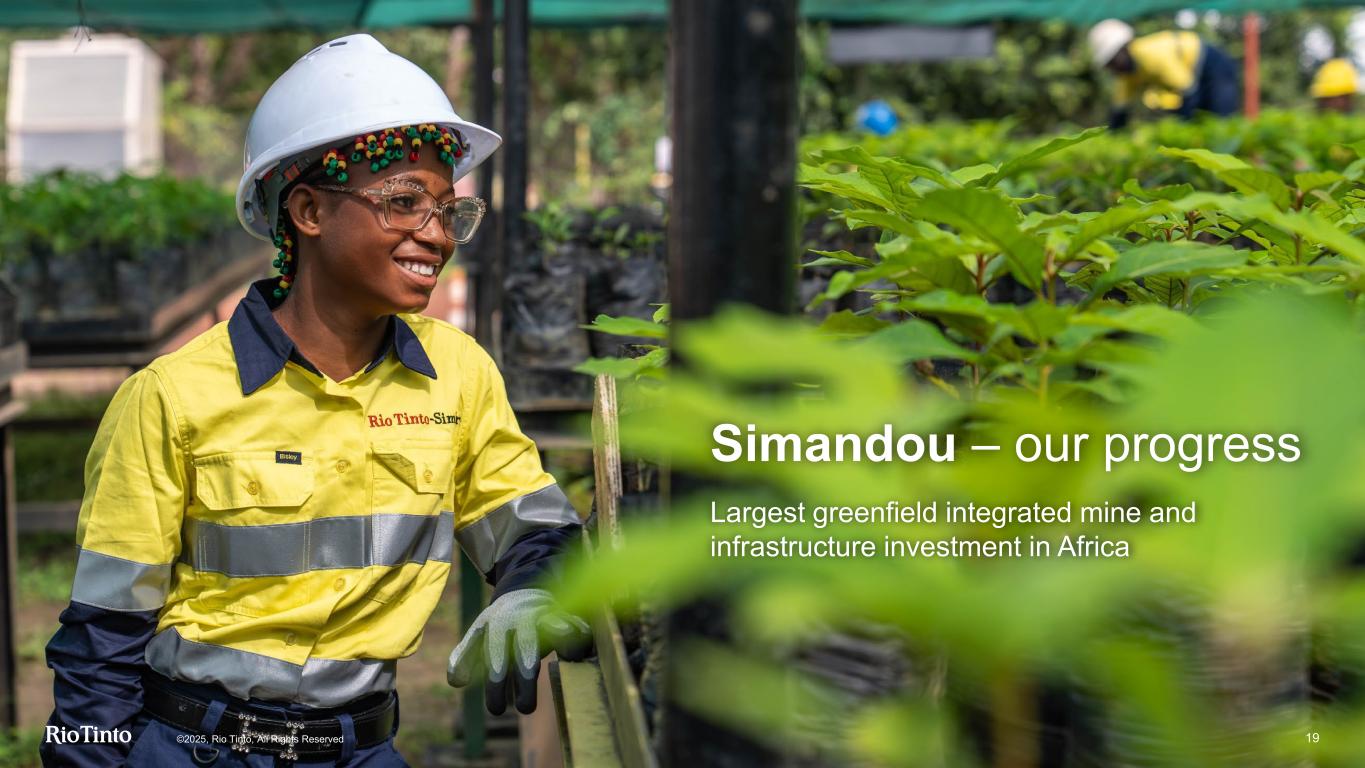 18 1 Ambition for compound annual growth rate (CAGR) for copper equivalent production from 2024 to 2033f. ©2025, Rio Tinto, All Rights Reserved Nuevo Cobre Rincon Oyu Tolgoi AP60 Salar de Maricunga Pilbara replacement projects Salares Altoandinos Resolution On track: ~3%1 CAGR production ambition 2024 – 2033f Arcadium Partner of choice, and best in class project delivery Simandou 1 Ambition for compound annual growth rate (CAGR) for copper equivalent production, incorporating lithium, from 2024 to 2033f