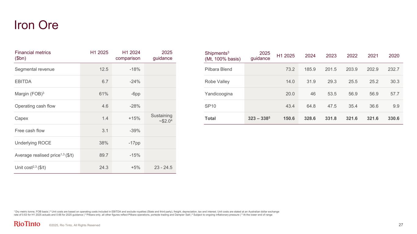 26 Simplified earnings by Business Unit for H1 2025 Atlantic Aluminium Pacific Aluminium Copper Pilbara Sales volume 1,077kt 564kt 435kt5 132.5Mt9 Average benchmark price $2,539/t $2,539/t 428c/lb6 $92/dmt10 Premiums, provisional pricing, by-product sales, product mix, other $726/t2 $319/t2 156c/lb $(2.3)/dmt Revenue per unit $3,265/t3 $2,858/t3 584c/lb $89.7/dmt Unit cost1 $2,103/t4 $2,387/t4 200c/lb7 $24.3/t Other costs per unit8 $720/t $295/t 28c/lb $15/t11 Margin per unit $442/t $176/t 356c/lb $50.4/t Total underlying EBITDA ($m) 49412 99 3,414 6,678 1 Calculated using production volumes, except for Pilbara which is based on shipments | 2 Includes Midwest premium duty paid, which was 55% of our volumes in H1 2025 and value added premiums which were 46% of the primary metal we sold | 3 Segmental revenue per Financial Information by Business Unit includes other revenue not included in the realised price | 4 Includes costs before casting | 5 Sales volume comprises Oyu Tolgoi payable copper in concentrates collected by customers from the Mongolia/China border; Escondida payable copper in concentrates and refined copper, and Kennecott refined copper | 6 Average LME | 7 C1 copper unit costs on a gross basis (excluding by-product credits) | 8 Includes net change in inventory, with the exception of Pilbara where the unit cost is already based on shipments | 9 Consolidated basis | 10 Platts (FOB) index for 62% iron fines | 11 Includes freight and royalties | 12 Includes EBITDA from Matalco ©2025, Rio Tinto, All Rights Reserved