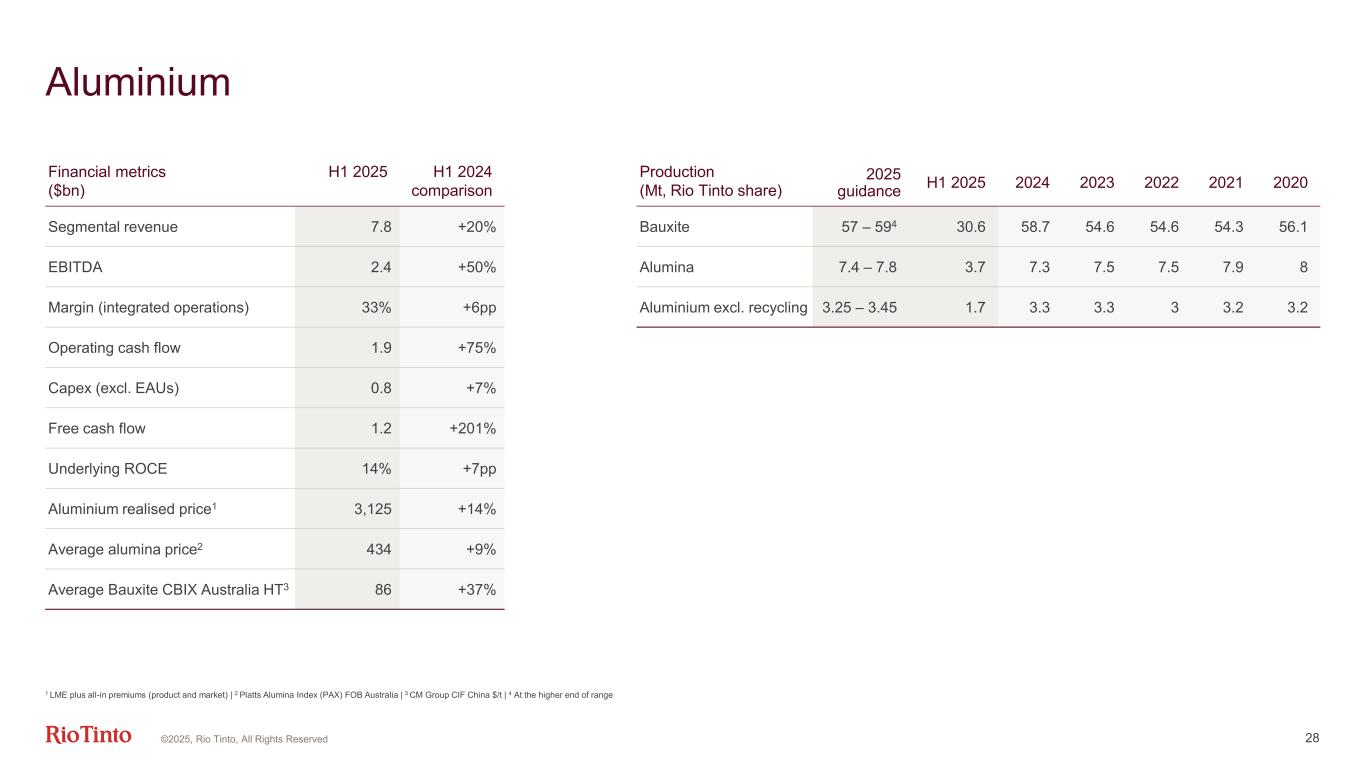 Iron Ore 27 Financial metrics ($bn) H1 2025 H1 2024 comparison 2025 guidance Segmental revenue 12.5 -18% EBITDA 6.7 -24% Margin (FOB)3 61% -6pp Operating cash flow 4.6 -28% Capex 1.4 +15% Sustaining ~$2.04 Free cash flow 3.1 -39% Underlying ROCE 38% -17pp Average realised price1,3 ($/t) 89.7 -15% Unit cost2,3 ($/t) 24.3 +5% 23 - 24.5 Shipments3 (Mt, 100% basis) 2025 guidance H1 2025 2024 2023 2022 2021 2020 Pilbara Blend 73.2 185.9 201.5 203.9 202.9 232.7 Robe Valley 14.0 31.9 29.3 25.5 25.2 30.3 Yandicoogina 20.0 46 53.5 56.9 56.9 57.7 SP10 43.4 64.8 47.5 35.4 36.6 9.9 Total 323 – 3385 150.6 328.6 331.8 321.6 321.6 330.6 1 Dry metric tonne, FOB basis | 2 Unit costs are based on operating costs included in EBITDA and exclude royalties (State and third party), freight, depreciation, tax and interest. Unit costs are stated at an Australian dollar exchange rate of 0.63 for H1 2025 actuals and 0.66 for 2025 guidance | 3 Pilbara only, all other figures reflect Pilbara operations, portside trading and Dampier Salt | 4 Subject to ongoing inflationary pressure | 5 At the lower end of range ©2025, Rio Tinto, All Rights Reserved