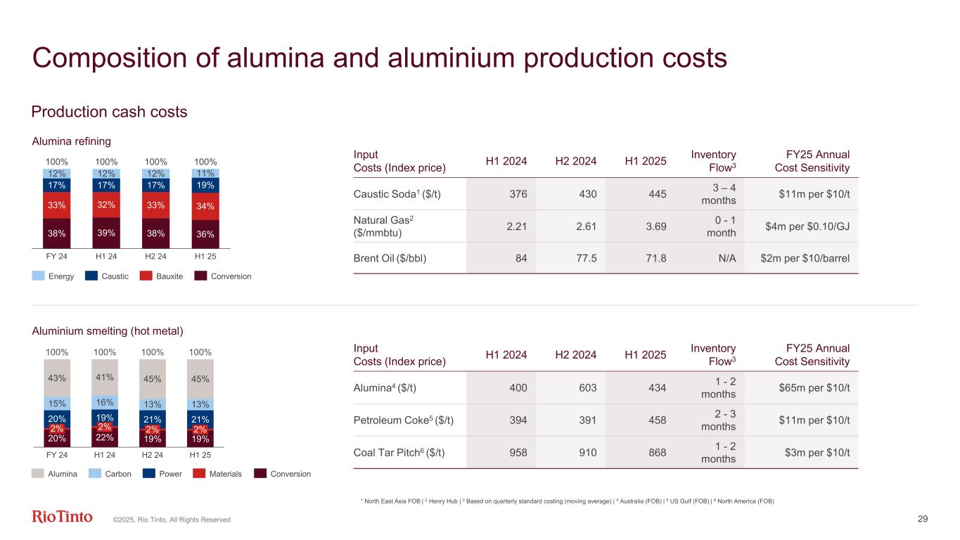 Aluminium 28 Production (Mt, Rio Tinto share) 2025 guidance H1 2025 2024 2023 2022 2021 2020 Bauxite 57 – 594 30.6 58.7 54.6 54.6 54.3 56.1 Alumina 7.4 – 7.8 3.7 7.3 7.5 7.5 7.9 8 Aluminium excl. recycling 3.25 – 3.45 1.7 3.3 3.3 3 3.2 3.2 1 LME plus all-in premiums (product and market) | 2 Platts Alumina Index (PAX) FOB Australia | 3 CM Group CIF China $/t | 4 At the higher end of range Financial metrics ($bn) H1 2025 H1 2024 comparison Segmental revenue 7.8 +20% EBITDA 2.4 +50% Margin (integrated operations) 33% +6pp Operating cash flow 1.9 +75% Capex (excl. EAUs) 0.8 +7% Free cash flow 1.2 +201% Underlying ROCE 14% +7pp Aluminium realised price1 3,125 +14% Average alumina price2 434 +9% Average Bauxite CBIX Australia HT3 86 +37% ©2025, Rio Tinto, All Rights Reserved