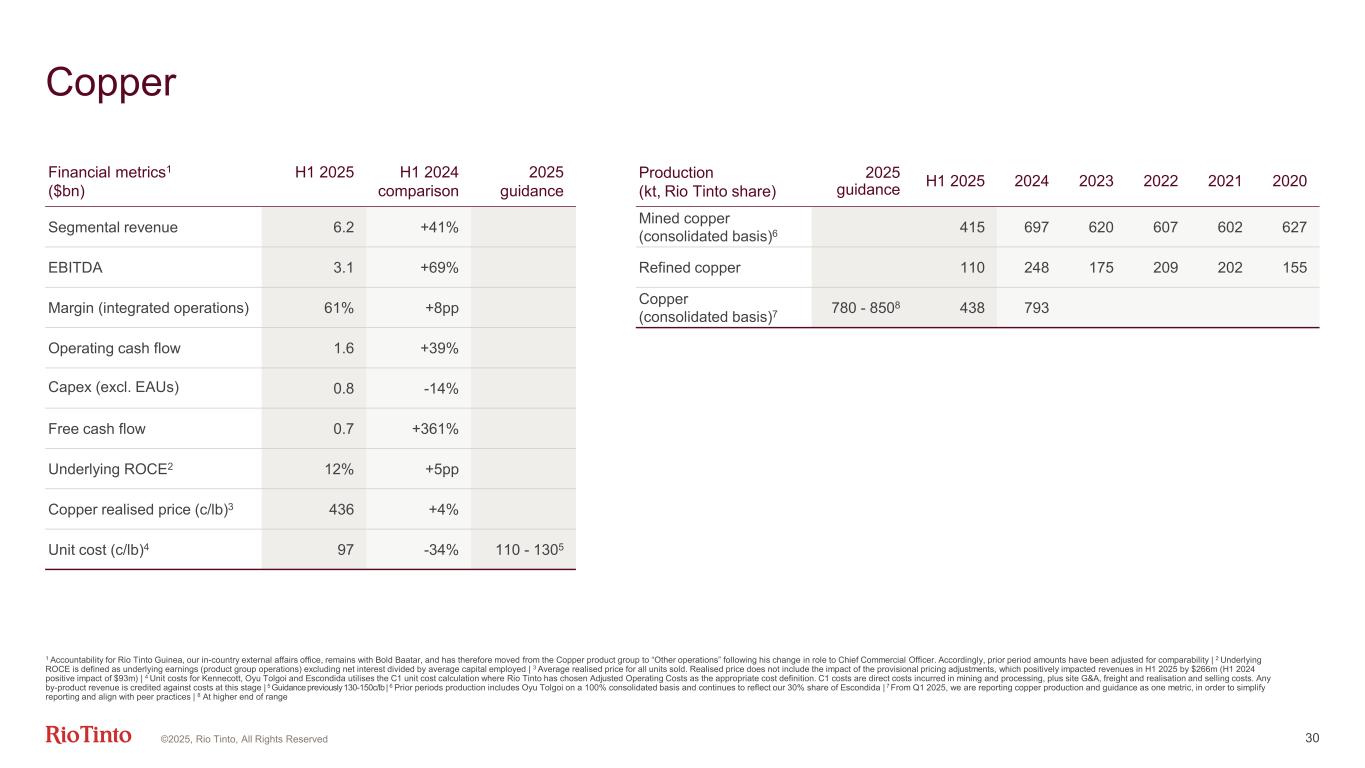 29 Composition of alumina and aluminium production costs Alumina refining Production cash costs Aluminium smelting (hot metal) Input Costs (Index price) H1 2024 H2 2024 H1 2025 Inventory Flow3 FY25 Annual Cost Sensitivity Caustic Soda1 ($/t) 376 430 445 3 – 4 months $11m per $10/t Natural Gas2 ($/mmbtu) 2.21 2.61 3.69 0 - 1 month $4m per $0.10/GJ Brent Oil ($/bbl) 84 77.5 71.8 N/A $2m per $10/barrel Input Costs (Index price) H1 2024 H2 2024 H1 2025 Inventory Flow3 FY25 Annual Cost Sensitivity Alumina4 ($/t) 400 603 434 1 - 2 months $65m per $10/t Petroleum Coke5 ($/t) 394 391 458 2 - 3 months $11m per $10/t Coal Tar Pitch6 ($/t) 958 910 868 1 - 2 months $3m per $10/t 1 North East Asia FOB | 2 Henry Hub | 3 Based on quarterly standard costing (moving average) | 4 Australia (FOB) | 5 US Gulf (FOB) | 6 North America (FOB) 38% 39% 38% 36% 33% 32% 33% 34% 17% 17% 17% 19% 12% 12% 12% 11% FY 24 H1 24 H2 24 100% 100% 100% H1 25 100% Energy Caustic Bauxite Conversion 20% 22% 19% 19% 20% 19% 21% 21% 15% 16% 13% 13% 43% 41% 45% 45% 2% FY 24 2% H1 24 2% H2 24 100% 100% 100% H1 25 100% 2% Alumina Carbon Power Materials Conversion ©2025, Rio Tinto, All Rights Reserved