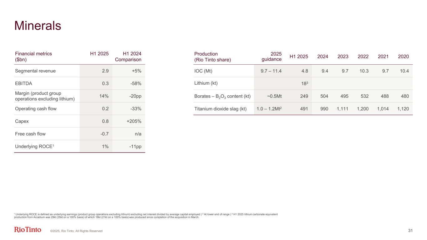 Copper 30 1 Accountability for Rio Tinto Guinea, our in-country external affairs office, remains with Bold Baatar, and has therefore moved from the Copper product group to “Other operations” following his change in role to Chief Commercial Officer. Accordingly, prior period amounts have been adjusted for comparability | 2 Underlying ROCE is defined as underlying earnings (product group operations) excluding net interest divided by average capital employed | 3 Average realised price for all units sold. Realised price does not include the impact of the provisional pricing adjustments, which positively impacted revenues in H1 2025 by $266m (H1 2024 positive impact of $93m) | 4 Unit costs for Kennecott, Oyu Tolgoi and Escondida utilises the C1 unit cost calculation where Rio Tinto has chosen Adjusted Operating Costs as the appropriate cost definition. C1 costs are direct costs incurred in mining and processing, plus site G&A, freight and realisation and selling costs. Any by-product revenue is credited against costs at this stage | 5 Guidance previously 130-150c/lb | 6 Prior periods production includes Oyu Tolgoi on a 100% consolidated basis and continues to reflect our 30% share of Escondida | 7 From Q1 2025, we are reporting copper production and guidance as one metric, in order to simplify reporting and align with peer practices | 8 At higher end of range Production (kt, Rio Tinto share) 2025 guidance H1 2025 2024 2023 2022 2021 2020 Mined copper (consolidated basis)6 415 697 620 607 602 627 Refined copper 110 248 175 209 202 155 Copper (consolidated basis)7 780 - 8508 438 793 Financial metrics1 ($bn) H1 2025 H1 2024 comparison 2025 guidance Segmental revenue 6.2 +41% EBITDA 3.1 +69% Margin (integrated operations) 61% +8pp Operating cash flow 1.6 +39% Capex (excl. EAUs) 0.8 -14% Free cash flow 0.7 +361% Underlying ROCE2 12% +5pp Copper realised price (c/lb)3 436 +4% Unit cost (c/lb)4 97 -34% 110 - 1305 ©2025, Rio Tinto, All Rights Reserved