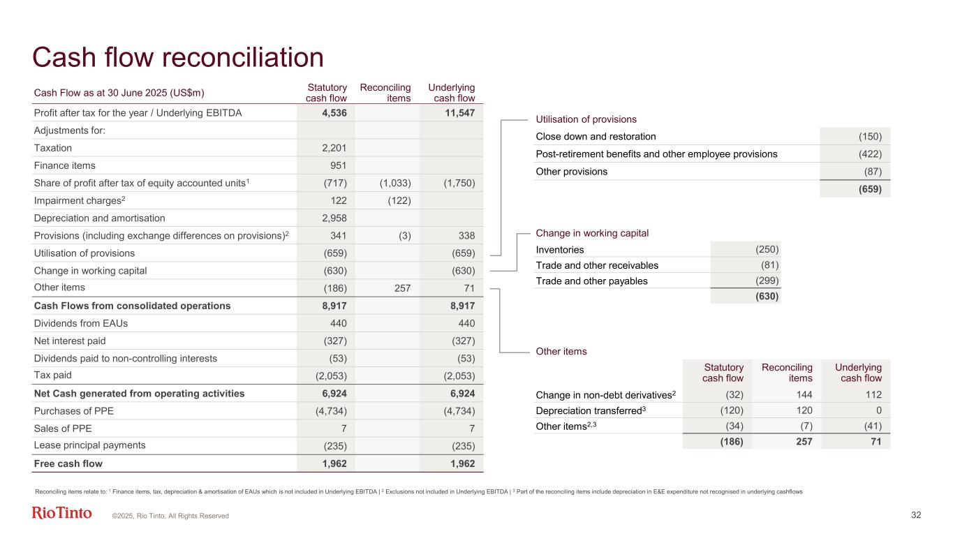 32 Cash flow reconciliation Cash Flow as at 30 June 2025 (US$m) Statutory cash flow Reconciling items Underlying cash flow Profit after tax for the year / Underlying EBITDA 4,536 11,547 Adjustments for: Taxation 2,201 Finance items 951 Share of profit after tax of equity accounted units1 (717) (1,033) (1,750) Impairment charges2 122 (122) Depreciation and amortisation 2,958 Provisions (including exchange differences on provisions)2 341 (3) 338 Utilisation of provisions (659) (659) Change in working capital (630) (630) Other items (186) 257 71 Cash Flows from consolidated operations 8,917 8,917 Dividends from EAUs 440 440 Net interest paid (327) (327) Dividends paid to non-controlling interests (53) (53) Tax paid (2,053) (2,053) Net Cash generated from operating activities 6,924 6,924 Purchases of PPE (4,734) (4,734) Sales of PPE 7 7 Lease principal payments (235) (235) Free cash flow 1,962 1,962 Utilisation of provisions Close down and restoration (150) Post-retirement benefits and other employee provisions (422) Other provisions (87) (659) Change in working capital Inventories (250) Trade and other receivables (81) Trade and other payables (299) (630) Other items Statutory cash flow Reconciling items Underlying cash flow Change in non-debt derivatives2 (32) 144 112 Depreciation transferred3 (120) 120 0 Other items2,3 (34) (7) (41) (186) 257 71 Reconciling items relate to: 1 Finance items, tax, depreciation & amortisation of EAUs which is not included in Underlying EBITDA | 2 Exclusions not included in Underlying EBITDA | 3 Part of the reconciling items include depreciation in E&E expenditure not recognised in underlying cashflows ©2025, Rio Tinto, All Rights Reserved