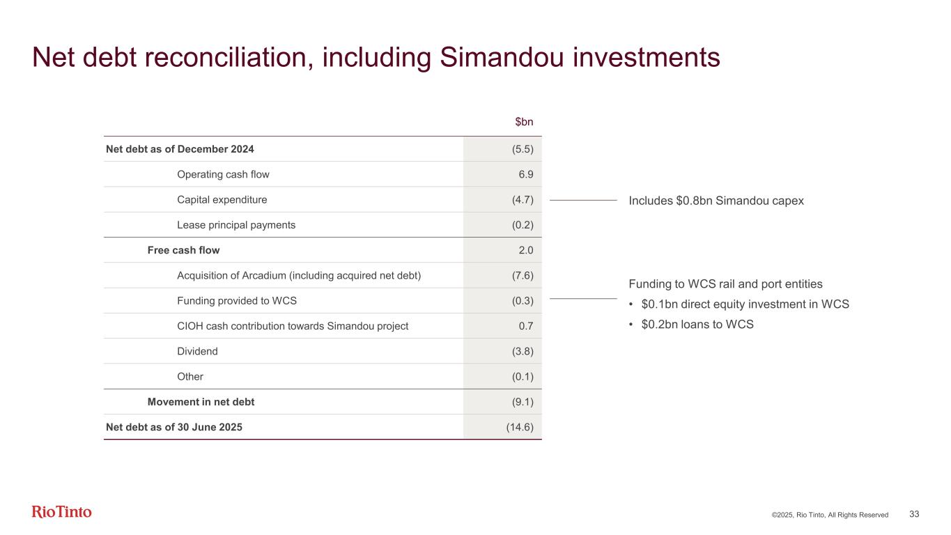 ©2025, Rio Tinto, All Rights Reserved 33 Net debt reconciliation, including Simandou investments $bn Net debt as of December 2024 (5.5) Operating cash flow 6.9 Capital expenditure (4.7) Lease principal payments (0.2) Free cash flow 2.0 Acquisition of Arcadium (including acquired net debt) (7.6) Funding provided to WCS (0.3) CIOH cash contribution towards Simandou project 0.7 Dividend (3.8) Other (0.1) Movement in net debt (9.1) Net debt as of 30 June 2025 (14.6) Includes $0.8bn Simandou capex Funding to WCS rail and port entities • $0.1bn direct equity investment in WCS • $0.2bn loans to WCS