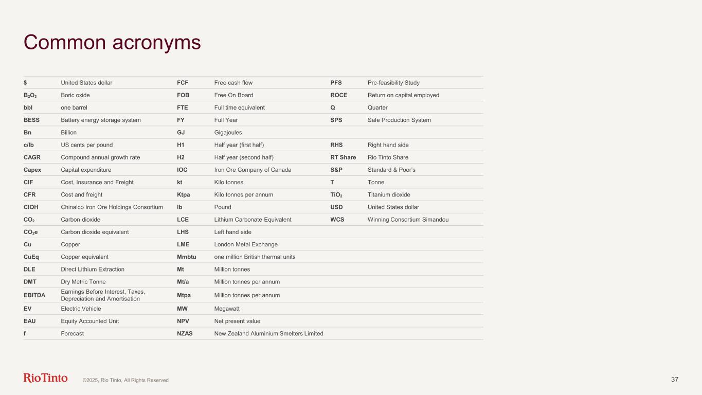 36 Group level financial guidance 2025f Mid-term (per year) Share of capital investment Total Group ~$11bn ~$10-11bn Growth capital ~$3.0bn Sustaining capital ~$4.0bn Including Pilbara sustaining1 ~$2.0bn Replacement capital ~$3-4bn Decarbonisation capital ~$0.3bn Effective tax rate ~33%2 ~30% Shareholder returns Total returns of 40 – 60% of underlying earnings through the cycle 1 Subject to ongoing inflationary pressure | 2 ~33% effective tax rate on underlying earnings is expected for 2025 (previously ~30%) driven by the higher effective tax rate in H1 where there was a higher proportion of profits from higher tax jurisdictions and unrecognised deferred tax assets. The effective tax rate is expected to return to ~30% from 2026 ©2025, Rio Tinto, All Rights Reserved