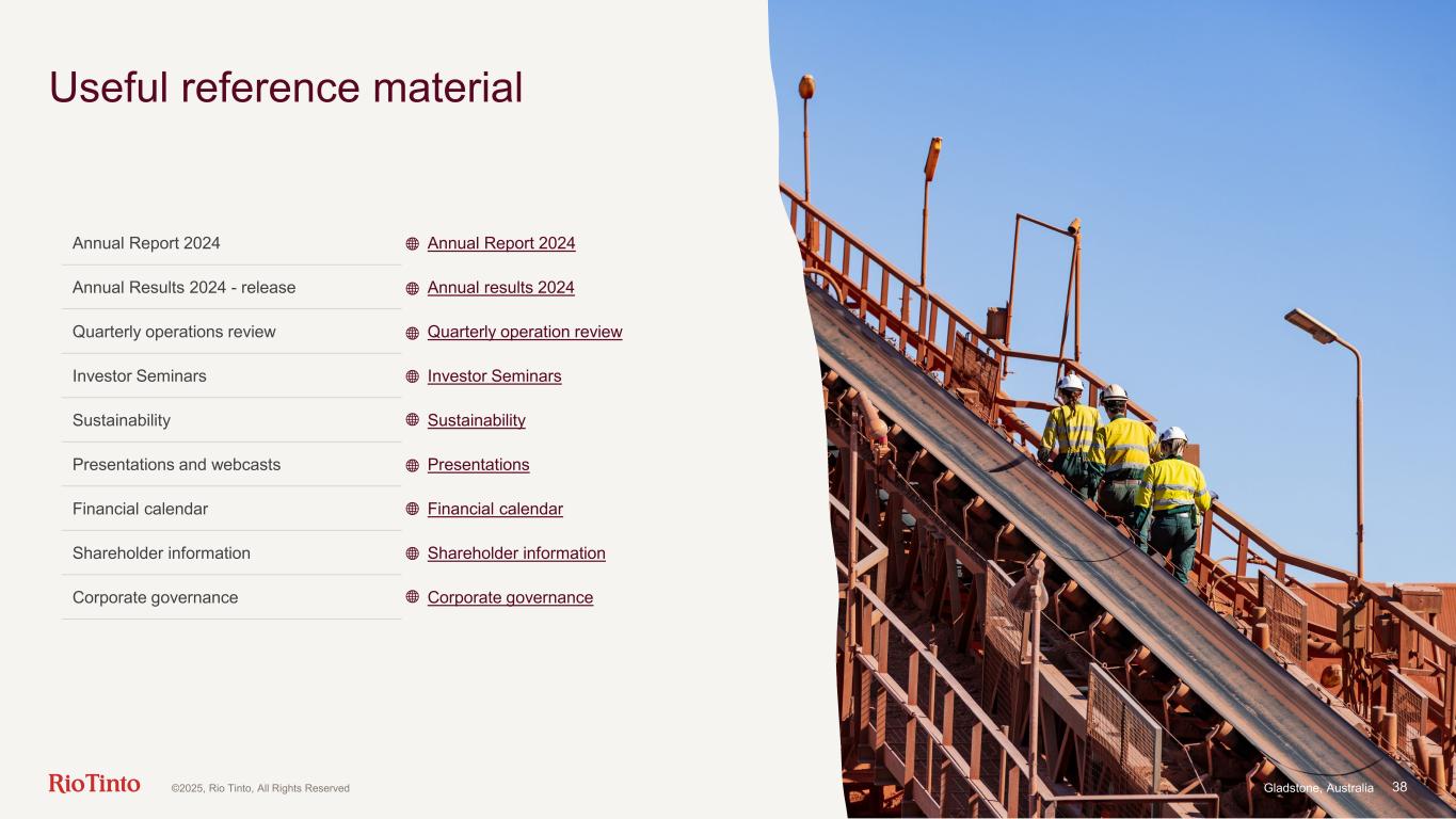 38 Useful reference material Annual Report 2024 Annual Report 2024 Annual Results 2024 - release Annual results 2024 Quarterly operations review Quarterly operation review Investor Seminars Investor Seminars Sustainability Sustainability Presentations and webcasts Presentations Financial calendar Financial calendar Shareholder information Shareholder information Corporate governance Corporate governance Gladstone, Australia©2025, Rio Tinto, All Rights Reserved