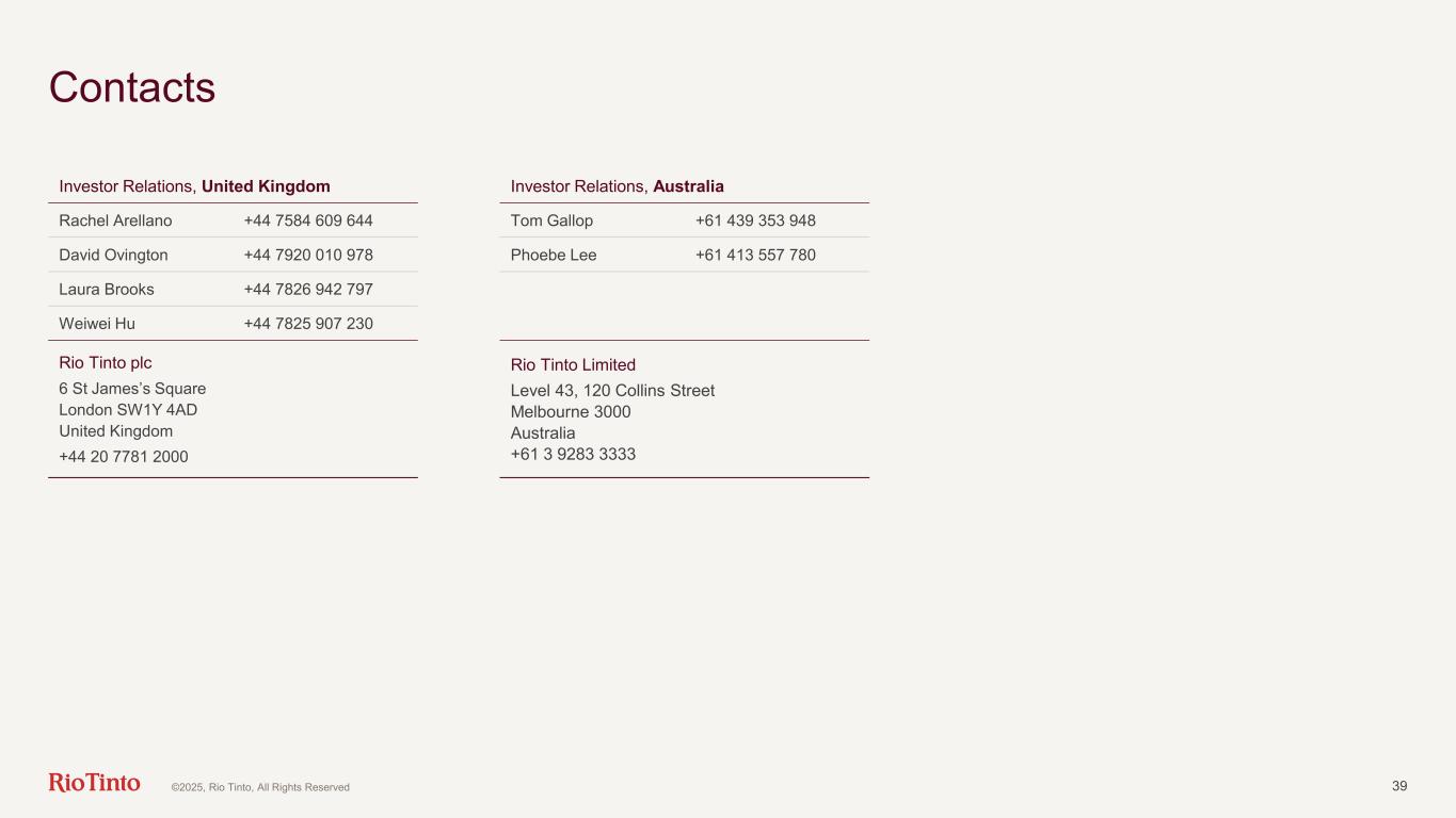 39 Contacts ©2025, Rio Tinto, All Rights Reserved Investor Relations, United Kingdom Rachel Arellano +44 7584 609 644 David Ovington +44 7920 010 978 Laura Brooks +44 7826 942 797 Weiwei Hu +44 7825 907 230 Rio Tinto plc 6 St James’s Square London SW1Y 4AD United Kingdom +44 20 7781 2000 Investor Relations, Australia Tom Gallop +61 439 353 948 Phoebe Lee +61 413 557 780 Rio Tinto Limited Level 43, 120 Collins Street Melbourne 3000 Australia +61 3 9283 3333