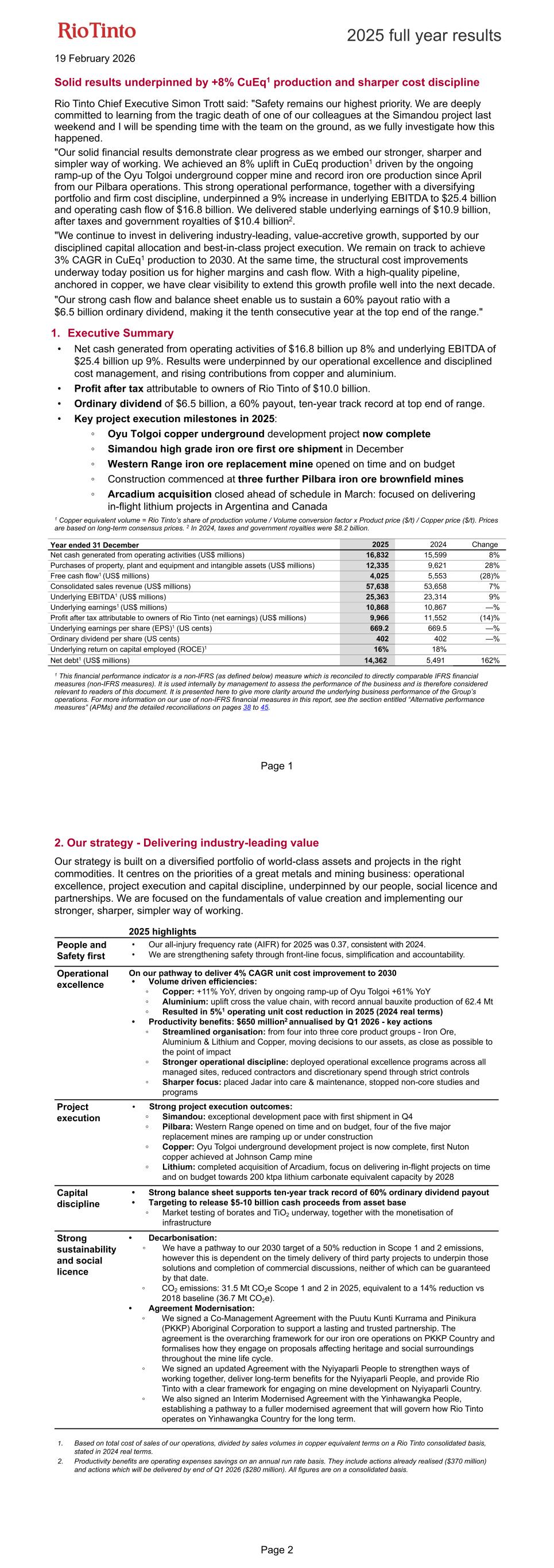 19 February 2026 Solid results underpinned by +8% CuEq1 production and sharper cost discipline Rio Tinto Chief Executive Simon Trott said: "Safety remains our highest priority. We are deeply committed to learning from the tragic death of one of our colleagues at the Simandou project last weekend and I will be spending time with the team on the ground, as we fully investigate how this happened. "Our solid financial results demonstrate clear progress as we embed our stronger, sharper and simpler way of working. We achieved an 8% uplift in CuEq production1 driven by the ongoing ramp-up of the Oyu Tolgoi underground copper mine and record iron ore production since April from our Pilbara operations. This strong operational performance, together with a diversifying portfolio and firm cost discipline, underpinned a 9% increase in underlying EBITDA to $25.4 billion and operating cash flow of $16.8 billion. We delivered stable underlying earnings of $10.9 billion, after taxes and government royalties of $10.4 billion2. "We continue to invest in delivering industry-leading, value-accretive growth, supported by our disciplined capital allocation and best-in-class project execution. We remain on track to achieve 3% CAGR in CuEq1 production to 2030. At the same time, the structural cost improvements underway today position us for higher margins and cash flow. With a high-quality pipeline, anchored in copper, we have clear visibility to extend this growth profile well into the next decade. "Our strong cash flow and balance sheet enable us to sustain a 60% payout ratio with a $6.5 billion ordinary dividend, making it the tenth consecutive year at the top end of the range." 1. Executive Summary • Net cash generated from operating activities of $16.8 billion up 8% and underlying EBITDA of $25.4 billion up 9%. Results were underpinned by our operational excellence and disciplined cost management, and rising contributions from copper and aluminium. • Profit after tax attributable to owners of Rio Tinto of $10.0 billion. • Ordinary dividend of $6.5 billion, a 60% payout, ten-year track record at top end of range. • Key project execution milestones in 2025: ◦ Oyu Tolgoi copper underground development project now complete ◦ Simandou high grade iron ore first ore shipment in December ◦ Western Range iron ore replacement mine opened on time and on budget ◦ Construction commenced at three further Pilbara iron ore brownfield mines ◦ Arcadium acquisition closed ahead of schedule in March: focused on delivering in-flight lithium projects in Argentina and Canada 1 Copper equivalent volume = Rio Tinto’s share of production volume / Volume conversion factor x Product price ($/t) / Copper price ($/t). Prices are based on long-term consensus prices. 2 In 2024, taxes and government royalties were $8.2 billion. Year ended 31 December 2025 2024 Change Net cash generated from operating activities (US$ millions) 16,832 15,599 8 % Purchases of property, plant and equipment and intangible assets (US$ millions) 12,335 9,621 28 % Free cash flow1 (US$ millions) 4,025 5,553 (28) % Consolidated sales revenue (US$ millions) 57,638 53,658 7 % Underlying EBITDA1 (US$ millions) 25,363 23,314 9 % Underlying earnings1 (US$ millions) 10,868 10,867 — % Profit after tax attributable to owners of Rio Tinto (net earnings) (US$ millions) 9,966 11,552 (14) % Underlying earnings per share (EPS)1 (US cents) 669.2 669.5 — % Ordinary dividend per share (US cents) 402 402 — % Underlying return on capital employed (ROCE)1 16% 18% Net debt1 (US$ millions) 14,362 5,491 162 % 1 This financial performance indicator is a non-IFRS (as defined below) measure which is reconciled to directly comparable IFRS financial measures (non-IFRS measures). It is used internally by management to assess the performance of the business and is therefore considered relevant to readers of this document. It is presented here to give more clarity around the underlying business performance of the Group’s operations. For more information on our use of non-IFRS financial measures in this report, see the section entitled “Alternative performance measures” (APMs) and the detailed reconciliations on pages 38 to 45. 2025 full year results Page 1 2. Our strategy - Delivering industry-leading value Our strategy is built on a diversified portfolio of world-class assets and projects in the right commodities. It centres on the priorities of a great metals and mining business: operational excellence, project execution and capital discipline, underpinned by our people, social licence and partnerships. We are focused on the fundamentals of value creation and implementing our stronger, sharper, simpler way of working. 2025 highlights People and Safety first • Our all-injury frequency rate (AIFR) for 2025 was 0.37, consistent with 2024. • We are strengthening safety through front-line focus, simplification and accountability. Operational excellence On our pathway to deliver 4% CAGR unit cost improvement to 2030 • Volume driven efficiencies: ◦ Copper: +11% YoY, driven by ongoing ramp-up of Oyu Tolgoi +61% YoY ◦ Aluminium: uplift cross the value chain, with record annual bauxite production of 62.4 Mt ◦ Resulted in 5%1 operating unit cost reduction in 2025 (2024 real terms) • Productivity benefits: $650 million2 annualised by Q1 2026 - key actions ◦ Streamlined organisation: from four into three core product groups - Iron Ore, Aluminium & Lithium and Copper, moving decisions to our assets, as close as possible to the point of impact ◦ Stronger operational discipline: deployed operational excellence programs across all managed sites, reduced contractors and discretionary spend through strict controls ◦ Sharper focus: placed Jadar into care & maintenance, stopped non-core studies and programs Project execution • Strong project execution outcomes: ◦ Simandou: exceptional development pace with first shipment in Q4 ◦ Pilbara: Western Range open