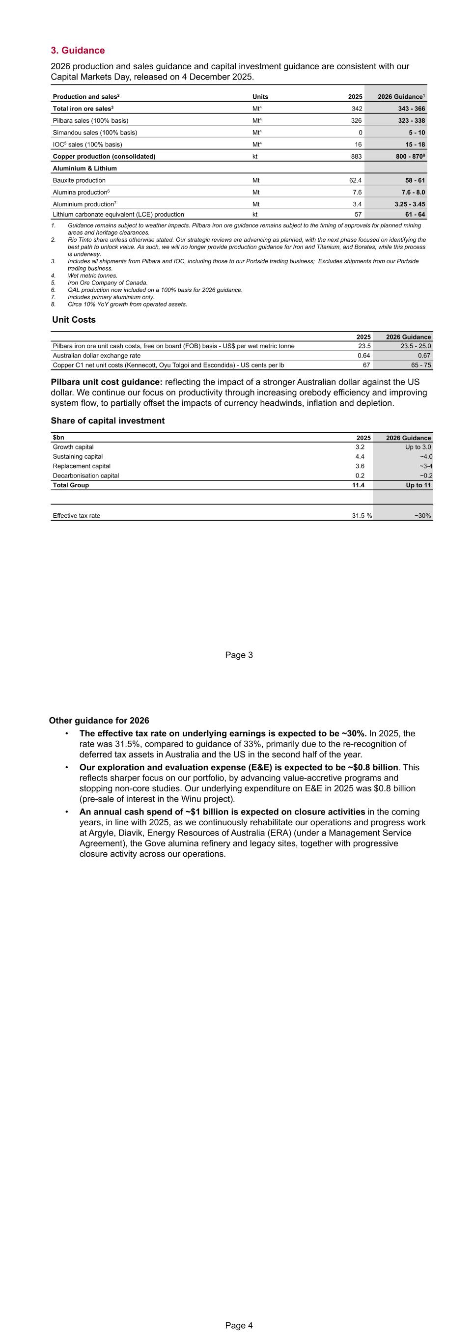 3. Guidance 2026 production and sales guidance and capital investment guidance are consistent with our Capital Markets Day, released on 4 December 2025. Production and sales2 Units 2025 2026 Guidance1 Total iron ore sales3 Mt4 342 343 - 366 Pilbara sales (100% basis) Mt4 326 323 - 338 Simandou sales (100% basis) Mt4 0 5 - 10 IOC5 sales (100% basis) Mt4 16 15 - 18 Copper production (consolidated) kt 883 800 - 8708 Aluminium & Lithium Bauxite production Mt 62.4 58 - 61 Alumina production6 Mt 7.6 7.6 - 8.0 Aluminium production7 Mt 3.4 3.25 - 3.45 Lithium carbonate equivalent (LCE) production kt 57 61 - 64 1. Guidance remains subject to weather impacts. Pilbara iron ore guidance remains subject to the timing of approvals for planned mining areas and heritage clearances. 2. Rio Tinto share unless otherwise stated. Our strategic reviews are advancing as planned, with the next phase focused on identifying the best path to unlock value. As such, we will no longer provide production guidance for Iron and Titanium, and Borates, while this process is underway. 3. Includes all shipments from Pilbara and IOC, including those to our Portside trading business; Excludes shipments from our Portside trading business. 4. Wet metric tonnes. 5. Iron Ore Company of Canada. 6. QAL production now included on a 100% basis for 2026 guidance. 7. Includes primary aluminium only. 8. Circa 10% YoY growth from operated assets. Unit Costs 2025 2026 Guidance Pilbara iron ore unit cash costs, free on board (FOB) basis - US$ per wet metric tonne 23.5 23.5 - 25.0 Australian dollar exchange rate 0.64 0.67 Copper C1 net unit costs (Kennecott, Oyu Tolgoi and Escondida) - US cents per lb 67 65 - 75 Pilbara unit cost guidance: reflecting the impact of a stronger Australian dollar against the US dollar. We continue our focus on productivity through increasing orebody efficiency and improving system flow, to partially offset the impacts of currency headwinds, inflation and depletion. Share of capital investment $bn 2025 2026 Guidance Growth capital 3.2 Up to 3.0 Sustaining capital 4.4 ~4.0 Replacement capital 3.6 ~3-4 Decarbonisation capital 0.2 ~0.2 Total Group 11.4 Up to 11 Effective tax rate 31.5 % ~30% Page 3 Other guidance for 2026 • The effective tax rate on underlying earnings is expected to be ~30%. In 2025, the rate was 31.5%, compared to guidance of 33%, primarily due to the re-recognition of deferred tax assets in Australia and the US in the second half of the year. • Our exploration and evaluation expense (E&E) is expected to be ~$0.8 billion. This reflects sharper focus on our portfolio, by advancing value-accretive programs and stopping non-core studies. Our underlying expenditure on E&E in 2025 was $0.8 billion (pre-sale of interest in the Winu project). • An annual cash spend of ~$1 billion is expected on closure activities in the coming years, in line with 2025, as we continuously rehabilitate our operations and progress work at Argyle, Diavik, Energy Resources of Australia (ERA) (under a Management Service Agreement), the Gove alumina refinery and legacy sites, together with progressive closure activity across our operations. Page 4