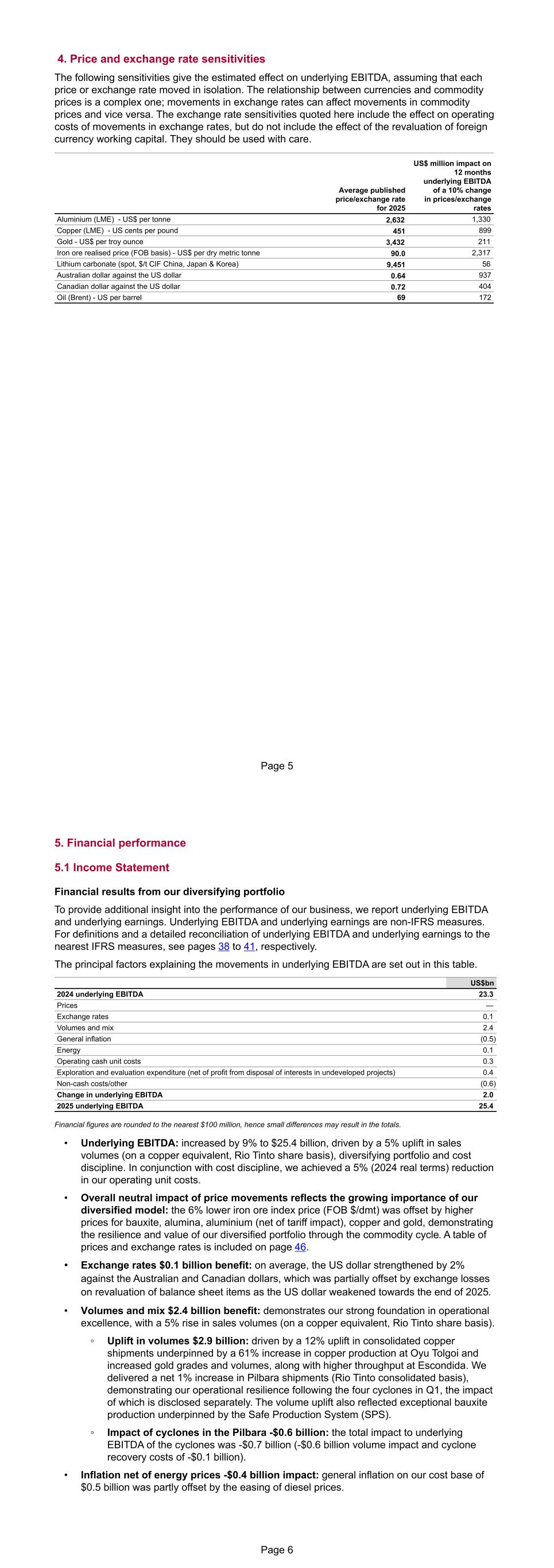 4. Price and exchange rate sensitivities The following sensitivities give the estimated effect on underlying EBITDA, assuming that each price or exchange rate moved in isolation. The relationship between currencies and commodity prices is a complex one; movements in exchange rates can affect movements in commodity prices and vice versa. The exchange rate sensitivities quoted here include the effect on operating costs of movements in exchange rates, but do not include the effect of the revaluation of foreign currency working capital. They should be used with care. Average published price/exchange rate for 2025 US$ million impact on 12 months underlying EBITDA of a 10% change in prices/exchange rates Aluminium (LME) - US$ per tonne 2,632 1,330 Copper (LME) - US cents per pound 451 899 Gold - US$ per troy ounce 3,432 211 Iron ore realised price (FOB basis) - US$ per dry metric tonne 90.0 2,317 Lithium carbonate (spot, $/t CIF China, Japan & Korea) 9,451 56 Australian dollar against the US dollar 0.64 937 Canadian dollar against the US dollar 0.72 404 Oil (Brent) - US per barrel 69 172 Page 5 5. Financial performance 5.1 Income Statement Financial results from our diversifying portfolio To provide additional insight into the performance of our business, we report underlying EBITDA and underlying earnings. Underlying EBITDA and underlying earnings are non-IFRS measures. For definitions and a detailed reconciliation of underlying EBITDA and underlying earnings to the nearest IFRS measures, see pages 38 to 41, respectively. The principal factors explaining the movements in underlying EBITDA are set out in this table. US$bn 2024 underlying EBITDA 23.3 Prices — Exchange rates 0.1 Volumes and mix 2.4 General inflation (0.5) Energy 0.1 Operating cash unit costs 0.3 Exploration and evaluation expenditure (net of profit from disposal of interests in undeveloped projects) 0.4 Non-cash costs/other (0.6) Change in underlying EBITDA 2.0 2025 underlying EBITDA 25.4 Financial figures are rounded to the nearest $100 million, hence small differences may result in the totals. • Underlying EBITDA: increased by 9% to $25.4 billion, driven by a 5% uplift in sales volumes (on a copper equivalent, Rio Tinto share basis), diversifying portfolio and cost discipline. In conjunction with cost discipline, we achieved a 5% (2024 real terms) reduction in our operating unit costs. • Overall neutral impact of price movements reflects the growing importance of our diversified model: the 6% lower iron ore index price (FOB $/dmt) was offset by higher prices for bauxite, alumina, aluminium (net of tariff impact), copper and gold, demonstrating the resilience and value of our diversified portfolio through the commodity cycle. A table of prices and exchange rates is included on page 46. • Exchange rates $0.1 billion benefit: on average, the US dollar strengthened by 2% against the Australian and Canadian dollars, which was partially offset by exchange losses on revaluation of balance sheet items as the US dollar weakened towards the end of 2025. • Volumes and mix $2.4 billion benefit: demonstrates our strong foundation in operational excellence, with a 5% rise in sales volumes (on a copper equivalent, Rio Tinto share basis). ◦ Uplift in volumes $2.9 billion: driven by a 12% uplift in consolidated copper shipments underpinned by a 61% increase in copper production at Oyu Tolgoi and increased gold grades and volumes, along with higher throughput at Escondida. We delivered a net 1% increase in Pilbara shipments (Rio Tinto consolidated basis), demonstrating our operational resilience following the four cyclones in Q1, the impact of which is disclosed separately. The volume uplift also reflected exceptional bauxite production underpinned by the Safe Production System (SPS). ◦ Impact of cyclones in the Pilbara -$0.6 billion: the total impact to underlying EBITDA of the cyclones was -$0.7 billion (-$0.6 billion volume impact and cyclone recovery costs of -$0.1 billion). • Inflation net of energy prices -$0.4 billion impact: general inflation on our cost base of $0.5 billion was partly offset by the easing of diesel prices. Page 6