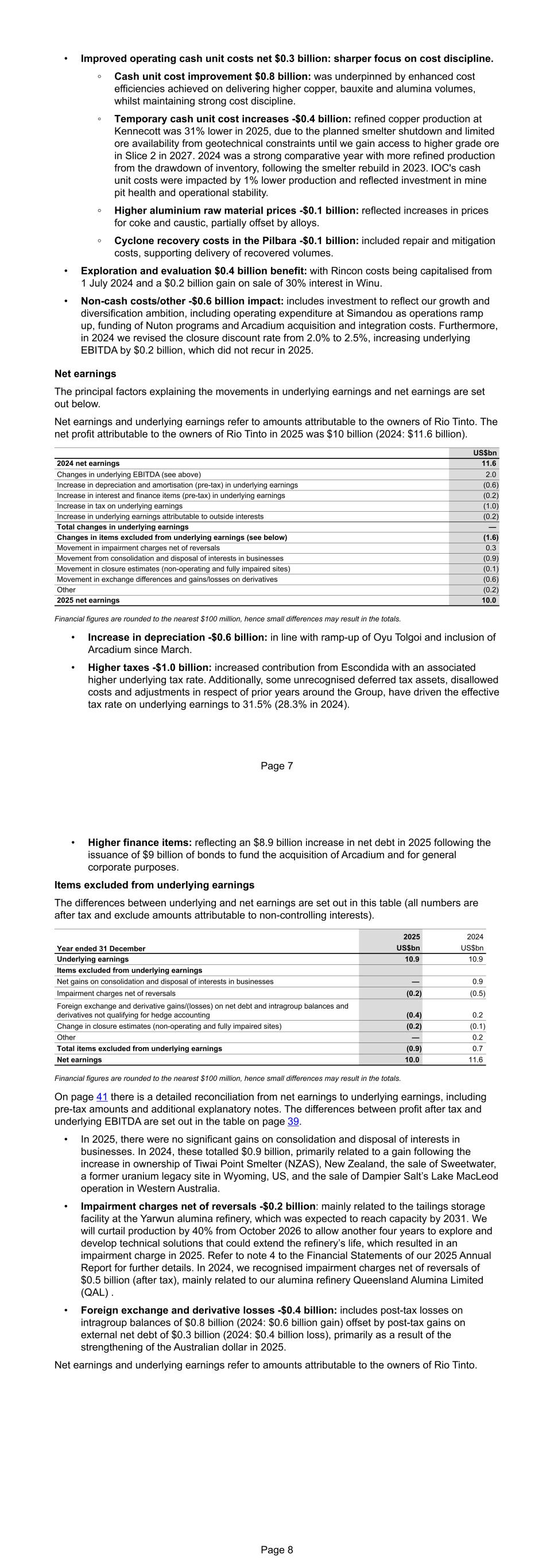 • Improved operating cash unit costs net $0.3 billion: sharper focus on cost discipline. ◦ Cash unit cost improvement $0.8 billion: was underpinned by enhanced cost efficiencies achieved on delivering higher copper, bauxite and alumina volumes, whilst maintaining strong cost discipline. ◦ Temporary cash unit cost increases -$0.4 billion: refined copper production at Kennecott was 31% lower in 2025, due to the planned smelter shutdown and limited ore availability from geotechnical constraints until we gain access to higher grade ore in Slice 2 in 2027. 2024 was a strong comparative year with more refined production from the drawdown of inventory, following the smelter rebuild in 2023. IOC's cash unit costs were impacted by 1% lower production and reflected investment in mine pit health and operational stability. ◦ Higher aluminium raw material prices -$0.1 billion: reflected increases in prices for coke and caustic, partially offset by alloys. ◦ Cyclone recovery costs in the Pilbara -$0.1 billion: included repair and mitigation costs, supporting delivery of recovered volumes. • Exploration and evaluation $0.4 billion benefit: with Rincon costs being capitalised from 1 July 2024 and a $0.2 billion gain on sale of 30% interest in Winu. • Non-cash costs/other -$0.6 billion impact: includes investment to reflect our growth and diversification ambition, including operating expenditure at Simandou as operations ramp up, funding of Nuton programs and Arcadium acquisition and integration costs. Furthermore, in 2024 we revised the closure discount rate from 2.0% to 2.5%, increasing underlying EBITDA by $0.2 billion, which did not recur in 2025. Net earnings The principal factors explaining the movements in underlying earnings and net earnings are set out below. Net earnings and underlying earnings refer to amounts attributable to the owners of Rio Tinto. The net profit attributable to the owners of Rio Tinto in 2025 was $10 billion (2024: $11.6 billion). US$bn 2024 net earnings 11.6 Changes in underlying EBITDA (see above) 2.0 Increase in depreciation and amortisation (pre-tax) in underlying earnings (0.6) Increase in interest and finance items (pre-tax) in underlying earnings (0.2) Increase in tax on underlying earnings (1.0) Increase in underlying earnings attributable to outside interests (0.2) Total changes in underlying earnings — Changes in items excluded from underlying earnings (see below) (1.6) Movement in impairment charges net of reversals 0.3 Movement from consolidation and disposal of interests in businesses (0.9) Movement in closure estimates (non-operating and fully impaired sites) (0.1) Movement in exchange differences and gains/losses on derivatives (0.6) Other (0.2) 2025 net earnings 10.0 Financial figures are rounded to the nearest $100 million, hence small differences may result in the totals. • Increase in depreciation -$0.6 billion: in line with ramp-up of Oyu Tolgoi and inclusion of Arcadium since March. • Higher taxes -$1.0 billion: increased contribution from Escondida with an associated higher underlying tax rate. Additionally, some unrecognised deferred tax assets, disallowed costs and adjustments in respect of prior years around the Group, have driven the effective tax rate on underlying earnings to 31.5% (28.3% in 2024). Page 7 • Higher finance items: reflecting an $8.9 billion increase in net debt in 2025 following the issuance of $9 billion of bonds to fund the acquisition of Arcadium and for general corporate purposes. Items excluded from underlying earnings The differences between underlying and net earnings are set out in this table (all numbers are after tax and exclude amounts attributable to non-controlling interests). 2025 2024 Year ended 31 December US$bn US$bn Underlying earnings 10.9 10.9 Items excluded from underlying earnings Net gains on consolidation and disposal of interests in businesses — 0.9 Impairment charges net of reversals (0.2) (0.5) Foreign exchange and derivative gains/(losses) on net debt and intragroup balances and derivatives not qualifying for hedge accounting (0.4) 0.2 Change in closure estimates (non-operating and fully impaired sites) (0.2) (0.1) Other — 0.2 Total items excluded from underlying earnings (0.9) 0.7 Net earnings 10.0 11.6 Financial figures are rounded to the nearest $100 million, hence small differences may result in the totals. On page 41 there is a detailed reconciliation from net earnings to underlying earnings, including pre-tax amounts and additional explanatory notes. The differences between profit after tax and underlying EBITDA are set out in the table on page 39. • In 2025, there were no significant gains on consolidation and disposal of interests in businesses. In 2024, these totalled $0.9 billion, primarily related to a gain following the increase in ownership of Tiwai Point Smelter (NZAS), New Zealand, the sale of Sweetwater, a former uranium legacy site in Wyoming, US, and the sale of Dampier Salt’s Lake MacLeod operation in Western Australia. • Impairment charges net of reversals -$0.2 billion: mainly related to the tailings storage facility at the Yarwun alumina refinery, which was expected to reach capacity by 2031. We will curtail production by 40% from October 2026 to allow another four years to explore and develop technical solutions that could extend the refinery’s life, which resulted in an impairment charge in 2025. Refer to note 4 to the Financial Statements of our 2025 Annual Report for further details. In 2024, we recognised impairment charges net of reversals of $0.5 billion (after tax), mainly related to our alumina refinery Queensland Alumina Limited (QAL) . • Foreign exchange and derivative losses -$0.4 billion: includes post-tax losses on intragroup balances of $0.8 billion (2024: $0.6 billion gain) offset by post-tax gains on external net debt of $0.3 billion (2024: $0.4 billion loss), primarily as a result of the strengthening of the Australian dollar in 