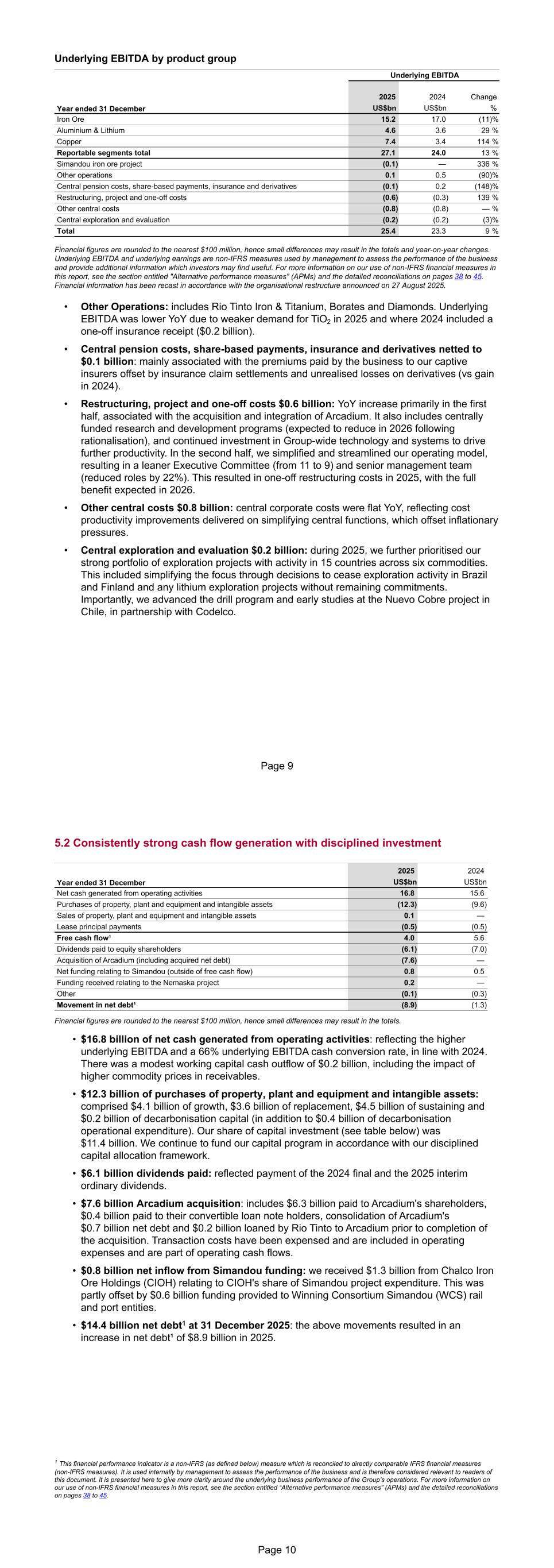 Underlying EBITDA by product group Underlying EBITDA 2025 2024 Change Year ended 31 December US$bn US$bn % Iron Ore 15.2 17.0 (11) % Aluminium & Lithium 4.6 3.6 29 % Copper 7.4 3.4 114 % Reportable segments total 27.1 24.0 13 % Simandou iron ore project (0.1) — 336 % Other operations 0.1 0.5 (90) % Central pension costs, share-based payments, insurance and derivatives (0.1) 0.2 (148) % Restructuring, project and one-off costs (0.6) (0.3) 139 % Other central costs (0.8) (0.8) — % Central exploration and evaluation (0.2) (0.2) (3) % Total 25.4 23.3 9 % Financial figures are rounded to the nearest $100 million, hence small differences may result in the totals and year-on-year changes. Underlying EBITDA and underlying earnings are non-IFRS measures used by management to assess the performance of the business and provide additional information which investors may find useful. For more information on our use of non-IFRS financial measures in this report, see the section entitled "Alternative performance measures" (APMs) and the detailed reconciliations on pages 38 to 45. Financial information has been recast in accordance with the organisational restructure announced on 27 August 2025. • Other Operations: includes Rio Tinto Iron & Titanium, Borates and Diamonds. Underlying EBITDA was lower YoY due to weaker demand for TiO2 in 2025 and where 2024 included a one-off insurance receipt ($0.2 billion). • Central pension costs, share-based payments, insurance and derivatives netted to $0.1 billion: mainly associated with the premiums paid by the business to our captive insurers offset by insurance claim settlements and unrealised losses on derivatives (vs gain in 2024). • Restructuring, project and one-off costs $0.6 billion: YoY increase primarily in the first half, associated with the acquisition and integration of Arcadium. It also includes centrally funded research and development programs (expected to reduce in 2026 following rationalisation), and continued investment in Group-wide technology and systems to drive further productivity. In the second half, we simplified and streamlined our operating model, resulting in a leaner Executive Committee (from 11 to 9) and senior management team (reduced roles by 22%). This resulted in one-off restructuring costs in 2025, with the full benefit expected in 2026. • Other central costs $0.8 billion: central corporate costs were flat YoY, reflecting cost productivity improvements delivered on simplifying central functions, which offset inflationary pressures. • Central exploration and evaluation $0.2 billion: during 2025, we further prioritised our strong portfolio of exploration projects with activity in 15 countries across six commodities. This included simplifying the focus through decisions to cease exploration activity in Brazil and Finland and any lithium exploration projects without remaining commitments. Importantly, we advanced the drill program and early studies at the Nuevo Cobre project in Chile, in partnership with Codelco. Page 9 5.2 Consistently strong cash flow generation with disciplined investment 2025 2024 Year ended 31 December US$bn US$bn Net cash generated from operating activities 16.8 15.6 Purchases of property, plant and equipment and intangible assets (12.3) (9.6) Sales of property, plant and equipment and intangible assets 0.1 — Lease principal payments (0.5) (0.5) Free cash flow¹ 4.0 5.6 Dividends paid to equity shareholders (6.1) (7.0) Acquisition of Arcadium (including acquired net debt) (7.6) — Net funding relating to Simandou (outside of free cash flow) 0.8 0.5 Funding received relating to the Nemaska project 0.2 — Other (0.1) (0.3) Movement in net debt¹ (8.9) (1.3) Financial figures are rounded to the nearest $100 million, hence small differences may result in the totals. • $16.8 billion of net cash generated from operating activities: reflecting the higher underlying EBITDA and a 66% underlying EBITDA cash conversion rate, in line with 2024. There was a modest working capital cash outflow of $0.2 billion, including the impact of higher commodity prices in receivables. • $12.3 billion of purchases of property, plant and equipment and intangible assets: comprised $4.1 billion of growth, $3.6 billion of replacement, $4.5 billion of sustaining and $0.2 billion of decarbonisation capital (in addition to $0.4 billion of decarbonisation operational expenditure). Our share of capital investment (see table below) was $11.4 billion. We continue to fund our capital program in accordance with our disciplined capital allocation framework. • $6.1 billion dividends paid: reflected payment of the 2024 final and the 2025 interim ordinary dividends. • $7.6 billion Arcadium acquisition: includes $6.3 billion paid to Arcadium's shareholders, $0.4 billion paid to their convertible loan note holders, consolidation of Arcadium's $0.7 billion net debt and $0.2 billion loaned by Rio Tinto to Arcadium prior to completion of the acquisition. Transaction costs have been expensed and are included in operating expenses and are part of operating cash flows. • $0.8 billion net inflow from Simandou funding: we received $1.3 billion from Chalco Iron Ore Holdings (CIOH) relating to CIOH's share of Simandou project expenditure. This was partly offset by $0.6 billion funding provided to Winning Consortium Simandou (WCS) rail and port entities. • $14.4 billion net debt1 at 31 December 2025: the above movements resulted in an increase in net debt¹ of $8.9 billion in 2025. 1 This financial performance indicator is a non-IFRS (as defined below) measure which is reconciled to directly comparable IFRS financial measures (non-IFRS measures). It is used internally by management to assess the performance of the business and is therefore considered relevant to readers of this document. It is presented here to give more clarity around the underlying business performance of the Group’s operations. For more information on our use of non