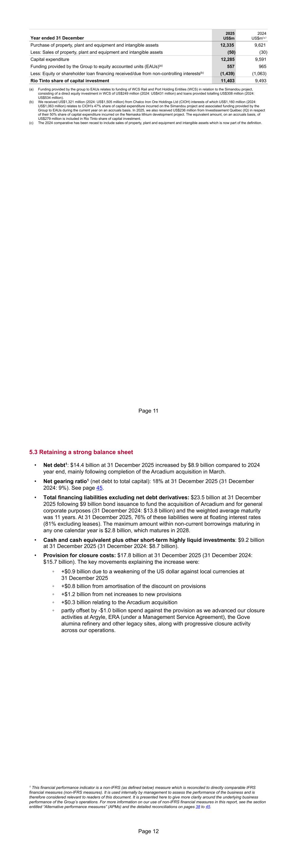 Year ended 31 December 2025 US$m 2024 US$m⁽ᶜ⁾ Purchase of property, plant and equipment and intangible assets 12,335 9,621 Less: Sales of property, plant and equipment and intangible assets (50) (30) Capital expenditure 12,285 9,591 Funding provided by the Group to equity accounted units (EAUs)(a) 557 965 Less: Equity or shareholder loan financing received/due from non-controlling interests(b) (1,439) (1,063) Rio Tinto share of capital investment 11,403 9,493 (a) Funding provided by the group to EAUs relates to funding of WCS Rail and Port Holding Entities (WCS) in relation to the Simandou project, consisting of a direct equity investment in WCS of US$249 million (2024: US$431 million) and loans provided totalling US$308 million (2024: US$534 million). (b) We received US$1,321 million (2024: US$1,505 million) from Chalco Iron Ore Holdings Ltd (CIOH) interests of which US$1,160 million (2024: US$1,063 million) relates to CIOH’s 47% share of capital expenditure incurred on the Simandou project and associated funding provided by the Group to EAUs during the current year on an accruals basis. In 2025, we also received US$236 million from Investissement Québec (IQ) in respect of their 50% share of capital expenditure incurred on the Nemaska lithium development project. The equivalent amount, on an accruals basis, of US$279 million is included in Rio Tinto share of capital investment. (c) The 2024 comparative has been recast to include sales of property, plant and equipment and intangible assets which is now part of the definition. Page 11 5.3 Retaining a strong balance sheet • Net debt1: $14.4 billion at 31 December 2025 increased by $8.9 billion compared to 2024 year end, mainly following completion of the Arcadium acquisition in March. • Net gearing ratio1 (net debt to total capital): 18% at 31 December 2025 (31 December 2024: 9%). See page 45. • Total financing liabilities excluding net debt derivatives: $23.5 billion at 31 December 2025 following $9 billion bond issuance to fund the acquisition of Arcadium and for general corporate purposes (31 December 2024: $13.8 billion) and the weighted average maturity was 11 years. At 31 December 2025, 76% of these liabilities were at floating interest rates (81% excluding leases). The maximum amount within non-current borrowings maturing in any one calendar year is $2.8 billion, which matures in 2028. • Cash and cash equivalent plus other short-term highly liquid investments: $9.2 billion at 31 December 2025 (31 December 2024: $8.7 billion). • Provision for closure costs: $17.8 billion at 31 December 2025 (31 December 2024: $15.7 billion). The key movements explaining the increase were: ◦ +$0.9 billion due to a weakening of the US dollar against local currencies at 31 December 2025 ◦ +$0.8 billion from amortisation of the discount on provisions ◦ +$1.2 billion from net increases to new provisions ◦ +$0.3 billion relating to the Arcadium acquisition ◦ partly offset by -$1.0 billion spend against the provision as we advanced our closure activities at Argyle, ERA (under a Management Service Agreement), the Gove alumina refinery and other legacy sites, along with progressive closure activity across our operations. 1 This financial performance indicator is a non-IFRS (as defined below) measure which is reconciled to directly comparable IFRS financial measures (non-IFRS measures). It is used internally by management to assess the performance of the business and is therefore considered relevant to readers of this document. It is presented here to give more clarity around the underlying business performance of the Group’s operations. For more information on our use of non-IFRS financial measures in this report, see the section entitled “Alternative performance measures” (APMs) and the detailed reconciliations on pages 38 to 45. Page 12