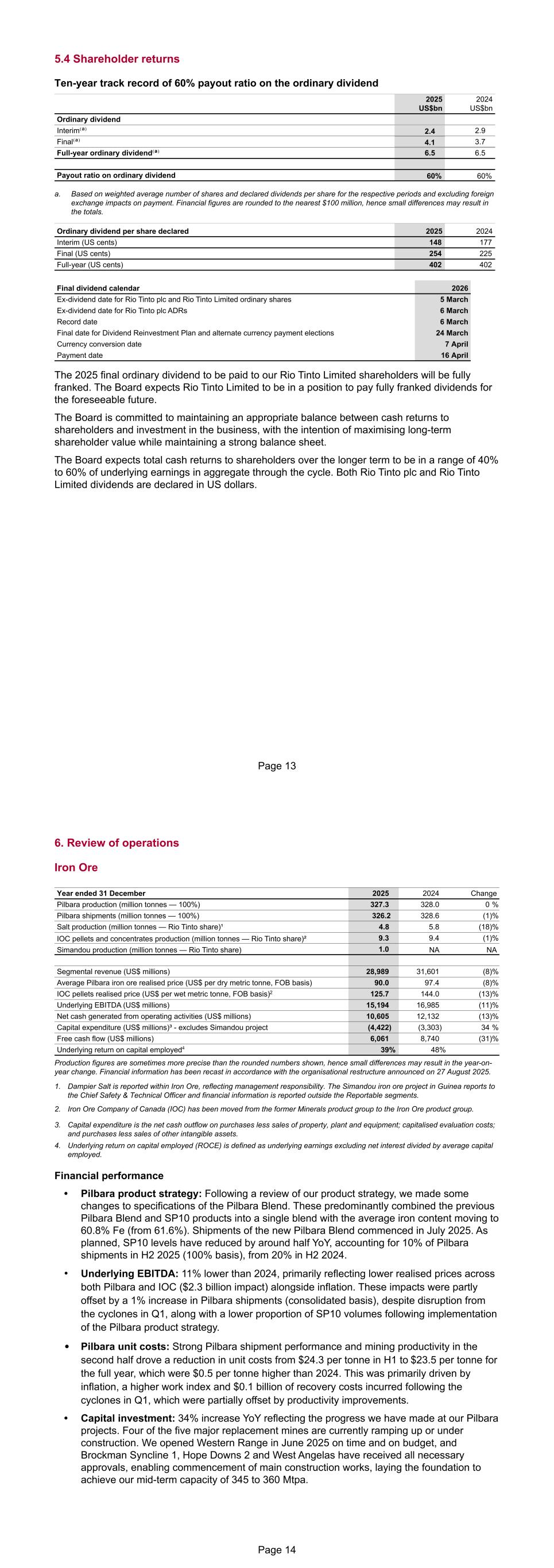 5.4 Shareholder returns Ten-year track record of 60% payout ratio on the ordinary dividend 2025 US$bn 2024 US$bn Ordinary dividend Interim⁽ª⁾ 2.4 2.9 Final⁽ª⁾ 4.1 3.7 Full-year ordinary dividend⁽ª⁾ 6.5 6.5 Payout ratio on ordinary dividend 60% 60% a. Based on weighted average number of shares and declared dividends per share for the respective periods and excluding foreign exchange impacts on payment. Financial figures are rounded to the nearest $100 million, hence small differences may result in the totals. Ordinary dividend per share declared 2025 2024 Interim (US cents) 148 177 Final (US cents) 254 225 Full-year (US cents) 402 402 Final dividend calendar 20262025 Interim dividend Ex-dividend date for Rio Tinto plc and Rio Tinto Limited ordinary shares 5 March2025 Interim dividend Ex-dividend date for Rio Tinto plc ADRs 6 March Record date 6 March Final date for Dividend Reinvestment Plan and alternate currency payment elections 24 March Currency conversion date 7 April Payment date 16 April The 2025 final ordinary dividend to be paid to our Rio Tinto Limited shareholders will be fully franked. The Board expects Rio Tinto Limited to be in a position to pay fully franked dividends for the foreseeable future. The Board is committed to maintaining an appropriate balance between cash returns to shareholders and investment in the business, with the intention of maximising long-term shareholder value while maintaining a strong balance sheet. The Board expects total cash returns to shareholders over the longer term to be in a range of 40% to 60% of underlying earnings in aggregate through the cycle. Both Rio Tinto plc and Rio Tinto Limited dividends are declared in US dollars. Page 13 6. Review of operations Iron Ore Year ended 31 December 2025 2024 Change Pilbara production (million tonnes — 100%) 327.3 328.0 0 % Pilbara shipments (million tonnes — 100%) 326.2 328.6 (1) % Salt production (million tonnes — Rio Tinto share)¹ 4.8 5.8 (18) % IOC pellets and concentrates production (million tonnes — Rio Tinto share)² 9.3 9.4 (1) % Simandou production (million tonnes — Rio Tinto share) 1.0 NA NA Segmental revenue (US$ millions) 28,989 31,601 (8) % Average Pilbara iron ore realised price (US$ per dry metric tonne, FOB basis) 90.0 97.4 (8) % IOC pellets realised price (US$ per wet metric tonne, FOB basis)2 125.7 144.0 (13) % Underlying EBITDA (US$ millions) 15,194 16,985 (11) % Net cash generated from operating activities (US$ millions) 10,605 12,132 (13) % Capital expenditure (US$ millions)³ - excludes Simandou project (4,422) (3,303) 34 % Free cash flow (US$ millions) 6,061 8,740 (31) % Underlying return on capital employed⁴ 39% 48% Production figures are sometimes more precise than the rounded numbers shown, hence small differences may result in the year-on- year change. Financial information has been recast in accordance with the organisational restructure announced on 27 August 2025. 1. Dampier Salt is reported within Iron Ore, reflecting management responsibility. The Simandou iron ore project in Guinea reports to the Chief Safety & Technical Officer and financial information is reported outside the Reportable segments. 2. Iron Ore Company of Canada (IOC) has been moved from the former Minerals product group to the Iron Ore product group. 3. Capital expenditure is the net cash outflow on purchases less sales of property, plant and equipment; capitalised evaluation costs; and purchases less sales of other intangible assets. 4. Underlying return on capital employed (ROCE) is defined as underlying earnings excluding net interest divided by average capital employed. Financial performance • Pilbara product strategy: Following a review of our product strategy, we made some changes to specifications of the Pilbara Blend. These predominantly combined the previous Pilbara Blend and SP10 products into a single blend with the average iron content moving to 60.8% Fe (from 61.6%). Shipments of the new Pilbara Blend commenced in July 2025. As planned, SP10 levels have reduced by around half YoY, accounting for 10% of Pilbara shipments in H2 2025 (100% basis), from 20% in H2 2024. • Underlying EBITDA: 11% lower than 2024, primarily reflecting lower realised prices across both Pilbara and IOC ($2.3 billion impact) alongside inflation. These impacts were partly offset by a 1% increase in Pilbara shipments (consolidated basis), despite disruption from the cyclones in Q1, along with a lower proportion of SP10 volumes following implementation of the Pilbara product strategy. • Pilbara unit costs: Strong Pilbara shipment performance and mining productivity in the second half drove a reduction in unit costs from $24.3 per tonne in H1 to $23.5 per tonne for the full year, which were $0.5 per tonne higher than 2024. This was primarily driven by inflation, a higher work index and $0.1 billion of recovery costs incurred following the cyclones in Q1, which were partially offset by productivity improvements. • Capital investment: 34% increase YoY reflecting the progress we have made at our Pilbara projects. Four of the five major replacement mines are currently ramping up or under construction. We opened Western Range in June 2025 on time and on budget, and Brockman Syncline 1, Hope Downs 2 and West Angelas have received all necessary approvals, enabling commencement of main construction works, laying the foundation to achieve our mid-term capacity of 345 to 360 Mtpa. Page 14
