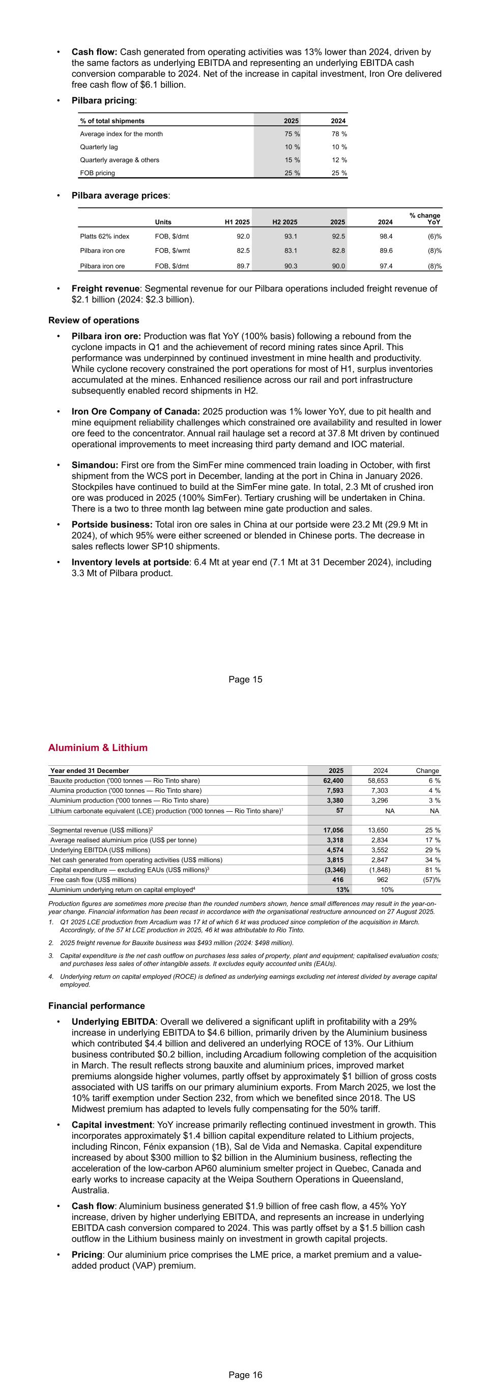 • Cash flow: Cash generated from operating activities was 13% lower than 2024, driven by the same factors as underlying EBITDA and representing an underlying EBITDA cash conversion comparable to 2024. Net of the increase in capital investment, Iron Ore delivered free cash flow of $6.1 billion. • Pilbara pricing: % of total shipments 2025 2024 Average index for the month 75 % 78 % Quarterly lag 10 % 10 % Quarterly average & others 15 % 12 % FOB pricing 25 % 25 % • Pilbara average prices: Units H1 2025 H2 2025 2025 2024 % change YoY Platts 62% index FOB, $/dmt 92.0 93.1 92.5 98.4 (6) % Pilbara iron ore FOB, $/wmt 82.5 83.1 82.8 89.6 (8) % Pilbara iron ore FOB, $/dmt 89.7 90.3 90.0 97.4 (8) % • Freight revenue: Segmental revenue for our Pilbara operations included freight revenue of $2.1 billion (2024: $2.3 billion). Review of operations • Pilbara iron ore: Production was flat YoY (100% basis) following a rebound from the cyclone impacts in Q1 and the achievement of record mining rates since April. This performance was underpinned by continued investment in mine health and productivity. While cyclone recovery constrained the port operations for most of H1, surplus inventories accumulated at the mines. Enhanced resilience across our rail and port infrastructure subsequently enabled record shipments in H2. • Iron Ore Company of Canada: 2025 production was 1% lower YoY, due to pit health and mine equipment reliability challenges which constrained ore availability and resulted in lower ore feed to the concentrator. Annual rail haulage set a record at 37.8 Mt driven by continued operational improvements to meet increasing third party demand and IOC material. • Simandou: First ore from the SimFer mine commenced train loading in October, with first shipment from the WCS port in December, landing at the port in China in January 2026. Stockpiles have continued to build at the SimFer mine gate. In total, 2.3 Mt of crushed iron ore was produced in 2025 (100% SimFer). Tertiary crushing will be undertaken in China. There is a two to three month lag between mine gate production and sales. • Portside business: Total iron ore sales in China at our portside were 23.2 Mt (29.9 Mt in 2024), of which 95% were either screened or blended in Chinese ports. The decrease in sales reflects lower SP10 shipments. • Inventory levels at portside: 6.4 Mt at year end (7.1 Mt at 31 December 2024), including 3.3 Mt of Pilbara product. Page 15 Aluminium & Lithium Year ended 31 December 2025 2024 Change Bauxite production ('000 tonnes — Rio Tinto share) 62,400 58,653 6 % Alumina production ('000 tonnes — Rio Tinto share) 7,593 7,303 4 % Aluminium production ('000 tonnes — Rio Tinto share) 3,380 3,296 3 % Lithium carbonate equivalent (LCE) production ('000 tonnes — Rio Tinto share)1 57 NA NA Segmental revenue (US$ millions)2 17,056 13,650 25 % Average realised aluminium price (US$ per tonne) 3,318 2,834 17 % Underlying EBITDA (US$ millions) 4,574 3,552 29 % Net cash generated from operating activities (US$ millions) 3,815 2,847 34 % Capital expenditure — excluding EAUs (US$ millions)3 (3,346) (1,848) 81 % Free cash flow (US$ millions) 416 962 (57) % Aluminium underlying return on capital employed4 13% 10% Production figures are sometimes more precise than the rounded numbers shown, hence small differences may result in the year-on- year change. Financial information has been recast in accordance with the organisational restructure announced on 27 August 2025. 1. Q1 2025 LCE production from Arcadium was 17 kt of which 6 kt was produced since completion of the acquisition in March. Accordingly, of the 57 kt LCE production in 2025, 46 kt was attributable to Rio Tinto. 2. 2025 freight revenue for Bauxite business was $493 million (2024: $498 million). 3. Capital expenditure is the net cash outflow on purchases less sales of property, plant and equipment; capitalised evaluation costs; and purchases less sales of other intangible assets. It excludes equity accounted units (EAUs). 4. Underlying return on capital employed (ROCE) is defined as underlying earnings excluding net interest divided by average capital employed. Financial performance • Underlying EBITDA: Overall we delivered a significant uplift in profitability with a 29% increase in underlying EBITDA to $4.6 billion, primarily driven by the Aluminium business which contributed $4.4 billion and delivered an underlying ROCE of 13%. Our Lithium business contributed $0.2 billion, including Arcadium following completion of the acquisition in March. The result reflects strong bauxite and aluminium prices, improved market premiums alongside higher volumes, partly offset by approximately $1 billion of gross costs associated with US tariffs on our primary aluminium exports. From March 2025, we lost the 10% tariff exemption under Section 232, from which we benefited since 2018. The US Midwest premium has adapted to levels fully compensating for the 50% tariff. • Capital investment: YoY increase primarily reflecting continued investment in growth. This incorporates approximately $1.4 billion capital expenditure related to Lithium projects, including Rincon, Fénix expansion (1B), Sal de Vida and Nemaska. Capital expenditure increased by about $300 million to $2 billion in the Aluminium business, reflecting the acceleration of the low-carbon AP60 aluminium smelter project in Quebec, Canada and early works to increase capacity at the Weipa Southern Operations in Queensland, Australia. • Cash flow: Aluminium business generated $1.9 billion of free cash flow, a 45% YoY increase, driven by higher underlying EBITDA, and represents an increase in underlying EBITDA cash conversion compared to 2024. This was partly offset by a $1.5 billion cash outflow in the Lithium business mainly on investment in growth capital projects. • Pricing: Our aluminium price comprises the LME price, a market premium and a value- added product (VAP) premium. Page 16