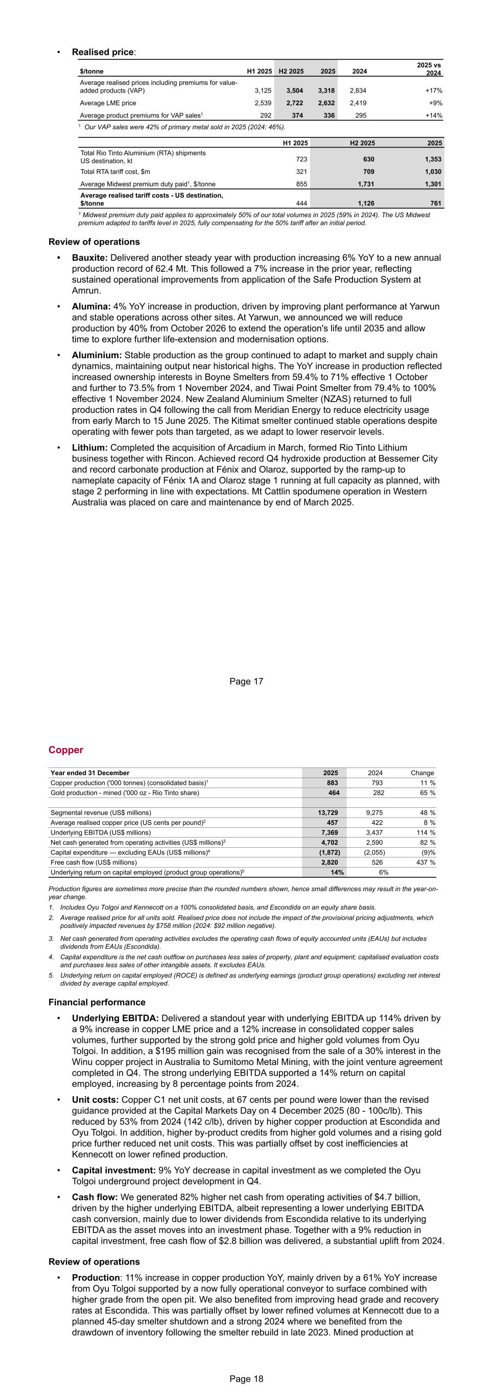 • Realised price: $/tonne H1 2025 H2 2025 2025 2024 2025 vs 2024 Average realised prices including premiums for value- added products (VAP) 3,125 3,504 3,318 2,834 +17 % Average LME price 2,539 2,722 2,632 2,419 +9 % Average product premiums for VAP sales1 292 374 336 295 +14 % 1 Our VAP sales were 42% of primary metal sold in 2025 (2024: 46%). H1 2025 H2 2025 2025 Total Rio Tinto Aluminium (RTA) shipments US destination, kt 723 630 1,353 Total RTA tariff cost, $m 321 709 1,030 Average Midwest premium duty paid1, $/tonne 855 1,731 1,301 Average realised tariff costs - US destination, $/tonne 444 1,126 761 1 Midwest premium duty paid applies to approximately 50% of our total volumes in 2025 (59% in 2024). The US Midwest premium adapted to tariffs level in 2025, fully compensating for the 50% tariff after an initial period. Review of operations • Bauxite: Delivered another steady year with production increasing 6% YoY to a new annual production record of 62.4 Mt. This followed a 7% increase in the prior year, reflecting sustained operational improvements from application of the Safe Production System at Amrun. • Alumina: 4% YoY increase in production, driven by improving plant performance at Yarwun and stable operations across other sites. At Yarwun, we announced we will reduce production by 40% from October 2026 to extend the operation's life until 2035 and allow time to explore further life-extension and modernisation options. • Aluminium: Stable production as the group continued to adapt to market and supply chain dynamics, maintaining output near historical highs. The YoY increase in production reflected increased ownership interests in Boyne Smelters from 59.4% to 71% effective 1 October and further to 73.5% from 1 November 2024, and Tiwai Point Smelter from 79.4% to 100% effective 1 November 2024. New Zealand Aluminium Smelter (NZAS) returned to full production rates in Q4 following the call from Meridian Energy to reduce electricity usage from early March to 15 June 2025. The Kitimat smelter continued stable operations despite operating with fewer pots than targeted, as we adapt to lower reservoir levels. • Lithium: Completed the acquisition of Arcadium in March, formed Rio Tinto Lithium business together with Rincon. Achieved record Q4 hydroxide production at Bessemer City and record carbonate production at Fénix and Olaroz, supported by the ramp-up to nameplate capacity of Fénix 1A and Olaroz stage 1 running at full capacity as planned, with stage 2 performing in line with expectations. Mt Cattlin spodumene operation in Western Australia was placed on care and maintenance by end of March 2025. Page 17 Copper Year ended 31 December 2025 2024 Change Copper production ('000 tonnes) (consolidated basis)1 883 793 11 % Gold production - mined ('000 oz - Rio Tinto share) 464 282 65 % Segmental revenue (US$ millions) 13,729 9,275 48 % Average realised copper price (US cents per pound)2 457 422 8 % Underlying EBITDA (US$ millions) 7,369 3,437 114 % Net cash generated from operating activities (US$ millions)3 4,702 2,590 82 % Capital expenditure — excluding EAUs (US$ millions)4 (1,872) (2,055) (9) % Free cash flow (US$ millions) 2,820 526 437 % Underlying return on capital employed (product group operations)5 14% 6% Production figures are sometimes more precise than the rounded numbers shown, hence small differences may result in the year-on- year change. 1. Includes Oyu Tolgoi and Kennecott on a 100% consolidated basis, and Escondida on an equity share basis. 2. Average realised price for all units sold. Realised price does not include the impact of the provisional pricing adjustments, which positively impacted revenues by $758 million (2024: $92 million negative). 3. Net cash generated from operating activities excludes the operating cash flows of equity accounted units (EAUs) but includes dividends from EAUs (Escondida). 4. Capital expenditure is the net cash outflow on purchases less sales of property, plant and equipment; capitalised evaluation costs and purchases less sales of other intangible assets. It excludes EAUs. 5. Underlying return on capital employed (ROCE) is defined as underlying earnings (product group operations) excluding net interest divided by average capital employed. Financial performance • Underlying EBITDA: Delivered a standout year with underlying EBITDA up 114% driven by a 9% increase in copper LME price and a 12% increase in consolidated copper sales volumes, further supported by the strong gold price and higher gold volumes from Oyu Tolgoi. In addition, a $195 million gain was recognised from the sale of a 30% interest in the Winu copper project in Australia to Sumitomo Metal Mining, with the joint venture agreement completed in Q4. The strong underlying EBITDA supported a 14% return on capital employed, increasing by 8 percentage points from 2024. • Unit costs: Copper C1 net unit costs, at 67 cents per pound were lower than the revised guidance provided at the Capital Markets Day on 4 December 2025 (80 - 100c/lb). This reduced by 53% from 2024 (142 c/lb), driven by higher copper production at Escondida and Oyu Tolgoi. In addition, higher by-product credits from higher gold volumes and a rising gold price further reduced net unit costs. This was partially offset by cost inefficiencies at Kennecott on lower refined production. • Capital investment: 9% YoY decrease in capital investment as we completed the Oyu Tolgoi underground project development in Q4. • Cash flow: We generated 82% higher net cash from operating activities of $4.7 billion, driven by the higher underlying EBITDA, albeit representing a lower underlying EBITDA cash conversion, mainly due to lower dividends from Escondida relative to its underlying EBITDA as the asset moves into an investment phase. Together with a 9% reduction in capital investment, free cash flow of $2.8 billion was delivered, a substantial uplift from 2024. Review of operations • Production: 11% increase