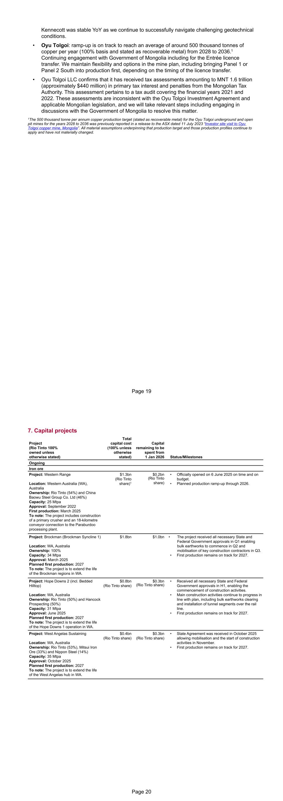 Kennecott was stable YoY as we continue to successfully navigate challenging geotechnical conditions. • Oyu Tolgoi: ramp-up is on track to reach an average of around 500 thousand tonnes of copper per year (100% basis and stated as recoverable metal) from 2028 to 2036.1 Continuing engagement with Government of Mongolia including for the Entrée licence transfer. We maintain flexibility and options in the mine plan, including bringing Panel 1 or Panel 2 South into production first, depending on the timing of the licence transfer. • Oyu Tolgoi LLC confirms that it has received tax assessments amounting to MNT 1.6 trillion (approximately $440 million) in primary tax interest and penalties from the Mongolian Tax Authority. This assessment pertains to a tax audit covering the financial years 2021 and 2022. These assessments are inconsistent with the Oyu Tolgoi Investment Agreement and applicable Mongolian legislation, and we will take relevant steps including engaging in discussions with the Government of Mongolia to resolve this matter. 1The 500 thousand tonne per annum copper production target (stated as recoverable metal) for the Oyu Tolgoi underground and open pit mines for the years 2028 to 2036 was previously reported in a release to the ASX dated 11 July 2023 “Investor site visit to Oyu Tolgoi copper mine, Mongolia”. All material assumptions underpinning that production target and those production profiles continue to apply and have not materially changed. Page 19 7. Capital projects Ongoing Iron ore Project: Western Range Location: Western Australia (WA), Australia Ownership: Rio Tinto (54%) and China Baowu Steel Group Co. Ltd (46%) Capacity: 25 Mtpa Approval: September 2022 First production: March 2025 To note: The project includes construction of a primary crusher and an 18-kilometre conveyor connection to the Paraburdoo processing plant. $1.3bn (Rio Tinto share)1 $0.2bn (Rio Tinto share) • Officially opened on 6 June 2025 on time and on budget. • Planned production ramp-up through 2026. Project: Brockman (Brockman Syncline 1) Location: WA, Australia Ownership: 100% Capacity: 34 Mtpa Approval: March 2025 Planned first production: 2027 To note: The project is to extend the life of the Brockman regions in WA. $1.8bn $1.0bn • The project received all necessary State and Federal Government approvals in Q1 enabling bulk earthworks to commence in Q2 and mobilisation of key construction contractors in Q3. • First production remains on track for 2027. Project: Hope Downs 2 (incl. Bedded Hilltop) Location: WA, Australia Ownership: Rio Tinto (50%) and Hancock Prospecting (50%) Capacity: 31 Mtpa Approval: June 2025 Planned first production: 2027 To note: The project is to extend the life of the Hope Downs 1 operation in WA. $0.8bn (Rio Tinto share) $0.3bn (Rio Tinto share) • Received all necessary State and Federal Government approvals in H1, enabling the commencement of construction activities. • Main construction activities continue to progress in line with plan, including bulk earthworks clearing and installation of tunnel segments over the rail line. • First production remains on track for 2027. Project: West Angelas Sustaining Location: WA, Australia Ownership: Rio Tinto (53%), Mitsui Iron Ore (33%) and Nippon Steel (14%) Capacity: 35 Mtpa Approval: October 2025 Planned first production: 2027 To note: The project is to extend the life of the West Angelas hub in WA. $0.4bn (Rio Tinto share) $0.3bn (Rio Tinto share) • State Agreement was received in October 2025 allowing mobilisation and the start of construction activities in November. • First production remains on track for 2027. Project (Rio Tinto 100% owned unless otherwise stated) Total capital cost (100% unless otherwise stated) Capital remaining to be spent from 1 Jan 2026 Status/Milestones Page 20