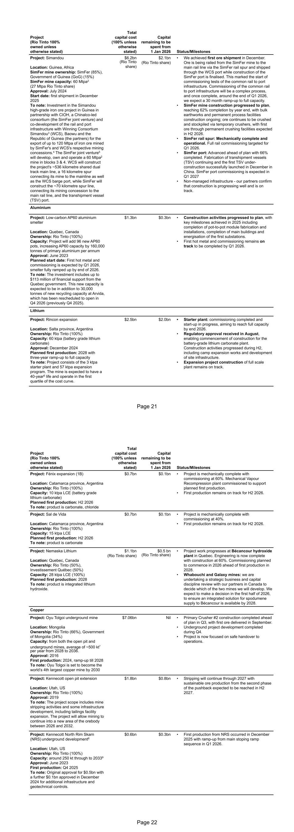 Project: Simandou Location: Guinea, Africa SimFer mine ownership: SimFer (85%), Government of Guinea (GoG) (15%) SimFer mine capacity: 60 Mtpa2 (27 Mtpa Rio Tinto share) Approval: July 2024 Start date: first shipment in December 2025 To note: Investment in the Simandou high-grade iron ore project in Guinea in partnership with CIOH, a Chinalco-led consortium (the SimFer joint venture) and co-development of the rail and port infrastructure with Winning Consortium Simandou3 (WCS), Baowu and the Republic of Guinea (the partners) for the export of up to 120 Mtpa of iron ore mined by SimFer's and WCS's respective mining concessions.4 The SimFer joint venture5 will develop, own and operate a 60 Mtpa2 mine in blocks 3 & 4. WCS will construct the project's ~536 kilometre shared dual track main line, a 16 kilometre spur connecting its mine to the mainline as well as the WCS barge port, while SimFer will construct the ~70 kilometre spur line, connecting its mining concession to the main rail line, and the transhipment vessel (TSV) port. $6.2bn (Rio Tinto share) $2.1bn (Rio Tinto share) • We achieved first ore shipment in December. Ore is being railed from the SimFer mine to the main rail line via the SimFer rail spur and shipped through the WCS port while construction of the SimFer port is finalised. This marked the start of commissioning tests of the common rail to port infrastructure. Commissioning of the common rail to port infrastructure will be a complex process, and once complete, around the end of Q1 2026, we expect a 30 month ramp-up to full capacity. • SimFer mine construction progressed to plan, reaching 62% completion by year end, with bulk earthworks and permanent process facilities construction ongoing; ore continues to be crushed and stockpiled via temporary crushers, with first ore through permanent crushing facilities expected in H2 2026. • SimFer rail spur: Mechanically complete and operational. Full rail commissioning targeted for Q1 2026. • SimFer port: Advanced ahead of plan with 66% completed. Fabrication of transhipment vessels (TSV) continuing and the first TSV under- construction successfully launched in December in China. SimFer port commissioning is expected in Q1 2027 • Non-managed infrastructure - our partners confirm that construction is progressing well and is on track. Aluminium Project: Low-carbon AP60 aluminium smelter Location: Quebec, Canada Ownership: Rio Tinto (100%) Capacity: Project will add 96 new AP60 pots, increasing AP60 capacity by 160,000 tonnes of primary aluminium per annum Approval: June 2023 Planned start date: First hot metal and commissioning is expected by Q1 2026, smelter fully ramped up by end of 2026. To note: The investment includes up to $113 million of financial support from the Quebec government. This new capacity is expected to be in addition to 30,000 tonnes of new recycling capacity at Arvida, which has been rescheduled to open in Q4 2026 (previously Q4 2025). $1.3bn $0.3bn • Construction activities progressed to plan, with key milestones achieved in 2025 including completion of pot-to-pot module fabrication and installations, completion of main buildings and energisation of the first substations. • First hot metal and commissioning remains on track to be completed by Q1 2026. Lithium Project: Rincon expansion Location: Salta province, Argentina Ownership: Rio Tinto (100%) Capacity: 60 ktpa (battery grade lithium carbonate) Approval: December 2024 Planned first production: 2028 with three-year ramp-up to full capacity To note: Project consists of the 3 ktpa starter plant and 57 ktpa expansion program. The mine is expected to have a 40-year6 life and operate in the first quartile of the cost curve. $2.5bn $2.0bn • Starter plant: commissioning completed and start-up in progress, aiming to reach full capacity by end 2026. • Regulatory approval received in August, enabling commencement of construction for the battery-grade lithium carbonate plant. Construction activities progressed during H2, including camp expansion works and development of site infrastructure. • Expansion project construction of full scale plant remains on track. Project (Rio Tinto 100% owned unless otherwise stated) Total capital cost (100% unless otherwise stated) Capital remaining to be spent from 1 Jan 2026 Status/Milestones Page 21 Project: Fénix expansion (1B) Location: Catamarca province, Argentina Ownership: Rio Tinto (100%) Capacity: 10 ktpa LCE (battery grade lithium carbonate) Planned first production: H2 2026 To note: product is carbonate, chloride $0.7bn $0.1bn • Project is mechanically complete with commissioning at 60%. Mechanical Vapour Recompression plant commissioned to support planned first production. • First production remains on track for H2 2026. Project: Sal de Vida Location: Catamarca province, Argentina Ownership: Rio Tinto (100%) Capacity: 15 ktpa LCE Planned first production: H2 2026 To note: product is carbonate $0.7bn $0.1bn • Project is mechanically complete with commissioning at 40%. • First production remains on track for H2 2026. Project: Nemaska Lithium Location: Quebec, Canada Ownership: Rio Tinto (50%), Investissement Québec (50%) Capacity: 28 ktpa LCE (100%) Planned first production: 2028 To note: product is integrated lithium hydroxide. $1.1bn (Rio Tinto share) $0.5 bn (Rio Tinto share) • Project work progresses at Bécancour hydroxide plant in Quebec. Engineering is now complete with construction at 60%. Commissioning planned to commence in 2026 ahead of first production in 2028. • Whabouchi and Galaxy mines: we are undertaking a strategic business and capital discipline review with our partners in Canada to decide which of the two mines we will develop. We expect to make a decision in the first half of 2026, to ensure an integrated solution for spodumene supply to Bécancour is available by 2028. Copper Project: Oyu Tolgoi underground mine Location: Mongolia Ownership: Rio Tinto (66%), Government of