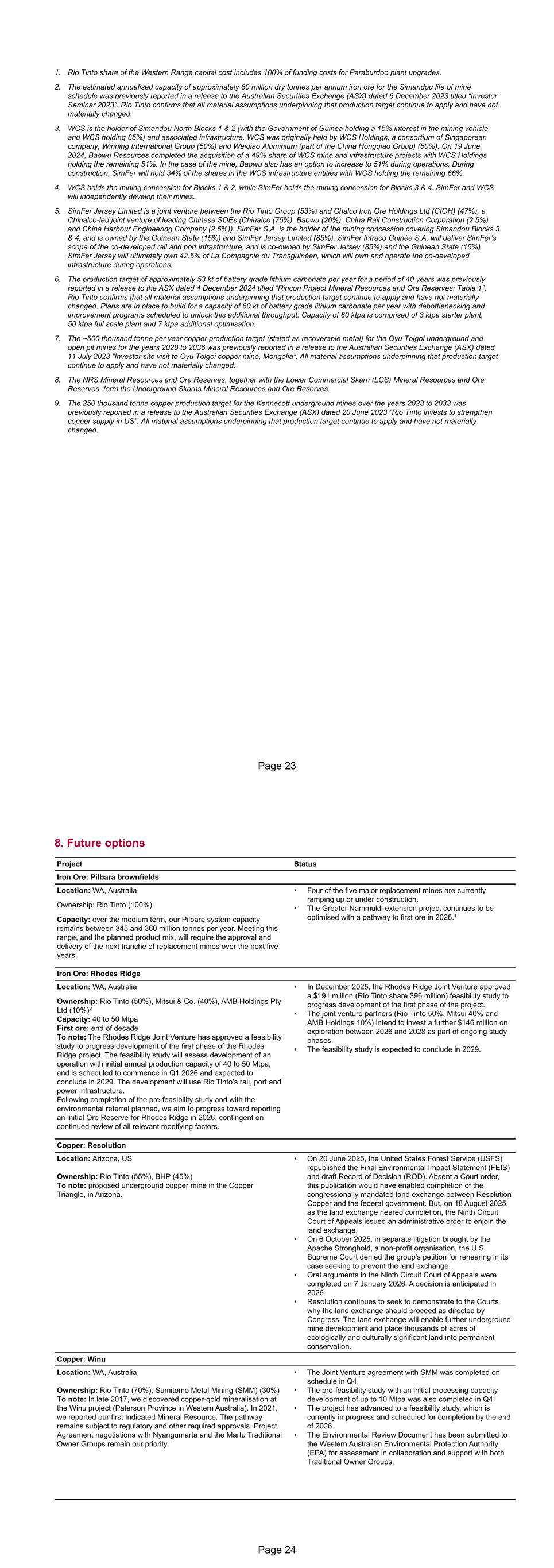 1. Rio Tinto share of the Western Range capital cost includes 100% of funding costs for Paraburdoo plant upgrades. 2. The estimated annualised capacity of approximately 60 million dry tonnes per annum iron ore for the Simandou life of mine schedule was previously reported in a release to the Australian Securities Exchange (ASX) dated 6 December 2023 titled “Investor Seminar 2023”. Rio Tinto confirms that all material assumptions underpinning that production target continue to apply and have not materially changed. 3. WCS is the holder of Simandou North Blocks 1 & 2 (with the Government of Guinea holding a 15% interest in the mining vehicle and WCS holding 85%) and associated infrastructure. WCS was originally held by WCS Holdings, a consortium of Singaporean company, Winning International Group (50%) and Weiqiao Aluminium (part of the China Hongqiao Group) (50%). On 19 June 2024, Baowu Resources completed the acquisition of a 49% share of WCS mine and infrastructure projects with WCS Holdings holding the remaining 51%. In the case of the mine, Baowu also has an option to increase to 51% during operations. During construction, SimFer will hold 34% of the shares in the WCS infrastructure entities with WCS holding the remaining 66%. 4. WCS holds the mining concession for Blocks 1 & 2, while SimFer holds the mining concession for Blocks 3 & 4. SimFer and WCS will independently develop their mines. 5. SimFer Jersey Limited is a joint venture between the Rio Tinto Group (53%) and Chalco Iron Ore Holdings Ltd (CIOH) (47%), a Chinalco-led joint venture of leading Chinese SOEs (Chinalco (75%), Baowu (20%), China Rail Construction Corporation (2.5%) and China Harbour Engineering Company (2.5%)). SimFer S.A. is the holder of the mining concession covering Simandou Blocks 3 & 4, and is owned by the Guinean State (15%) and SimFer Jersey Limited (85%). SimFer Infraco Guinée S.A. will deliver SimFer’s scope of the co-developed rail and port infrastructure, and is co-owned by SimFer Jersey (85%) and the Guinean State (15%). SimFer Jersey will ultimately own 42.5% of La Compagnie du Transguinéen, which will own and operate the co-developed infrastructure during operations. 6. The production target of approximately 53 kt of battery grade lithium carbonate per year for a period of 40 years was previously reported in a release to the ASX dated 4 December 2024 titled “Rincon Project Mineral Resources and Ore Reserves: Table 1”. Rio Tinto confirms that all material assumptions underpinning that production target continue to apply and have not materially changed. Plans are in place to build for a capacity of 60 kt of battery grade lithium carbonate per year with debottlenecking and improvement programs scheduled to unlock this additional throughput. Capacity of 60 ktpa is comprised of 3 ktpa starter plant, 50 ktpa full scale plant and 7 ktpa additional optimisation. 7. The ~500 thousand tonne per year copper production target (stated as recoverable metal) for the Oyu Tolgoi underground and open pit mines for the years 2028 to 2036 was previously reported in a release to the Australian Securities Exchange (ASX) dated 11 July 2023 “Investor site visit to Oyu Tolgoi copper mine, Mongolia”. All material assumptions underpinning that production target continue to apply and have not materially changed. 8. The NRS Mineral Resources and Ore Reserves, together with the Lower Commercial Skarn (LCS) Mineral Resources and Ore Reserves, form the Underground Skarns Mineral Resources and Ore Reserves. 9. The 250 thousand tonne copper production target for the Kennecott underground mines over the years 2023 to 2033 was previously reported in a release to the Australian Securities Exchange (ASX) dated 20 June 2023 "Rio Tinto invests to strengthen copper supply in US”. All material assumptions underpinning that production target continue to apply and have not materially changed. Page 23 8. Future options Project Status Iron Ore: Pilbara brownfields Location: WA, Australia Ownership: Rio Tinto (100%) Capacity: over the medium term, our Pilbara system capacity remains between 345 and 360 million tonnes per year. Meeting this range, and the planned product mix, will require the approval and delivery of the next tranche of replacement mines over the next five years. • Four of the five major replacement mines are currently ramping up or under construction. • The Greater Nammuldi extension project continues to be optimised with a pathway to first ore in 2028.1 Iron Ore: Rhodes Ridge Location: WA, Australia Ownership: Rio Tinto (50%), Mitsui & Co. (40%), AMB Holdings Pty Ltd (10%)2 Capacity: 40 to 50 Mtpa First ore: end of decade To note: The Rhodes Ridge Joint Venture has approved a feasibility study to progress development of the first phase of the Rhodes Ridge project. The feasibility study will assess development of an operation with initial annual production capacity of 40 to 50 Mtpa, and is scheduled to commence in Q1 2026 and expected to conclude in 2029. The development will use Rio Tinto’s rail, port and power infrastructure. Following completion of the pre-feasibility study and with the environmental referral planned, we aim to progress toward reporting an initial Ore Reserve for Rhodes Ridge in 2026, contingent on continued review of all relevant modifying factors. • In December 2025, the Rhodes Ridge Joint Venture approved a $191 million (Rio Tinto share $96 million) feasibility study to progress development of the first phase of the project. • The joint venture partners (Rio Tinto 50%, Mitsui 40% and AMB Holdings 10%) intend to invest a further $146 million on exploration between 2026 and 2028 as part of ongoing study phases. • The feasibility study is expected to conclude in 2029. Copper: Resolution Location: Arizona, US Ownership: Rio Tinto (55%), BHP (45%) To note: proposed underground copper mine in the Copper Triangle, in Arizona. • On 20 June 2025, the United States Forest Service (US