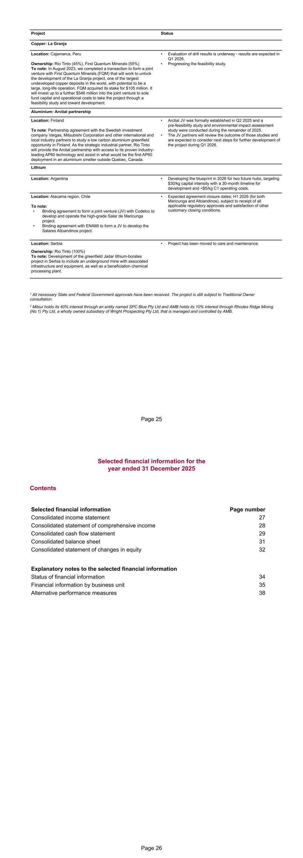 Project Status Copper: La Granja Location: Cajamarca, Peru Ownership: Rio Tinto (45%), First Quantum Minerals (55%) To note: In August 2023, we completed a transaction to form a joint venture with First Quantum Minerals (FQM) that will work to unlock the development of the La Granja project, one of the largest undeveloped copper deposits in the world, with potential to be a large, long-life operation. FQM acquired its stake for $105 million. It will invest up to a further $546 million into the joint venture to sole fund capital and operational costs to take the project through a feasibility study and toward development. • Evaluation of drill results is underway - results are expected in Q1 2026. • Progressing the feasibility study. Aluminium: Arctial partnership Location: Finland To note: Partnership agreement with the Swedish investment company Vargas, Mitsubishi Corporation and other international and local industry partners to study a low carbon aluminium greenfield opportunity in Finland. As the strategic industrial partner, Rio Tinto will provide the Arctial partnership with access to its proven industry- leading AP60 technology and assist in what would be the first AP60 deployment in an aluminium smelter outside Quebec, Canada. • Arctial JV was formally established in Q2 2025 and a pre-feasibility study and environmental impact assessment study were conducted during the remainder of 2025. • The JV partners will review the outcome of those studies and are expected to consider next steps for further development of the project during Q1 2026. Lithium Location: Argentina • Developing the blueprint in 2026 for two future hubs, targeting $30/kg capital intensity with a 30-month timeline for development and <$5/kg C1 operating costs. Location: Atacama region, Chile To note: • Binding agreement to form a joint venture (JV) with Codelco to develop and operate the high-grade Salar de Maricunga project. • Binding agreement with ENAMI to form a JV to develop the Salares Altoandinos project. • Expected agreement closure dates: H1 2026 (for both Maricunga and Altoandinos), subject to receipt of all applicable regulatory approvals and satisfaction of other customary closing conditions. Location: Serbia Ownership: Rio Tinto (100%) To note: Development of the greenfield Jadar lithium-borates project in Serbia to include an underground mine with associated infrastructure and equipment, as well as a beneficiation chemical processing plant. • Project has been moved to care and maintenance. 1 All necessary State and Federal Government approvals have been received. The project is still subject to Traditional Owner consultation. 2 Mitsui holds its 40% interest through an entity named SPC Blue Pty Ltd and AMB holds its 10% interest through Rhodes Ridge Mining (No 1) Pty Ltd, a wholly owned subsidiary of Wright Prospecting Pty Ltd, that is managed and controlled by AMB. Page 25 Selected financial information for the year ended 31 December 2025 Contents Selected financial information Page number Consolidated income statement 27 Consolidated statement of comprehensive income 28 Consolidated cash flow statement 29 Consolidated balance sheet 31 Consolidated statement of changes in equity 32 Explanatory notes to the selected financial information Status of financial information 34 Financial information by business unit 35 Alternative performance measures 38 Page 26