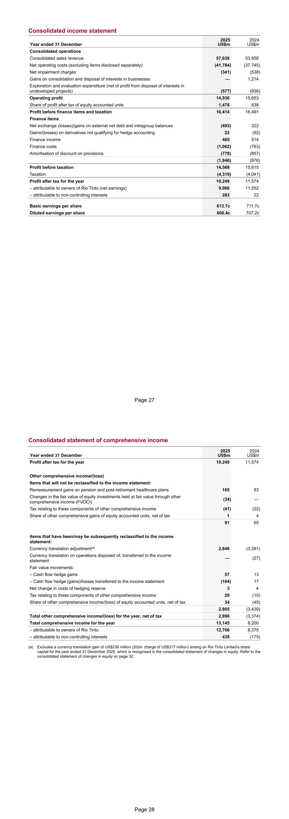 Consolidated income statement Year ended 31 December 2025 US$m 2024 US$m Consolidated operations Consolidated sales revenue 57,638 53,658 Net operating costs (excluding items disclosed separately) (41,784) (37,745) Net impairment charges (341) (538) Gains on consolidation and disposal of interests in businesses — 1,214 Exploration and evaluation expenditure (net of profit from disposal of interests in undeveloped projects) (577) (936) Operating profit 14,936 15,653 Share of profit after tax of equity accounted units 1,478 838 Profit before finance items and taxation 16,414 16,491 Finance items Net exchange (losses)/gains on external net debt and intragroup balances (493) 322 Gains/(losses) on derivatives not qualifying for hedge accounting 22 (92) Finance income 465 514 Finance costs (1,062) (763) Amortisation of discount on provisions (778) (857) (1,846) (876) Profit before taxation 14,568 15,615 Taxation (4,319) (4,041) Profit after tax for the year 10,249 11,574 – attributable to owners of Rio Tinto (net earnings) 9,966 11,552 – attributable to non-controlling interests 283 22 Basic earnings per share 613.7c 711.7c Diluted earnings per share 608.4c 707.2c Page 27 Consolidated statement of comprehensive income Year ended 31 December 2025 US$m 2024 US$m Profit after tax for the year 10,249 11,574 Other comprehensive income/(loss) Items that will not be reclassified to the income statement: Remeasurement gains on pension and post-retirement healthcare plans 165 83 Changes in the fair value of equity investments held at fair value through other comprehensive income (FVOCI) (34) — Tax relating to these components of other comprehensive income (41) (22) Share of other comprehensive gains of equity accounted units, net of tax 1 4 91 65 Items that have been/may be subsequently reclassified to the income statement: Currency translation adjustment(a) 2,846 (3,391) Currency translation on operations disposed of, transferred to the income statement — (27) Fair value movements: – Cash flow hedge gains 57 13 – Cash flow hedge (gains)/losses transferred to the income statement (164) 17 Net change in costs of hedging reserve 3 4 Tax relating to these components of other comprehensive income 29 (10) Share of other comprehensive income/(loss) of equity accounted units, net of tax 34 (45) 2,805 (3,439) Total other comprehensive income/(loss) for the year, net of tax 2,896 (3,374) Total comprehensive income for the year 13,145 8,200 – attributable to owners of Rio Tinto 12,706 8,375 – attributable to non-controlling interests 439 (175) (a) Excludes a currency translation gain of US$238 million (2024: charge of US$317 million) arising on Rio Tinto Limited’s share capital for the year ended 31 December 2025, which is recognised in the consolidated statement of changes in equity. Refer to the consolidated statement of changes in equity on page 32. Page 28