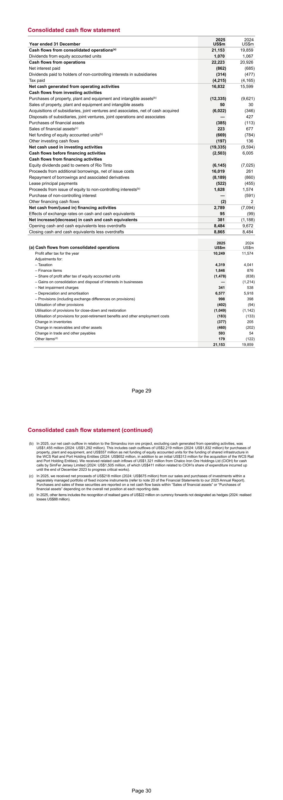 Consolidated cash flow statement Year ended 31 December 2025 US$m 2024 US$m Cash flows from consolidated operations(a) 21,153 19,859 Dividends from equity accounted units 1,070 1,067 Cash flows from operations 22,223 20,926 Net interest paid (862) (685) Dividends paid to holders of non-controlling interests in subsidiaries (314) (477) Tax paid (4,215) (4,165) Net cash generated from operating activities 16,832 15,599 Cash flows from investing activities Purchases of property, plant and equipment and intangible assets(b) (12,335) (9,621) Sales of property, plant and equipment and intangible assets 50 30 Acquisitions of subsidiaries, joint ventures and associates, net of cash acquired (6,022) (346) Disposals of subsidiaries, joint ventures, joint operations and associates — 427 Purchases of financial assets (385) (113) Sales of financial assets(c) 223 677 Net funding of equity accounted units(b) (669) (784) Other investing cash flows (197) 136 Net cash used in investing activities (19,335) (9,594) Cash flows before financing activities (2,503) 6,005 Cash flows from financing activities Equity dividends paid to owners of Rio Tinto (6,145) (7,025) Proceeds from additional borrowings, net of issue costs 16,019 261 Repayment of borrowings and associated derivatives (8,189) (860) Lease principal payments (522) (455) Proceeds from issue of equity to non-controlling interests(b) 1,628 1,574 Purchase of non-controlling interest — (591) Other financing cash flows (2) 2 Net cash from/(used in) financing activities 2,789 (7,094) Effects of exchange rates on cash and cash equivalents 95 (99) Net increase/(decrease) in cash and cash equivalents 381 (1,188) Opening cash and cash equivalents less overdrafts 8,484 9,672 Closing cash and cash equivalents less overdrafts 8,865 8,484 (a) Cash flows from consolidated operations 2025 US$m 2024 US$m Profit after tax for the year 10,249 11,574 Adjustments for: – Taxation 4,319 4,041 – Finance items 1,846 876 – Share of profit after tax of equity accounted units (1,478) (838) – Gains on consolidation and disposal of interests in businesses — (1,214) – Net impairment charges 341 538 – Depreciation and amortisation 6,577 5,918 – Provisions (including exchange differences on provisions) 998 398 Utilisation of other provisions (402) (94) Utilisation of provisions for close-down and restoration (1,049) (1,142) Utilisation of provisions for post-retirement benefits and other employment costs (183) (133) Change in inventories (377) 205 Change in receivables and other assets (460) (202) Change in trade and other payables 593 54 Other items(d) 179 (122) 21,153 19,859 Page 29 Consolidated cash flow statement (continued) (b) In 2025, our net cash outflow in relation to the Simandou iron ore project, excluding cash generated from operating activities, was US$1,455 million (2024: US$1,292 million). This includes cash outflows of US$2,219 million (2024: US$1,832 million) for purchases of property, plant and equipment, and US$557 million as net funding of equity accounted units for the funding of shared infrastructure in the WCS Rail and Port Holding Entities (2024: US$652 million, in addition to an initial US$313 million for the acquisition of the WCS Rail and Port Holding Entities). We received related cash inflows of US$1,321 million from Chalco Iron Ore Holdings Ltd (CIOH) for cash calls by SimFer Jersey Limited (2024: US$1,505 million, of which US$411 million related to CIOH’s share of expenditure incurred up until the end of December 2023 to progress critical works). (c) In 2025, we received net proceeds of US$218 million (2024: US$675 million) from our sales and purchases of investments within a separately managed portfolio of fixed income instruments (refer to note 20 of the Financial Statements to our 2025 Annual Report). Purchases and sales of these securities are reported on a net cash flow basis within “Sales of financial assets” or “Purchases of financial assets” depending on the overall net position at each reporting date. (d) In 2025, other items includes the recognition of realised gains of US$22 million on currency forwards not designated as hedges (2024: realised losses US$88 million). Page 30