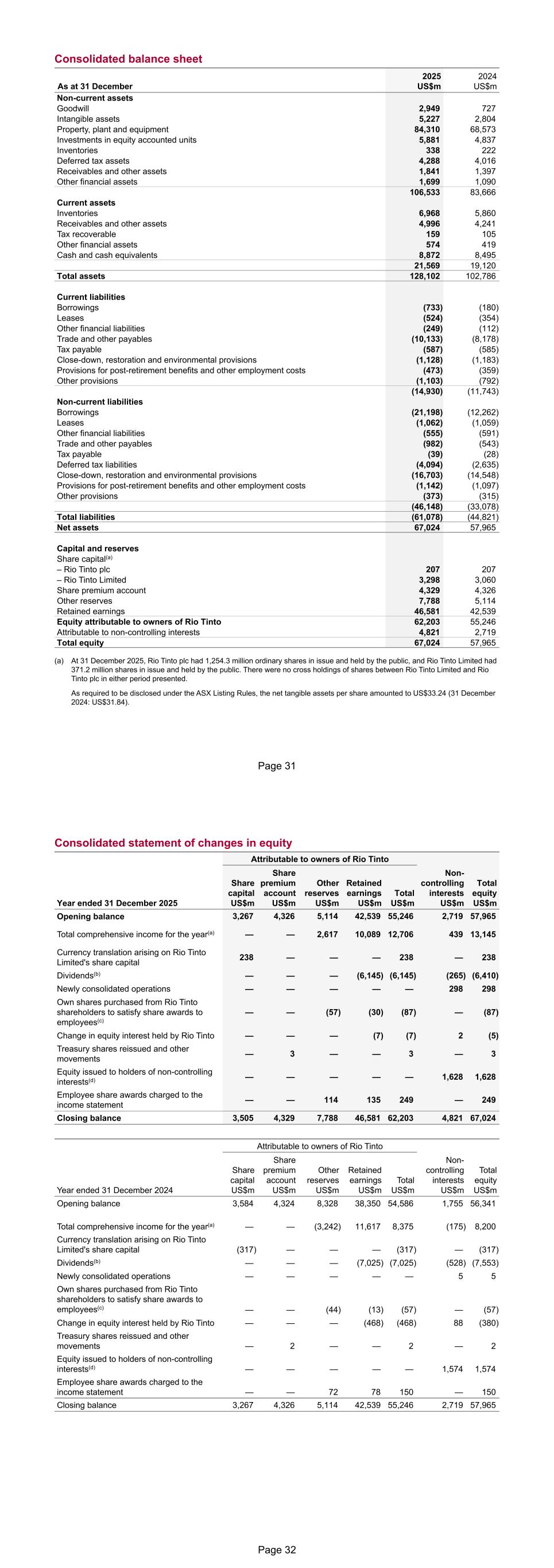 Consolidated balance sheet As at 31 December 2025 US$m 2024 US$m Non-current assets Goodwill 2,949 727 Intangible assets 5,227 2,804 Property, plant and equipment 84,310 68,573 Investments in equity accounted units 5,881 4,837 Inventories 338 222 Deferred tax assets 4,288 4,016 Receivables and other assets 1,841 1,397 Other financial assets 1,699 1,090 106,533 83,666 Current assets Inventories 6,968 5,860 Receivables and other assets 4,996 4,241 Tax recoverable 159 105 Other financial assets 574 419 Cash and cash equivalents 8,872 8,495 21,569 19,120 Total assets 128,102 102,786 Current liabilities Borrowings (733) (180) Leases (524) (354) Other financial liabilities (249) (112) Trade and other payables (10,133) (8,178) Tax payable (587) (585) Close-down, restoration and environmental provisions (1,128) (1,183) Provisions for post-retirement benefits and other employment costs (473) (359) Other provisions (1,103) (792) (14,930) (11,743) Non-current liabilities Borrowings (21,198) (12,262) Leases (1,062) (1,059) Other financial liabilities (555) (591) Trade and other payables (982) (543) Tax payable (39) (28) Deferred tax liabilities (4,094) (2,635) Close-down, restoration and environmental provisions (16,703) (14,548) Provisions for post-retirement benefits and other employment costs (1,142) (1,097) Other provisions (373) (315) (46,148) (33,078) Total liabilities (61,078) (44,821) Net assets 67,024 57,965 Capital and reserves Share capital(a) – Rio Tinto plc 207 207 – Rio Tinto Limited 3,298 3,060 Share premium account 4,329 4,326 Other reserves 7,788 5,114 Retained earnings 46,581 42,539 Equity attributable to owners of Rio Tinto 62,203 55,246 Attributable to non-controlling interests 4,821 2,719 Total equity 67,024 57,965 (a) At 31 December 2025, Rio Tinto plc had 1,254.3 million ordinary shares in issue and held by the public, and Rio Tinto Limited had 371.2 million shares in issue and held by the public. There were no cross holdings of shares between Rio Tinto Limited and Rio Tinto plc in either period presented. As required to be disclosed under the ASX Listing Rules, the net tangible assets per share amounted to US$33.24 (31 December 2024: US$31.84). Page 31 Consolidated statement of changes in equity Year ended 31 December 2025 Attributable to owners of Rio Tinto Share capital US$m Share premium account US$m Other reserves US$m Retained earnings US$m Total US$m Non- controlling interests US$m Total equity US$m Opening balance 3,267 4,326 5,114 42,539 55,246 2,719 57,965 Total comprehensive income for the year(a) — — 2,617 10,089 12,706 439 13,145 Currency translation arising on Rio Tinto Limited's share capital 238 — — — 238 — 238 Dividends(b) — — — (6,145) (6,145) (265) (6,410) Newly consolidated operations — — — — — 298 298 Own shares purchased from Rio Tinto shareholders to satisfy share awards to employees(c) — — (57) (30) (87) — (87) Change in equity interest held by Rio Tinto — — — (7) (7) 2 (5) Treasury shares reissued and other movements — 3 — — 3 — 3 Equity issued to holders of non-controlling interests(d) — — — — — 1,628 1,628 Employee share awards charged to the income statement — — 114 135 249 — 249 Closing balance 3,505 4,329 7,788 46,581 62,203 4,821 67,024 Year ended 31 December 2024 Attributable to owners of Rio Tinto Share capital US$m Share premium account US$m Other reserves US$m Retained earnings US$m Total US$m Non- controlling interests US$m Total equity US$m Opening balance 3,584 4,324 8,328 38,350 54,586 1,755 56,341 Total comprehensive income for the year(a) — — (3,242) 11,617 8,375 (175) 8,200 Currency translation arising on Rio Tinto Limited's share capital (317) — — — (317) — (317) Dividends(b) — — — (7,025) (7,025) (528) (7,553) Newly consolidated operations — — — — — 5 5 Own shares purchased from Rio Tinto shareholders to satisfy share awards to employees(c) — — (44) (13) (57) — (57) Change in equity interest held by Rio Tinto — — — (468) (468) 88 (380) Treasury shares reissued and other movements — 2 — — 2 — 2 Equity issued to holders of non-controlling interests(d) — — — — — 1,574 1,574 Employee share awards charged to the income statement — — 72 78 150 — 150 Closing balance 3,267 4,326 5,114 42,539 55,246 2,719 57,965 Page 32